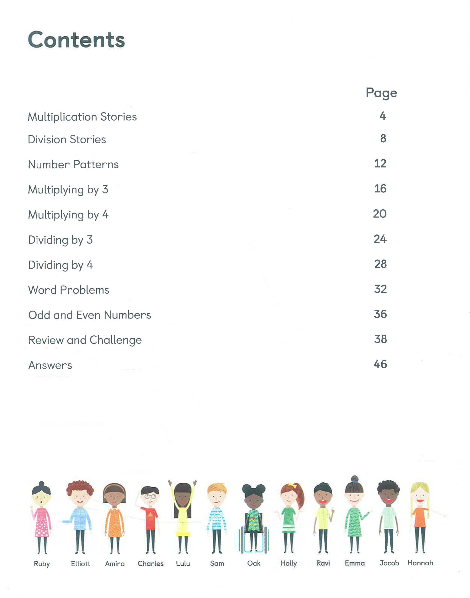 - Topics include multiplying by 3 and 4, different methods for multiplying and dividing, odd and even numbers.