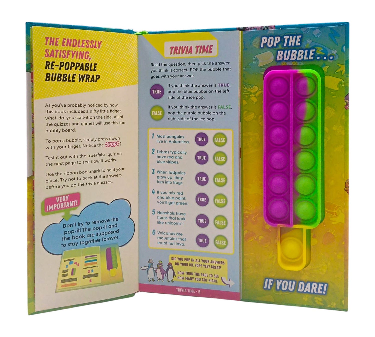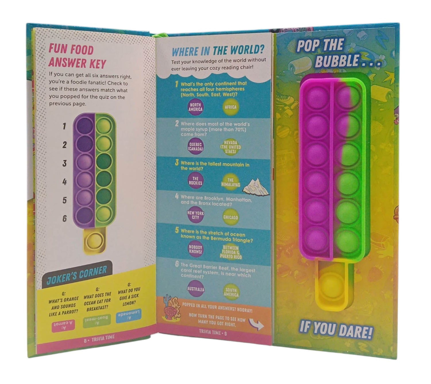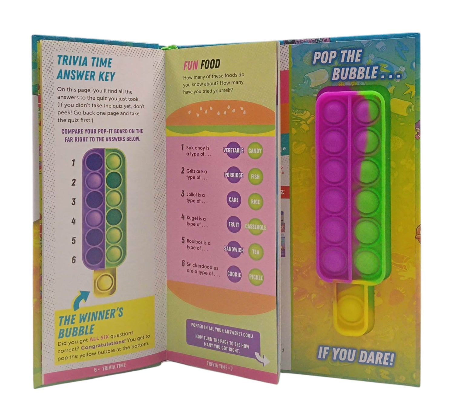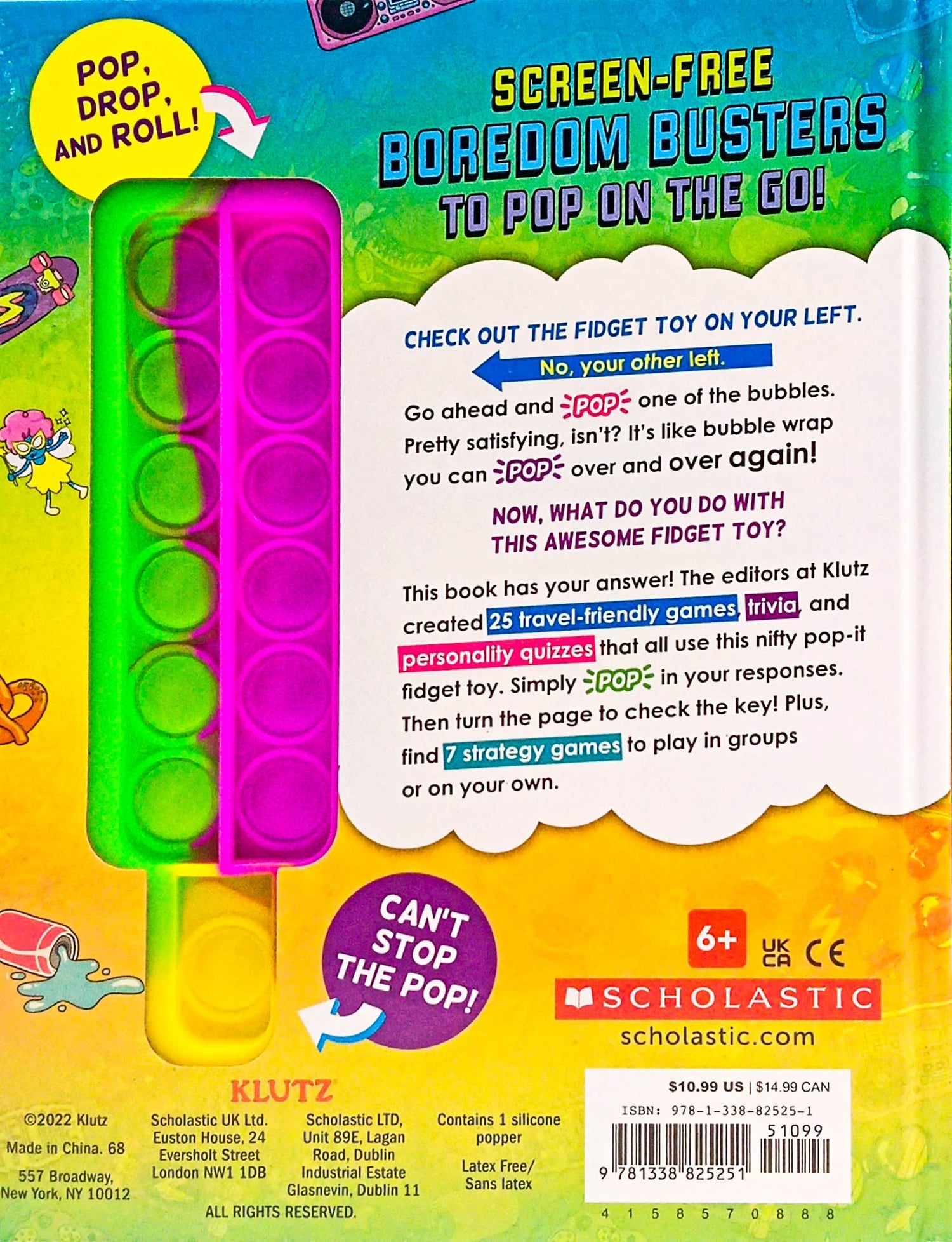 A brain-teaser twist on the sensational pop-it fidget toy! This boredom-busting book of games and activities is embedded with a pop-it fidget toy, also known as "endless bubble wrap." Chock-full of games, quizzes, trivia and more, readers will discover new ways to play with the stress-relieving doo-dad that creates a satisfying pop when you press the bubbles. Activities include tons of trivia sprinkled with humour. (Do you know what a fartlek is?Where is there a neighbourhood called Foggy Bottom?) Games for solo readers, pairs, and groups include strategy games, a twist on mancala, categories and more, plus silly personality questions offer something for everyone in a travel-friendly package. The pop-it fidget toy became an overnight sensation. But what can one DO with it? This activity book shows you how! Offers a range of complexity, from silly, humorous quizzes to mentally challenging strategy games. Travel-friendly format makes it easy to pop on the go!