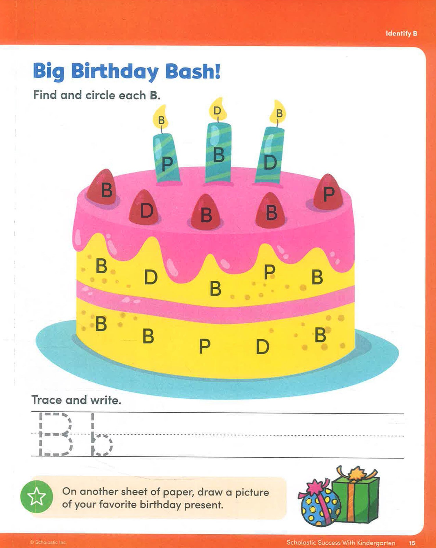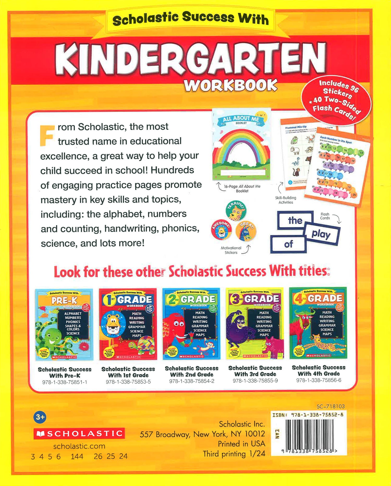From Scholastic, this is a kindergarten workbook that offers activities to help students with phonics, handwriting, the alphabet, colors, shapes, numbers and counting. It contains colorful illustrations and a full page of stickers that can be used as rewards for great work.