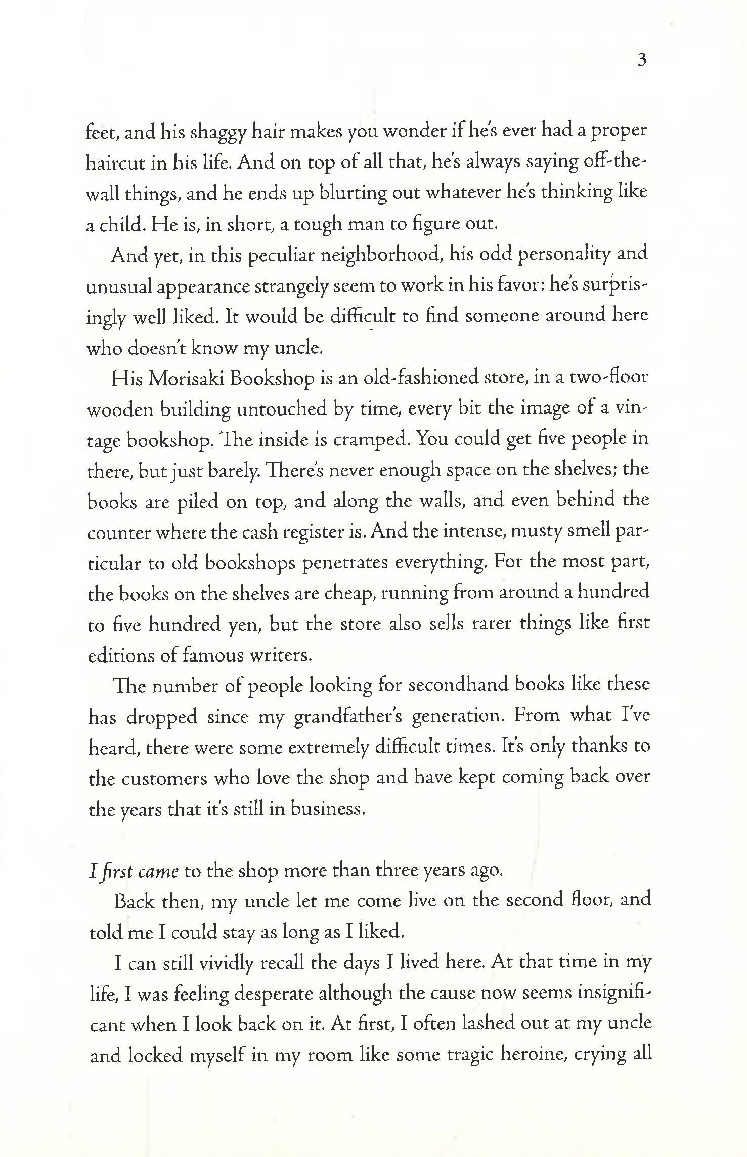 The Morisaki bookshop, a small family-run shop, is so packed with books that barely five people can fit inside. Books crowd the shelves and invade every corner of the floor; when a customer arrives, the owner, Satoru, immediately pops out from behind the counter. Recently, his wife Momoko has joined him, and often, in her free time after work, their niece Takako also helps out.