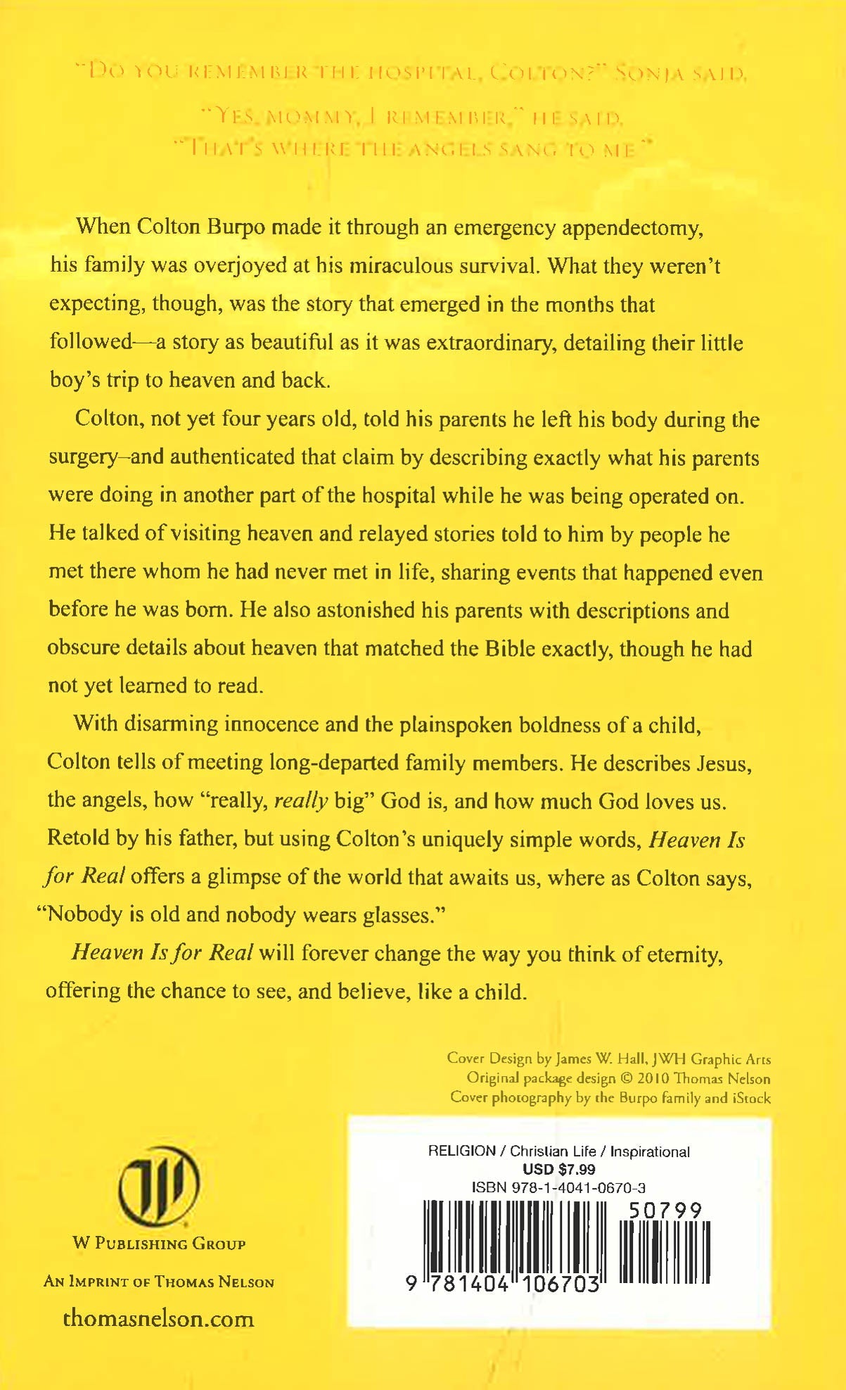 When Colton Burpo made it through an emergency appendectomy, his family was overjoyed at his miraculous survival. What they weren’t expecting, though, was the story that emerged in the months that followed—a story as beautiful as it was extraordinary, detailing their little boy’s trip to heaven and back.