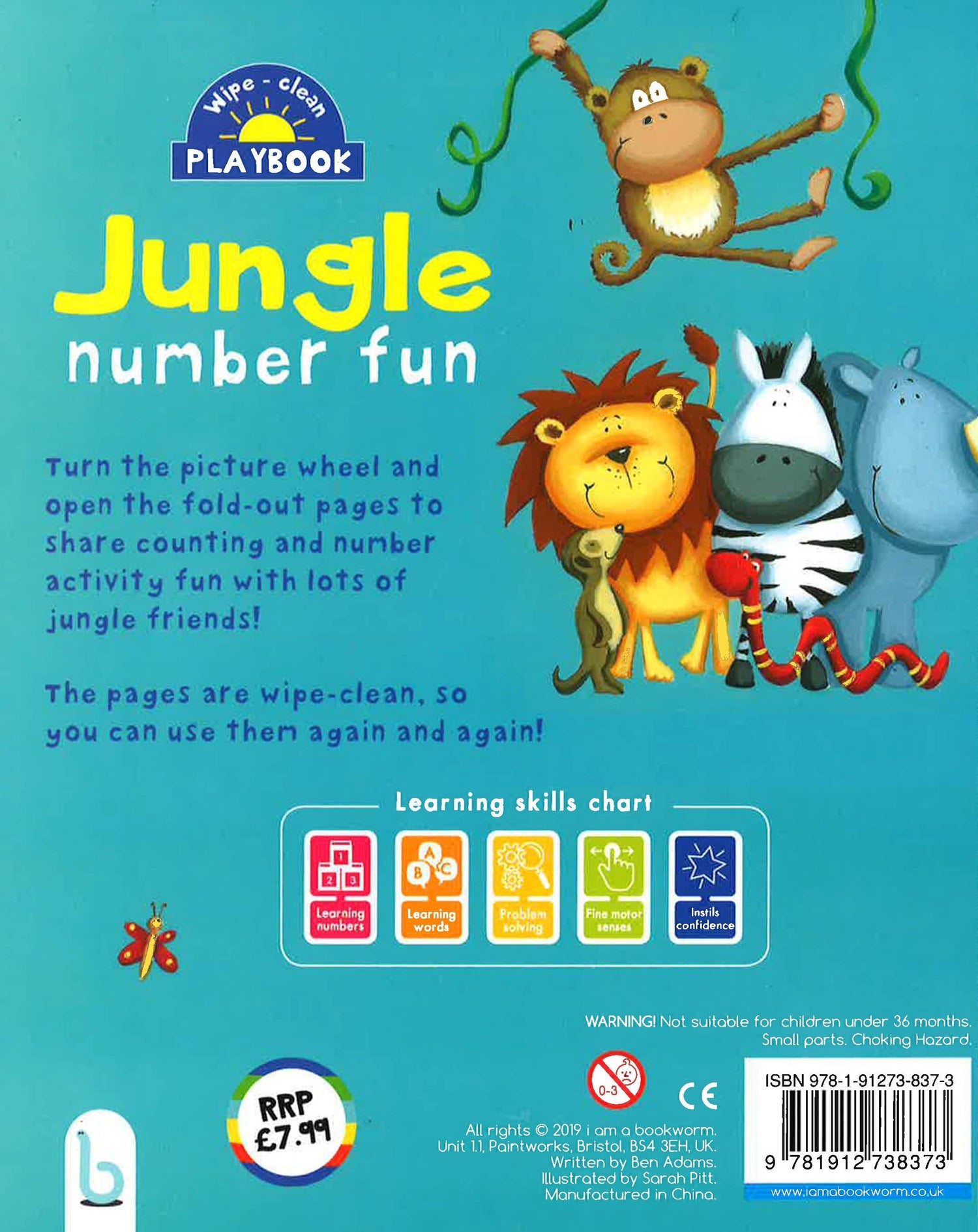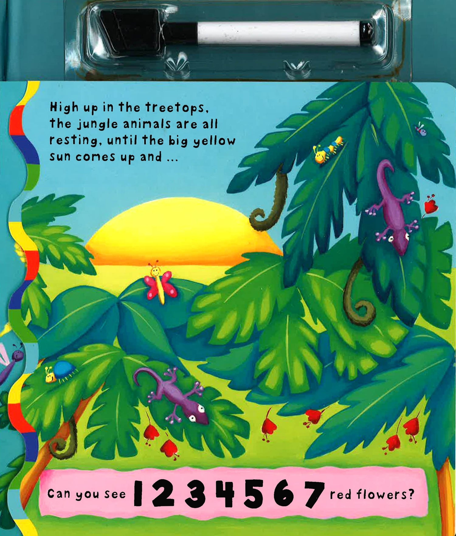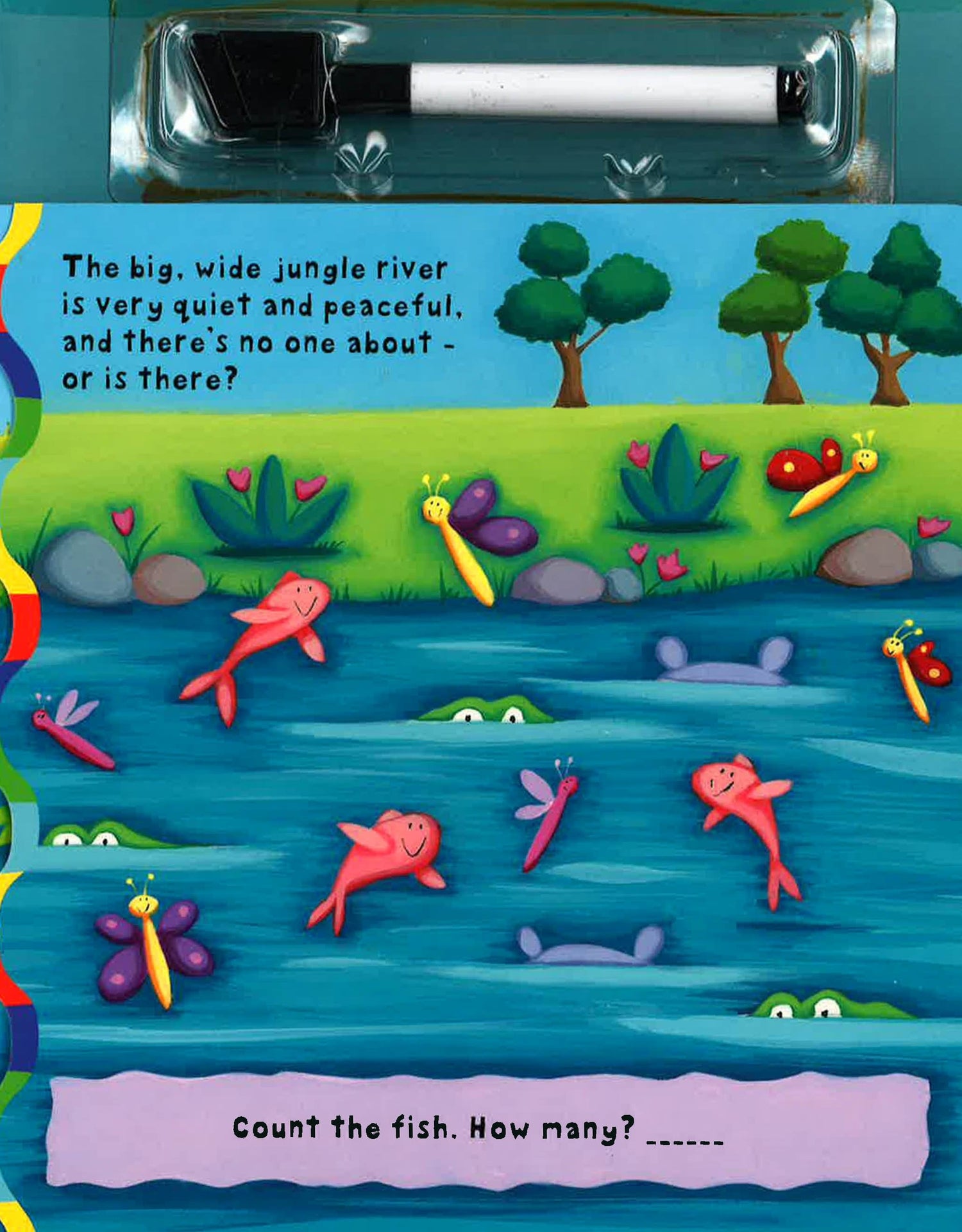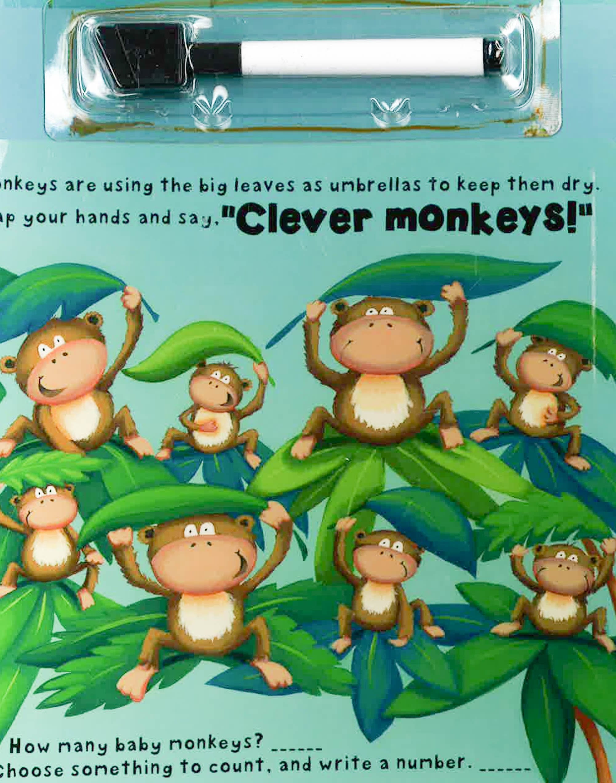 This attractive fun-to-learn board book for preschoolers comes with its own wipe-clean pen. It has a wheel that changes picture details on both the front cover and its reverse side, along with a fold-out feature on every right-hand page. Kids turn the wheel and open the fold-out pages to identify numbers. They count jungle birds, meerkats, fish, lions, and many other animals. And when they lift the picture flaps they find still more animals to count. Every big and bright illustration is filled with familiar objects and animals for kids to name and questions for them to answer. They write in their answers by using the wipe-clean pen. Then they can use the felt eraser attached to the pen to wipe the pages clean--and use them over and over again.