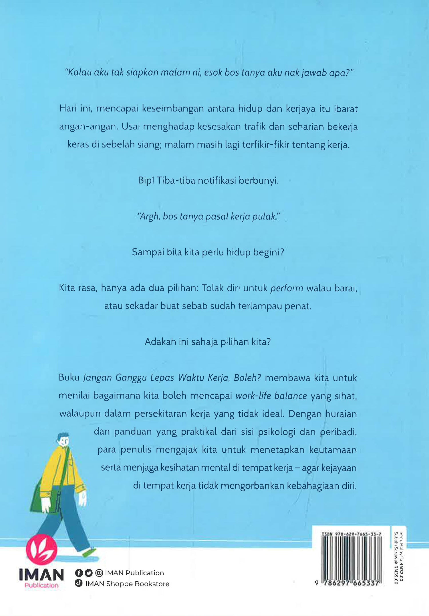 Buku Jangan Ganggu Lepas Waktu Kerja, Boleh? membawa kita untuk menilai bagaimana kita boleh mencapai work-life balance yang sihat, walaupun dalam persekitaran kerja yang tidak ideal. Dengan huraian dan panduan yang praktikal dari sisi psikologi dan peribadi, para penulis mengajak kita untuk menetapkan keutamaan serta menjaga kesihatan mental di tempat kerja – agar kejayaan di tempat kerja tidak mengorbankan kebahagiaan diri.