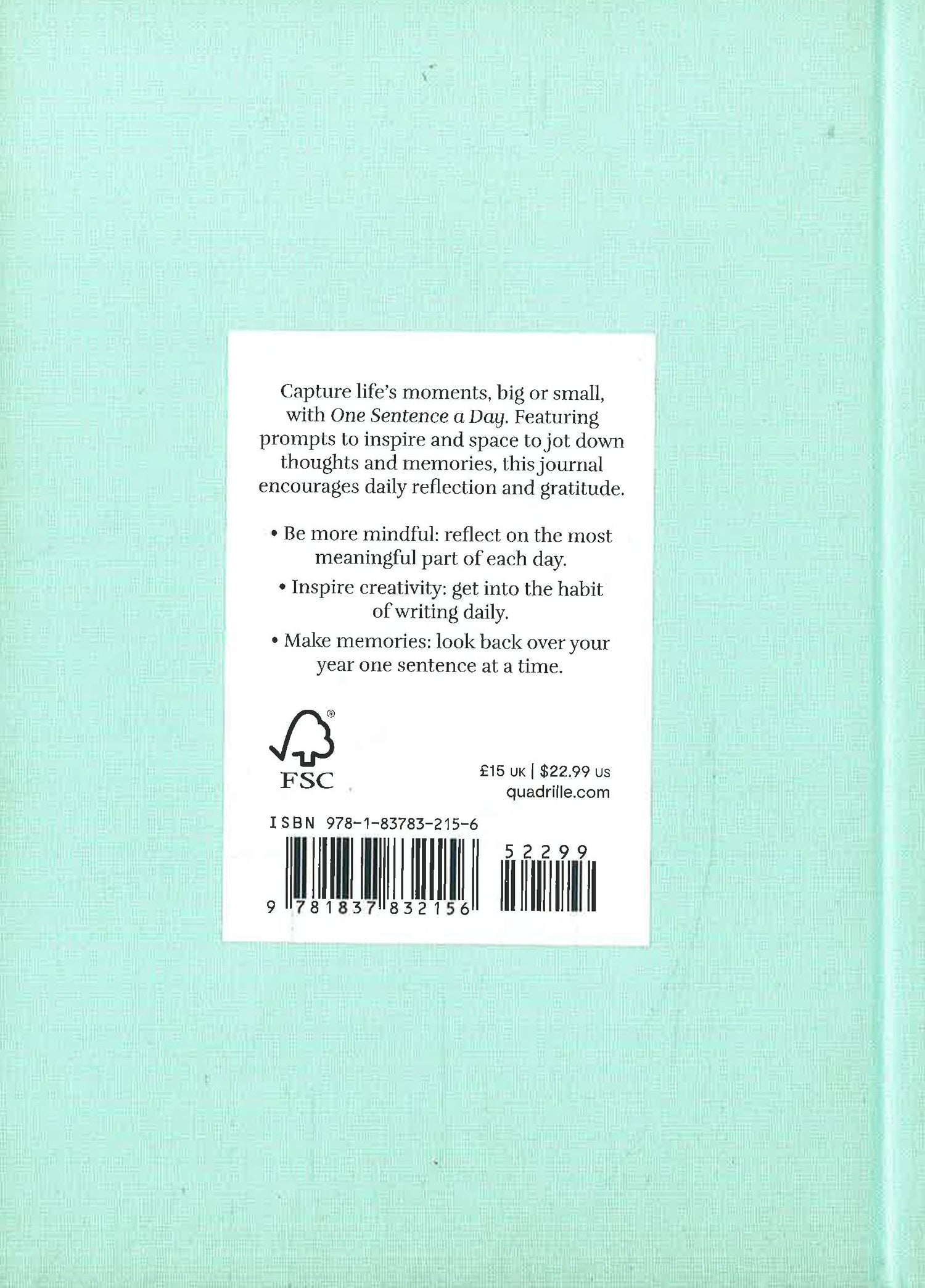 Whether you journal in the morning or evening, it will only take a couple of minutes to capture each day. Finding the most meaningful moment of each day and jotting it down; whether it's a conversation, a lyric, a line from a book or even an image, will help you build a bank full of memories which you can rediscover for years to come. One Sentence a Day will help you to relive these forgotten memories and give you an instant pick me-up and to help you appreciate the significance of everyday moments of happiness.