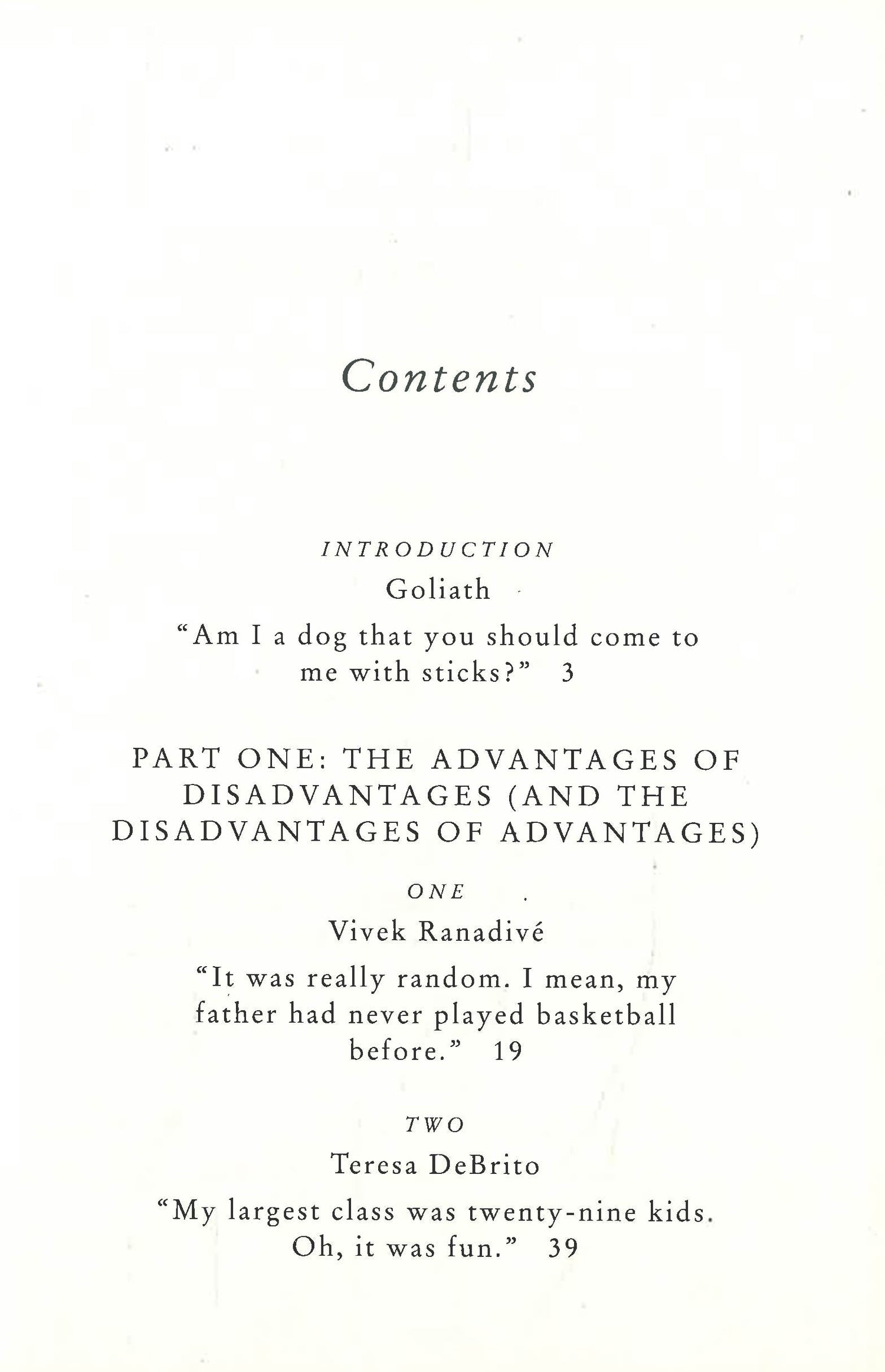 Gladwell begins with the real story of what happened between the giant and the shepherd boy those many years ago. From there, David and Goliath examines Northern Ireland's Troubles, the minds of cancer researchers and civil rights leaders, murder and the high costs of revenge, and the dynamics of successful and unsuccessful classrooms—all to demonstrate how much of what is beautiful and important in the world arises from what looks like suffering and adversity.