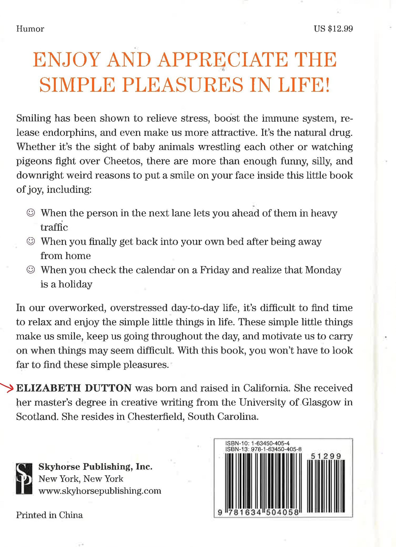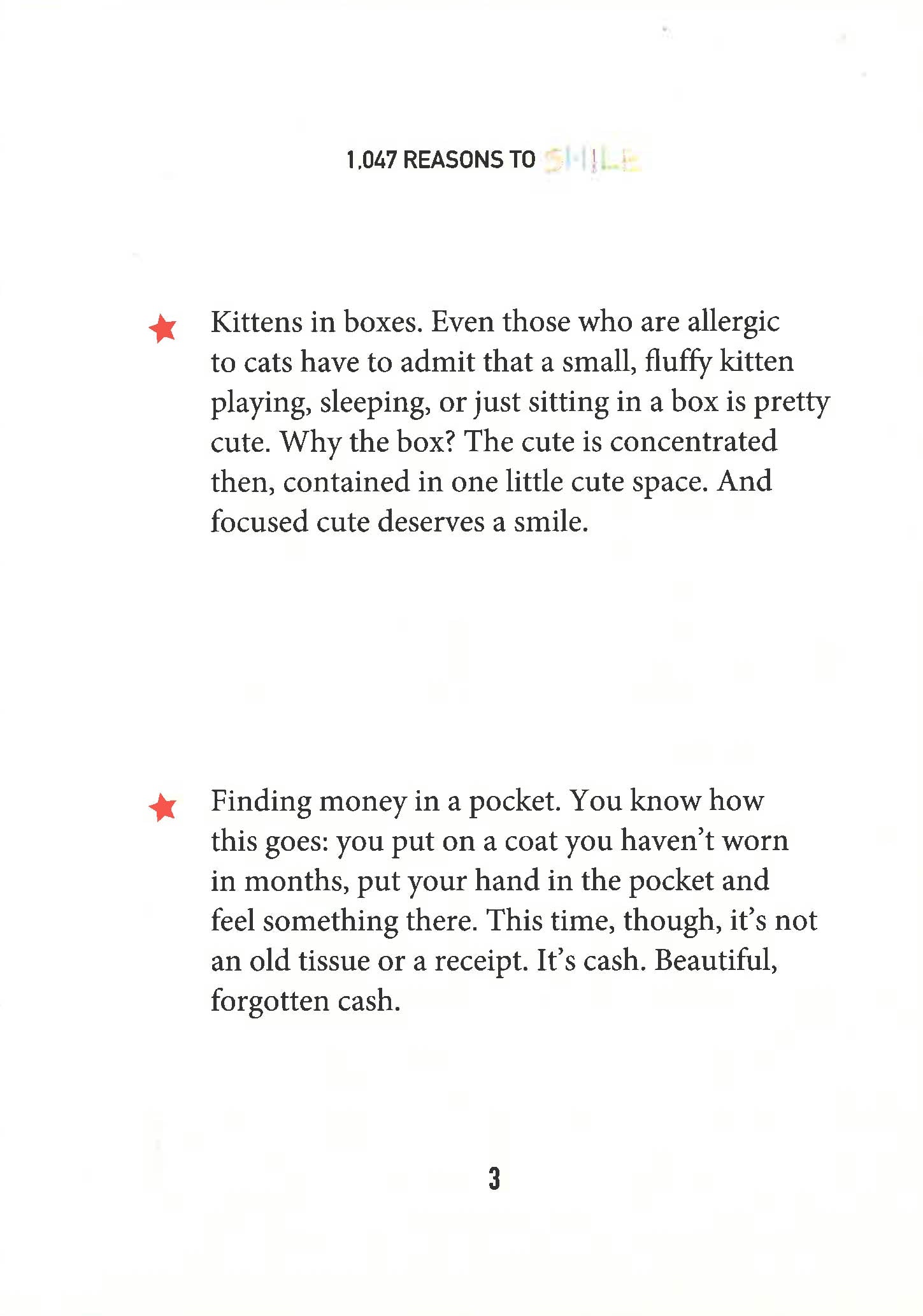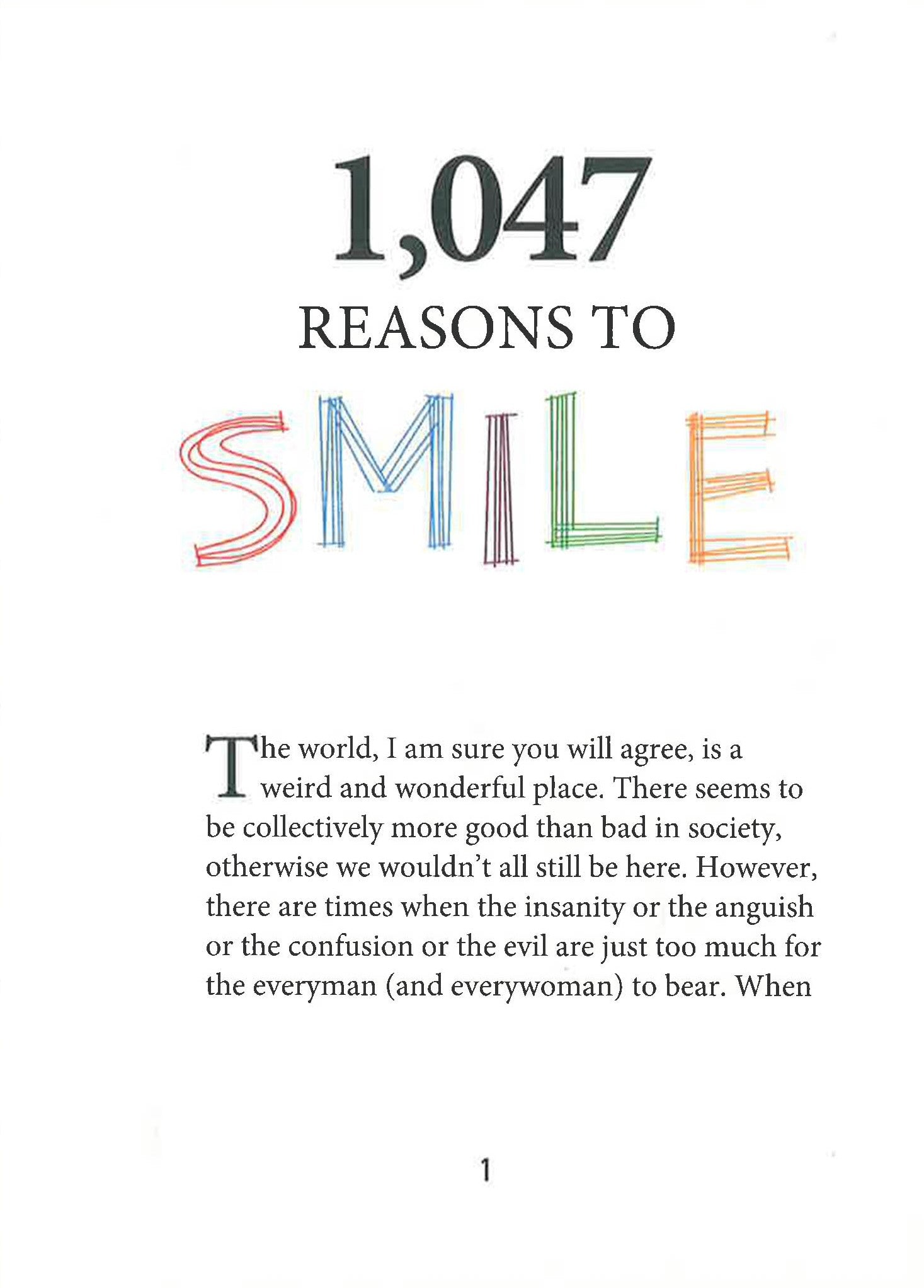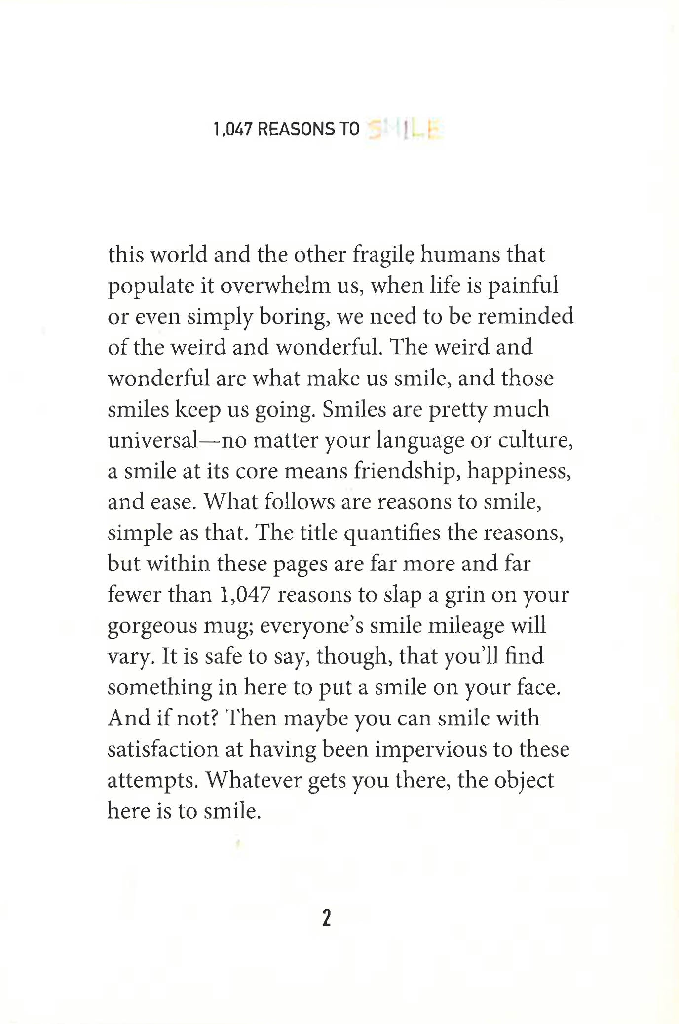 Smiling has been shown to relieve stress, boost the immune system, release endorphins, and even make us more attractive. It's the natural drug. Whether it's the sight of baby animals wrestling each other or watching pigeons fight over a Cheeto, there are more than enough funny, silly, and downright weird reasons to put a smile on your face inside this little book of joy, including: When the person in the next lane lets you ahead of them in heavy traffic When you finally get back into your own bed after being away from home You check the calendar on a Friday and realize that Monday is a holiday In our overworked, overstressed day to day life, it's difficult to find time to relax and enjoy the simple, little things in life. These simple little things that make us smile keep us going throughout the day and motivate us to carry on when things may seem difficult. With this book, you won't have to look far to find these simple pleasures. So put down the Xanx and grab yourself a copy of 1,047 Reasons to Smile.