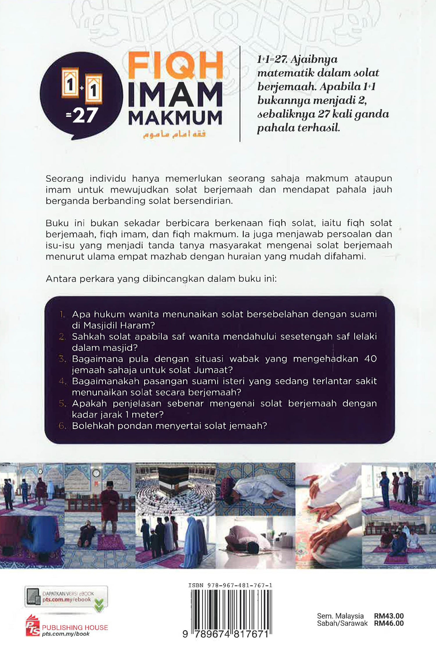 Buku ini bukan sekadar membicara berkenaan fiqh solat, iaitu fiqh solat berjemaah, fiqh imam, dan fiqh makmum. Ia juga menjawab persoalan dan isu-isu yang menjadi tanda tanya masyarakat mengenai solat berjemaah menurut ulama empat mazhab dengan huraian yang mudah difahami.