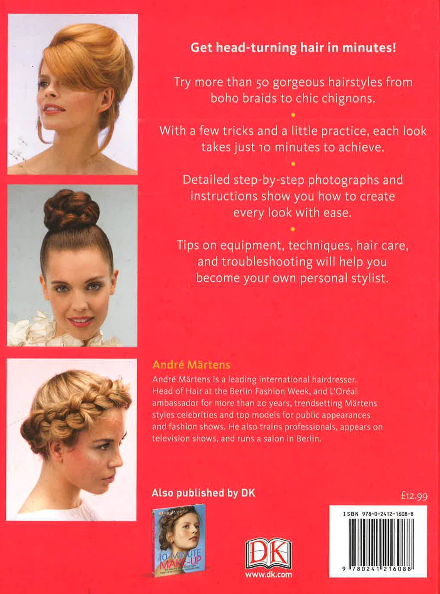 Create 50 gorgeous hairstyles, from casual braids to the elegant beehive, by Berlin-based top stylist Andre Martens. Following the visual step-by-step instructions by a top stylist, it is really easy to take minutes to be beautiful. Start with basic techniques, like braiding, waves and volume, and with a little practice you can change your look every day. Learn everything about hair care, tools and products from detailed extra instructions and become your own personal stylist.
