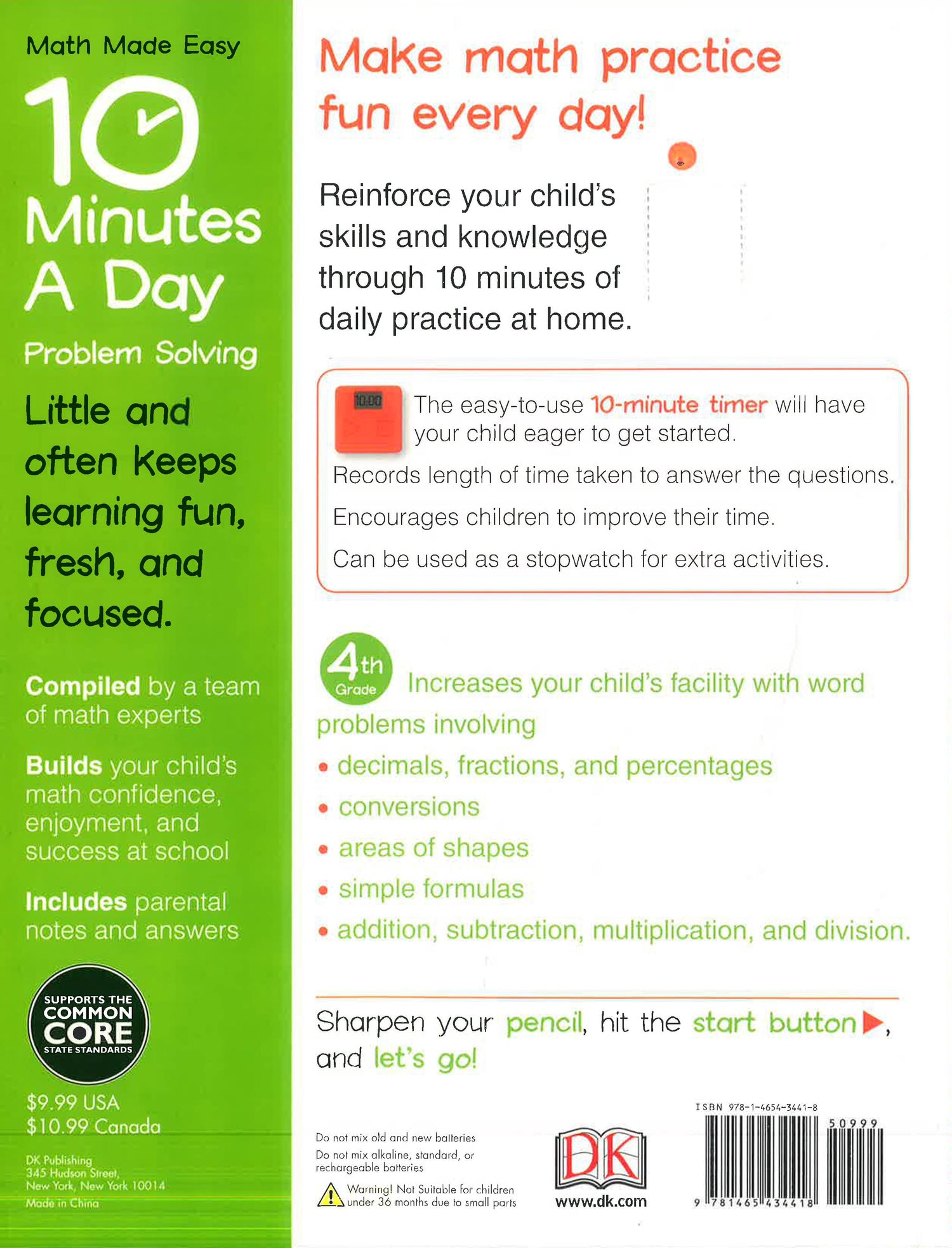 10 Minutes a Day is a series of home-learning workbooks, closely linked to school curricula, that helps make learning easy…and so much fun. It provides quick exercises in math (fractions, decimals, and problem solving) and language and writing skills (spelling, vocabulary, and phonics) for children aged 3-11 years. Using the attached 10-minute timer, these workbooks are ideal for children during "time-to-fill" moments at home and are based on the effective little-and-often learning strategy.
