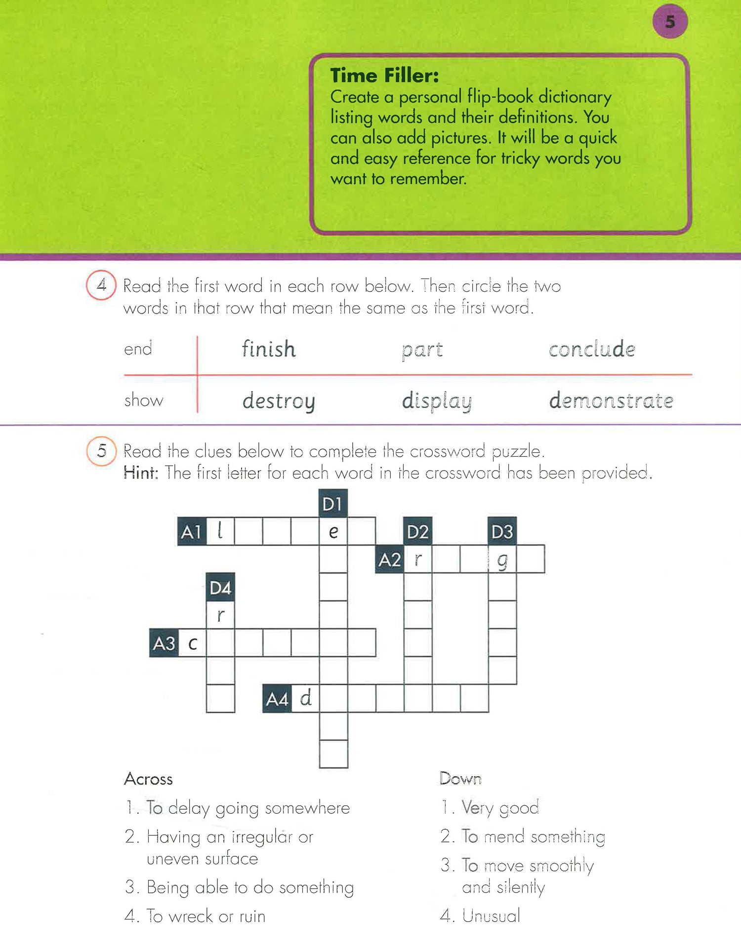 This workbook includes activities on synonyms, word meanings, and verb endings. The parents' notes section gives the answers, explains common pitfalls and gives guidance on how to avoid them.