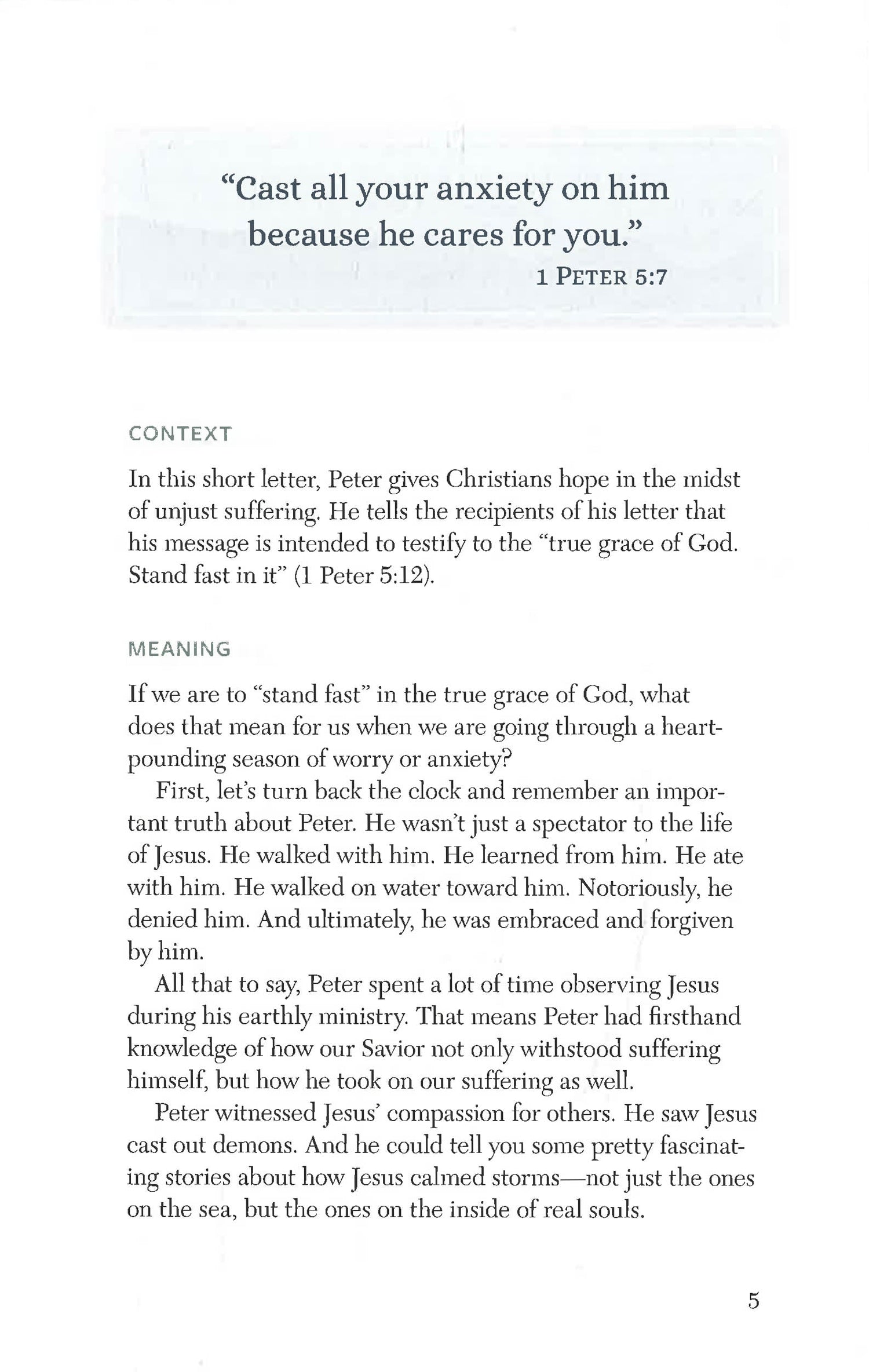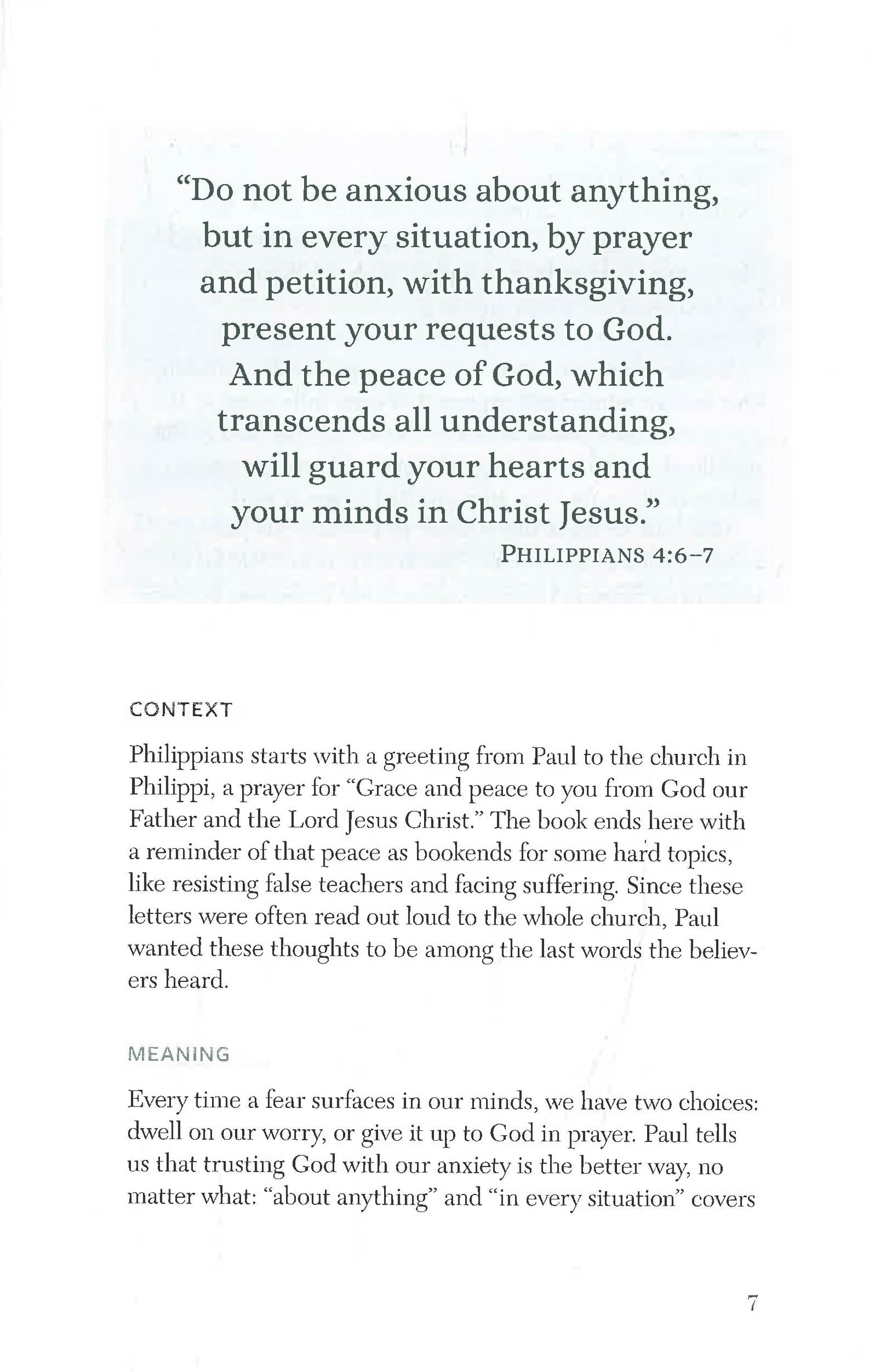 Everyone struggles with worry. You may be wrestling with everyday fears about your relationships or your finances. Or perhaps you're dealing with a life-and-death decision or paralyzing emotions. Regardless of the reasons for your worries, or the degree to which you feel them, God cares. He wants you to live a life of peace and hope. He wants to give you freedom. This book will explain and apply 100 key verses from God's Word to help you overcome your worries and anxieties. The list includes Scriptures across the entire Bible, carefully selected for their significance and helpfulness to the Christian life. Each of the 100 entries will contain · the Bible verse · a brief explanation of the verse's context in Scripture · commentary on the verse's meaning · an application for the reader Don't be enslaved to your worries and anxieties, but instead dig into God's promises, provision, and wise counsel. And most of all, discover the peace and comfort that comes with understanding that he loves you more than you'll ever know.