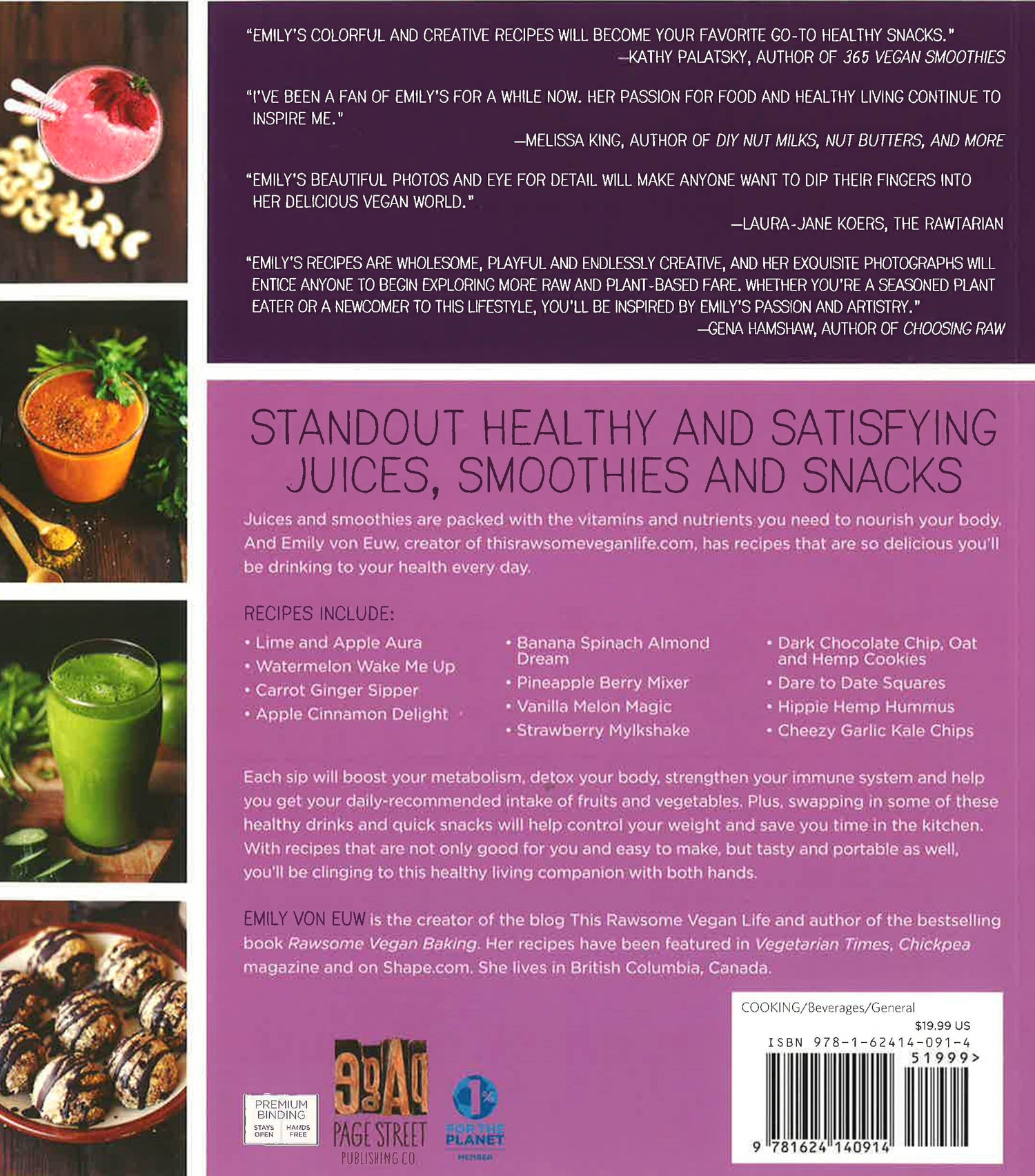 Juices and smoothies are packed with the vitamins and nutrients you need to nourish your body. And Emily von Euw, creator of thisrawsomeveganlife.com, has recipes that are so delicious youll be drinking to your health every day. Emilys recipes include Cilantro Ginger Green Smoothie, Pineapple Peppermint Juice, Chocolate Berry Protein Smoothie and Super Food Energy Bars with Cacao. Depending on the recipe you can boost your metabolism, detox your body, strengthen your immune system or get your daily-recommended intake of fruits and vegetables. With recipes that are not only good for you and easy to make, but tasty and satisfying as well, youll be clinging to this healthy living companion with both hands.