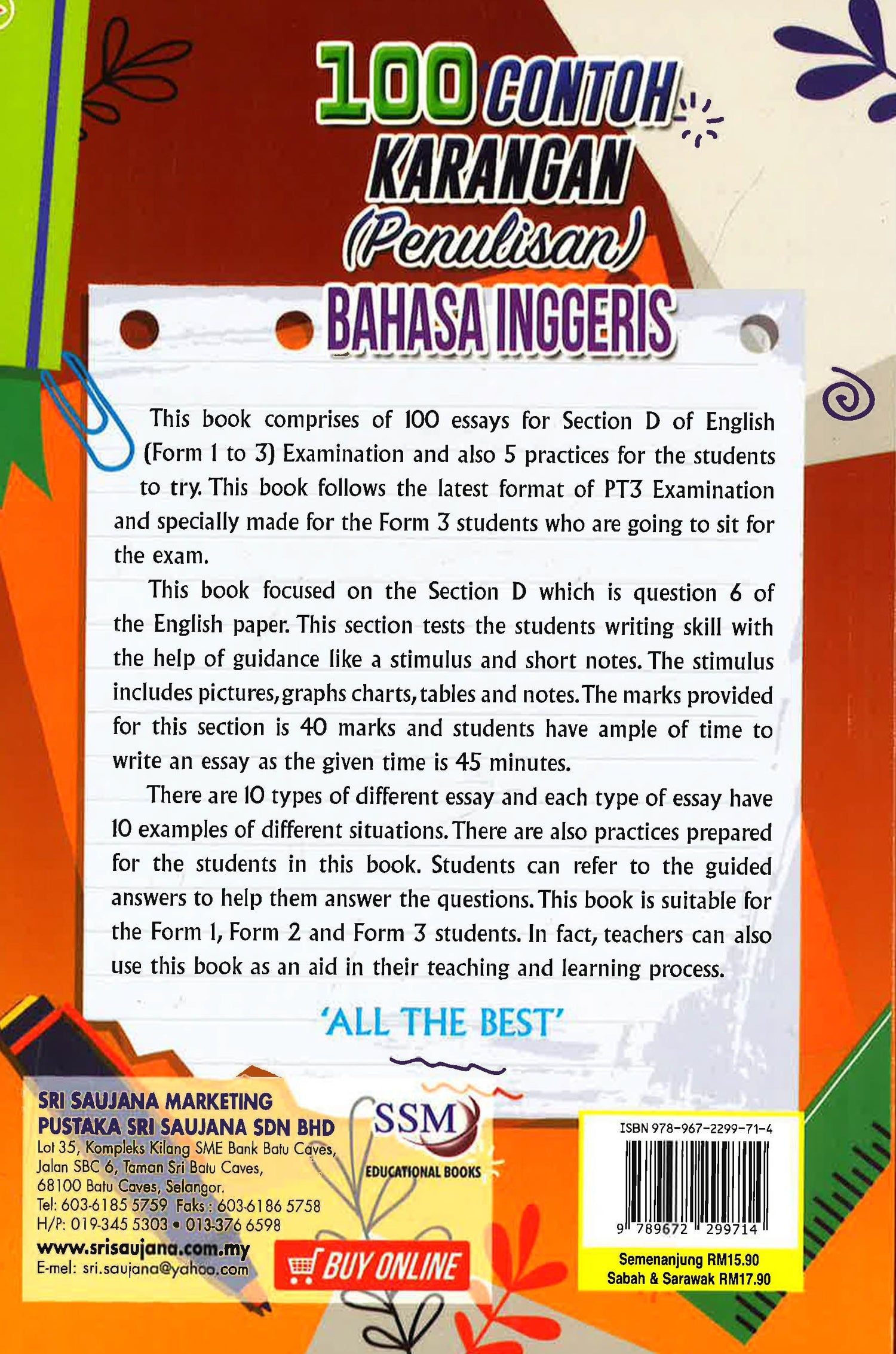 This book comprises of 100 essays for Section D of English (Form 1 to 3) Examination and also 5 practices for the students to try. This book follows the latest format of PT3 Examination and specially made for the Form 3 students who are going to sit for the exam.