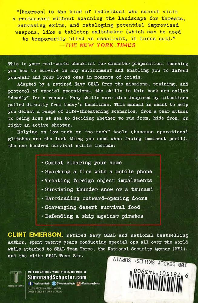 These 100 skills, adapted for civilians from actual field experiences of Special Forces operations, offer a complete hands-on and practical guide to help you survive in the wild no matter the climate or terrain; be prepared for any crisis; and have the critical life-saving knowledge for staying safe in any hostile environment or disaster. 100 Deadly Skills: Survival Edition is what you need for today's world, combining survival hacks developed on the battlefield with the low-tech tools you have on hand. This book is your essential prep manual, from securing shelter, building fire, finding food, and navigating back to civilization no matter the environment to thinking like a special forces solider so that you can survive a hostage situation, an active shooter, a suicide bomber, or a terrorist threat on the subway, and even apply trauma medicine as a first responder. Full of specific scenarios to help you get in the mind-set of survival, 100 Deadly Skills: Survival Edition is better than a Swiss Army knife whether you're lost at sea, forced to land a plane, fighting off a bear, or deciding whether to run, hide, or fight. Next to each skill are easy-to-grasp detailed illustrations, because when you need to survive the apocalypse, you don't have time for complicated instructions. *This book may have remainder mark*