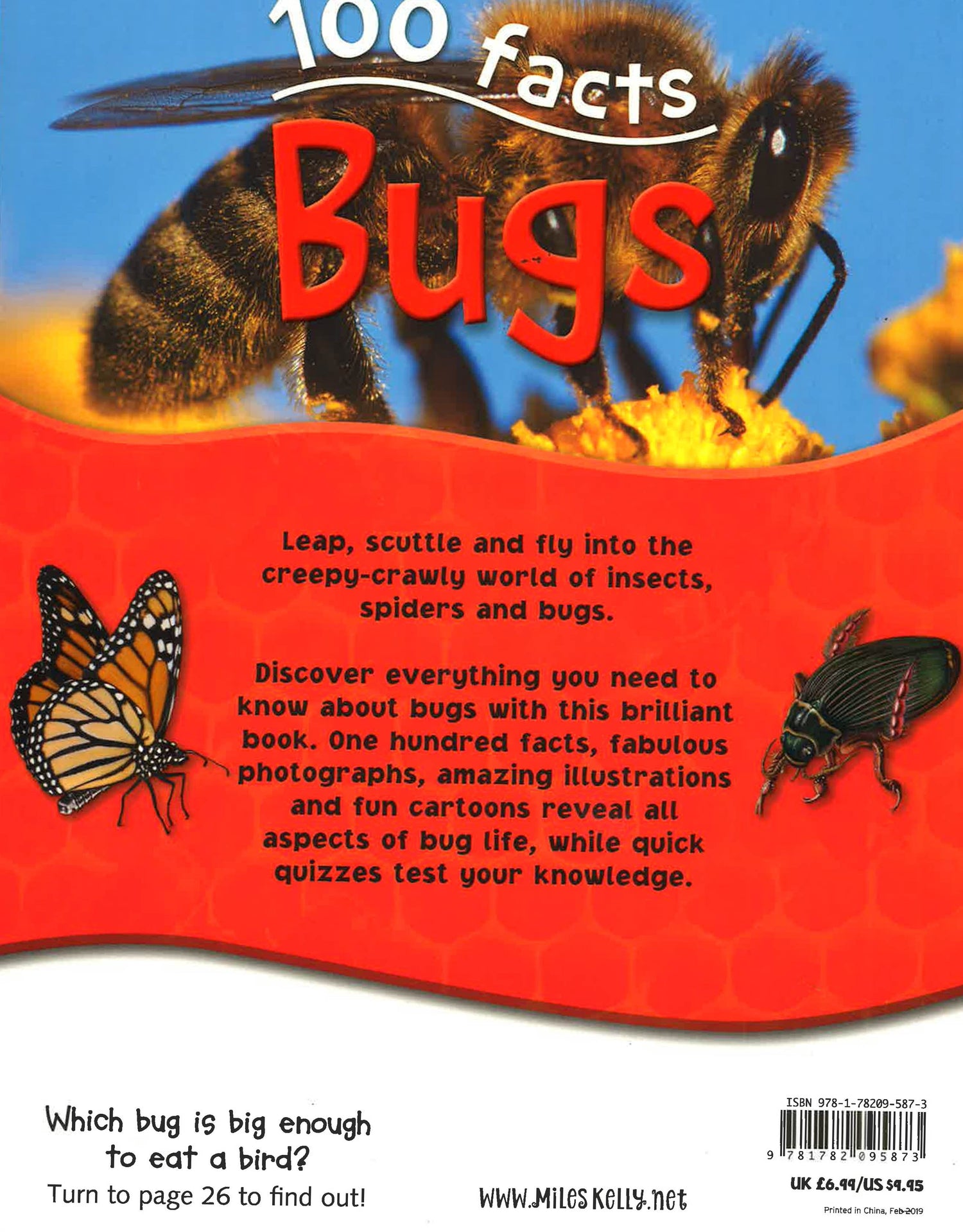 100 Facts Bugs is bursting with exactly 100 amazing facts, fascinating images and fun activities to help children aged 6-10 years learn everything they need to know about insects and spiders. - Simple activities for your child to understand more about how insects live.- Full-page images provide the 'wow' factor when reading new information.- Labelled photos to show the key features of insects and arachnids. Synopsis - Product details100 Facts Bugs contains key topics about creepy crawlies in concise numbered facts. Each fact is accompanied by fantastic illustrations and photographs, which add visual meaning to the information for kids. This is an ideal first look at insects books for kids aged 6-10 years. Topics covered in 100 Facts Bugs: - How to identify different species and which is the most widespread.- Special hunting and survival tactics such as camouflage. - The most deadly and dangerous bugs in the world. 'I don't believe it' fascinating facts: - Courtship is a dangerous time for the male praying mantis. The female is much bigger than the male and, as soon as they have mated, she may eat him!- Ants look after aphids and milk them like cows! They stroke the aphids to obtain a sugary liquid called honeydew, which the ants sip to get energy.- The name 'tarantula' was first given to a type of wolf spider from Europe. Activities to make learning accessible and interactive: - Quiz question: Which part of the firefly glows in the dark?- Investigate how light a pondskater is by using a bowl of water and different objects.- Make a list of how many insects you spot in a day.
