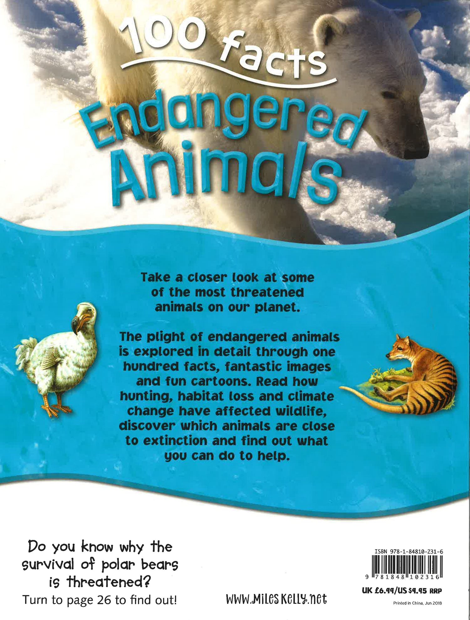 100 Facts Endangered Animals is bursting with exactly 100 mind-blowing facts, awesome images and fun activities to help children aged 6-10 years learn everything they need to know about the most threatened animals on our planet. Concise text explains the key facts to children in a clear way.- Numbered facts help your child to track their progress and feel a sense of achievement.- Comprehensive index allows children at key stage to practise locating the information they are searching for. 100 Facts Endangered Animals covers key endangered animals facts in easily-digestible, numbered paragraphs. Every page features detailed illustrations and colourful photographs that bring the text to life for kids aged 6-10 years. Topics covered in 100 Facts Endangered Animals: Animal species that are already extinct and those that were too late to save- Natural and human causes of endangering animals Conservation campaigns for animals under the most threat 'I don't believe it' fascinating facts: The Bermuda petrel was thought to be extinct for over 300 years until a breeding group was discovered on some coastal rocks in 1951.- About 100 years ago there were more than 100,000 tigers. Now there are fewer than 5000 in the wild.- In 2005, a new kind of monkey, the highland mangabey, was discovered in Africa. At the same time it became one of the rarest, most threatened of all animal species. Activities to make learning accessible and interactive.