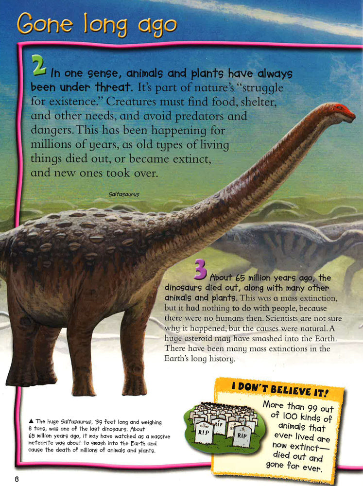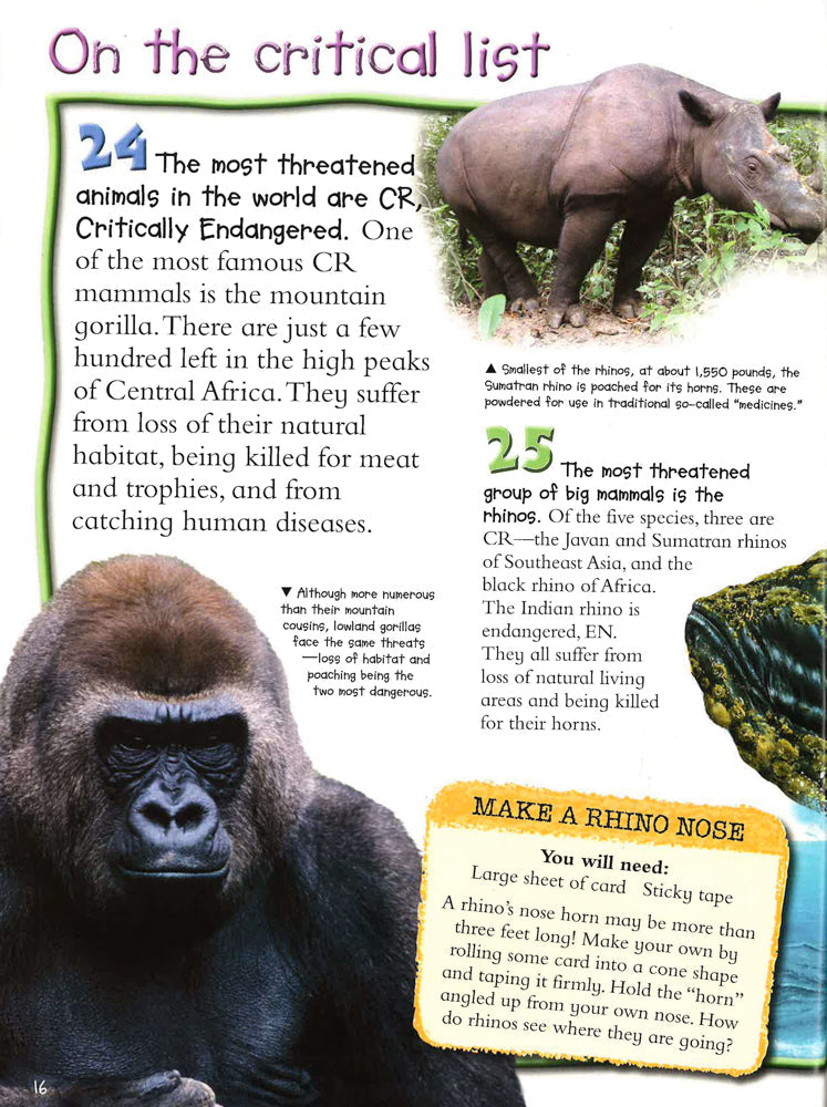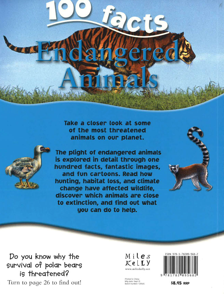 The plight of endangered animals is explored in detail through one hundred facts, fantastic images, and fun cartoons. Read how hunting, habitat loss, and climate change have affected wildlife, discover which animals are close to extinction, and find out what you can do to help.