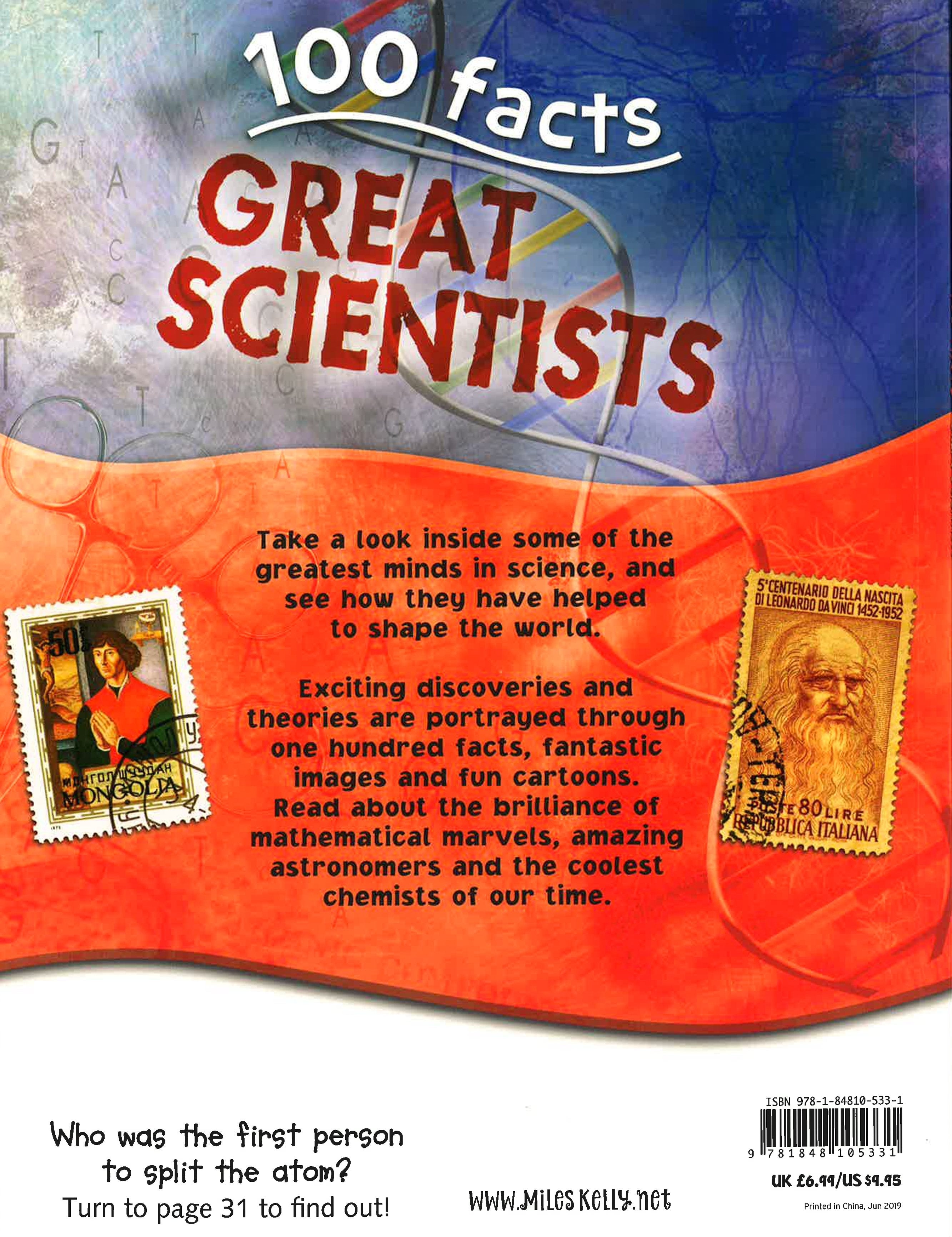 100 Facts Great Scientists is the ultimate science book for children! Bursting with exactly 100 amazing facts, fascinating images and fun activities, kids will learn everything they need to know about the greatest minds in science. 100 Facts Great Scientists contains key topics about scientific discoveries and theories with concise numbered facts. Each fact is accompanied by beautiful illustrations and photographs, which add visual meaning to the information for kids. Essential topics covered in 100 Facts Great Scientists: - The history of science and its religious links- Famous scientists and their hypotheses such as Isaac Newton and his theory of gravity- Modern technology and innovations Examples of 'I don't believe it' fascinating facts: - Catholic church leaders were so upset when Galileo said Earth goes around the Sun, they arrested him. He was not officially forgiven until 1992.- There are thought to be millions of types of bacteria, but no one knew they existed until Leeuwenhoek saw them through his microscope.- Before people realized how dangerous it was, radium was added to products such as toothpaste and hair cream to give them a healthy glow. Activities to make learning accessible and interactive include: - Make a homemade fossil with a shell, some compressed fine sand and plaster or wall filler. Create a mould, pour in the plaster and let it set to create your fossil!