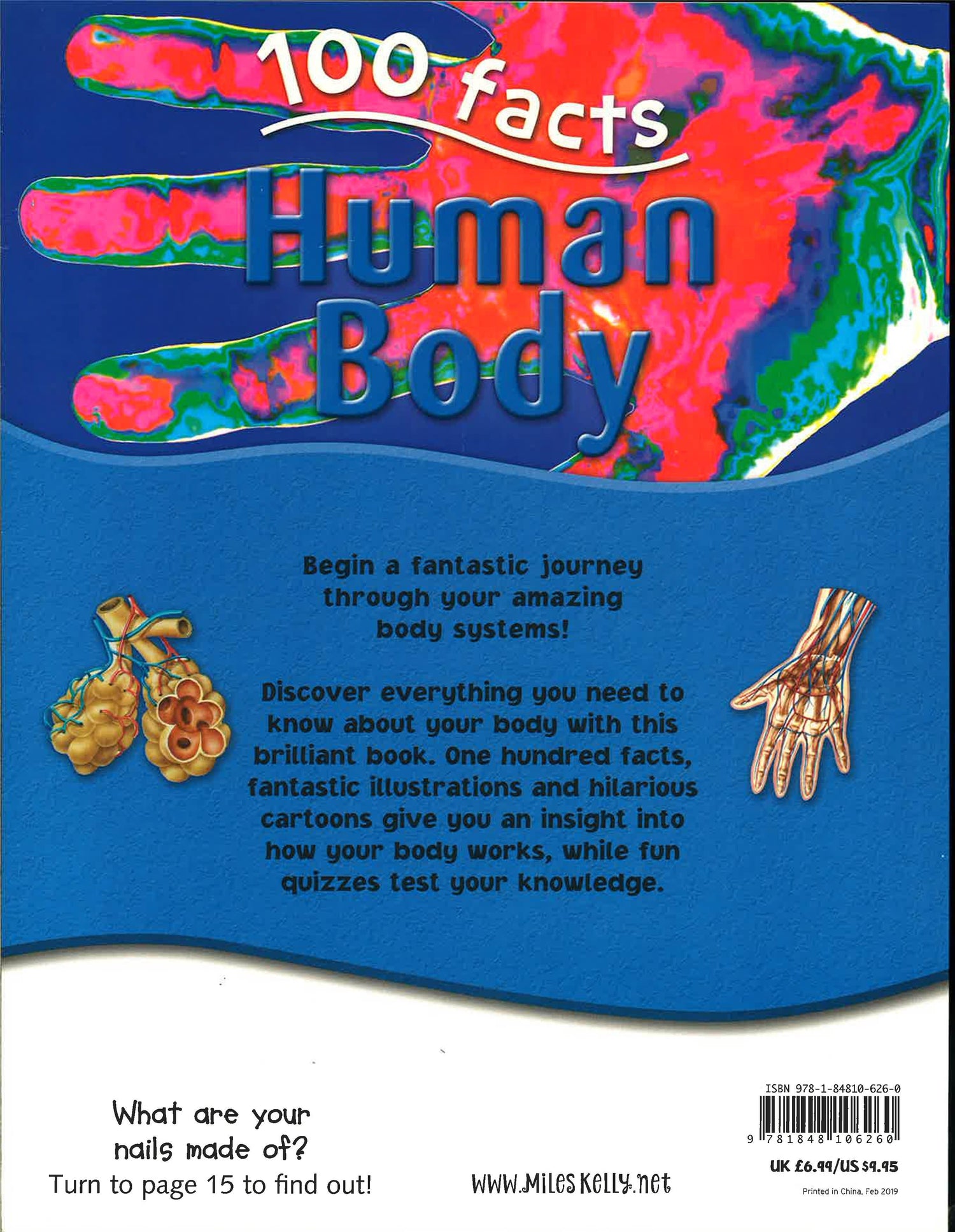 100 Facts Human Body book for kids is bursting with exactly 100 awesome facts, mind-blowing images and fun activities to help children learn everything they need to know about our amazing body systems. 100 Facts Human Body book for kids covers key topics about our anatomy in interesting numbered facts. Information is accompanied by amazing illustrations and photographs that put unbelievable facts into context for young learners. Essential topics covered in 100 Facts Human Body: Human development from a single cell to a full-sized adult Vital body parts and clever organ functions How to be fit and healthy Examples of 'I don't believe it' fascinating facts: The human body never grows as fast again as it does during the first weeks in the womb. If the body kept growing at that rate, every day for 50 years, it would be bigger than the largest mountain in the world! A scalp hair grows for up to five years before it falls out and gets replaced. The brain never sleeps! EEG waves show that it is almost as busy at night as when we are awake. It still controls heartbeat, breathing and digestion. Activities to make learning accessible and interactive include: Ask a friend to hold a ruler vertically and hover your hand near the bottom. When it is released, grab it as fast as you can. How fast did you react? Quiz question: Can you match these blood parts and vessels with their descriptions? Listen to your heartbeat with a homemade stethoscope made out of a plastic funnel, a tube, tracing paper and sticky-tape.