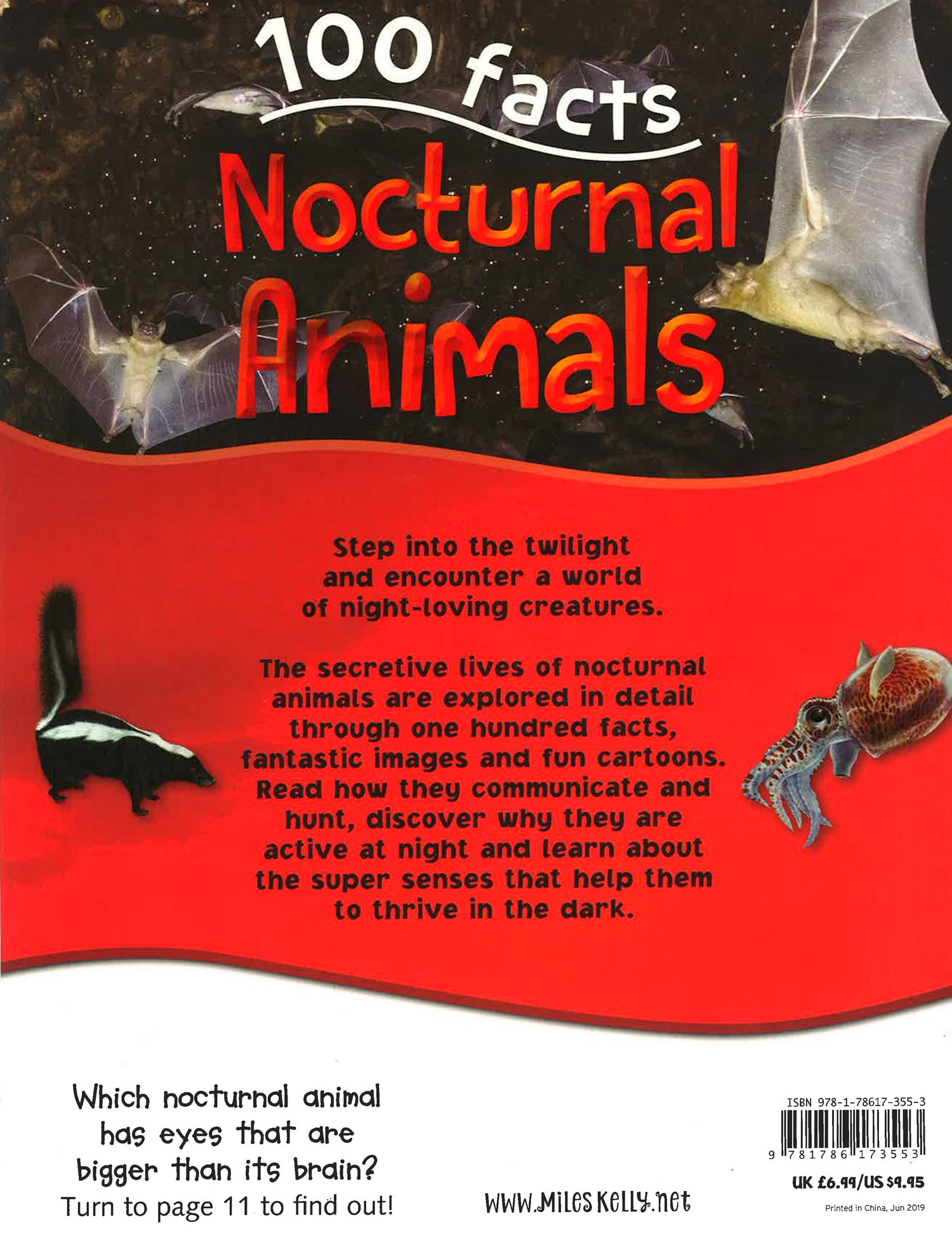 100 Facts Nocturnal Animals includes key topics about nocturnal animals including amazing facts for kids in easily-digestible, numbered paragraphs. Every page features amazing illustrations and photographs that clarify difficult points for kids. Step into the twilight and encounter a world of night-loving creatures.