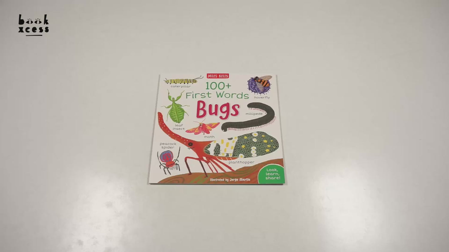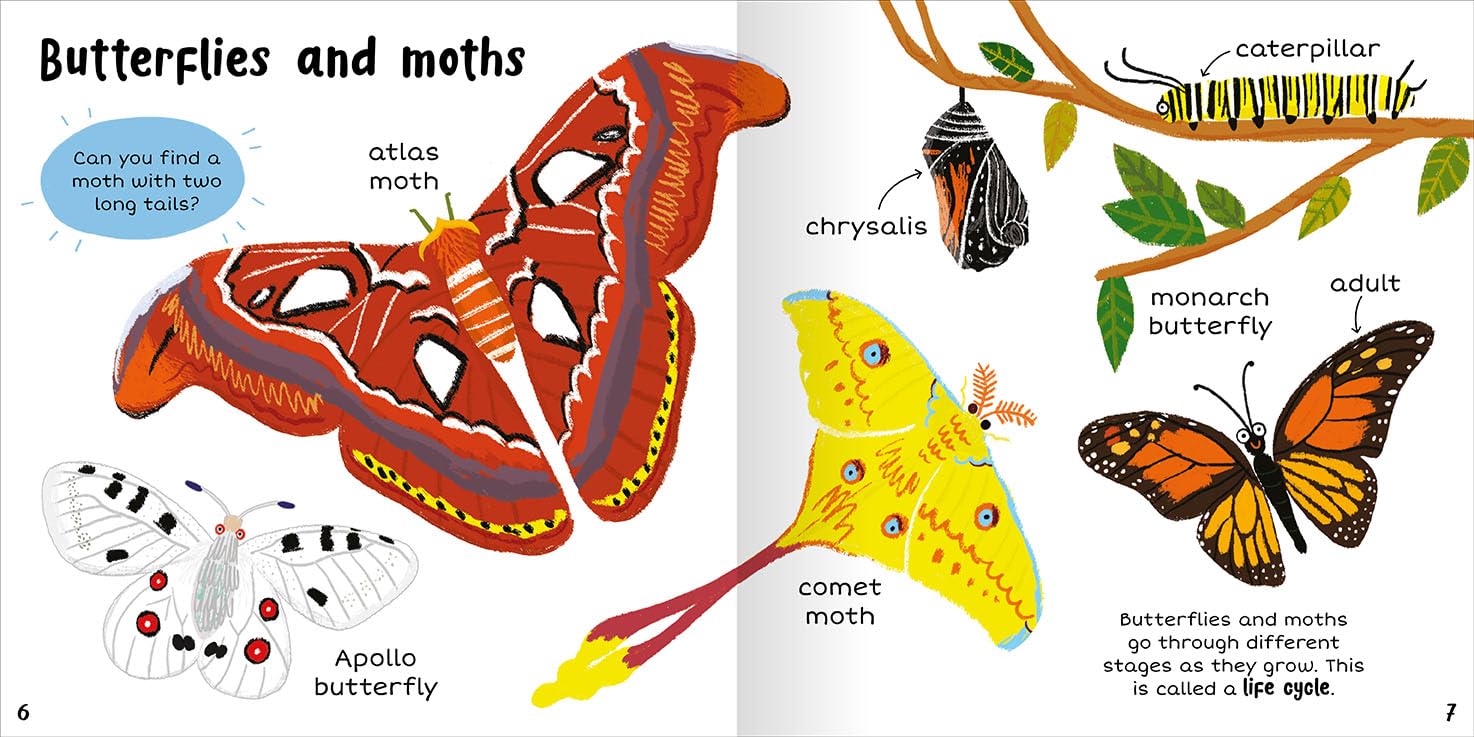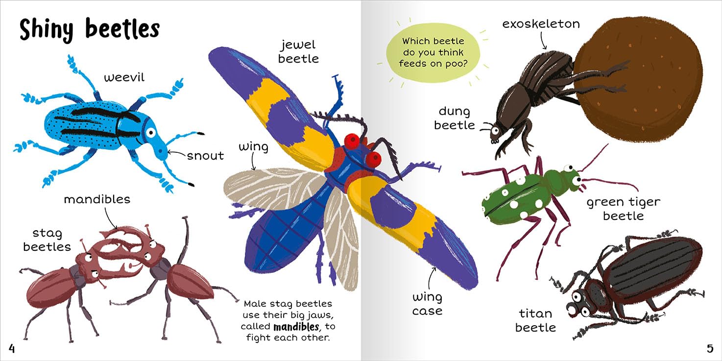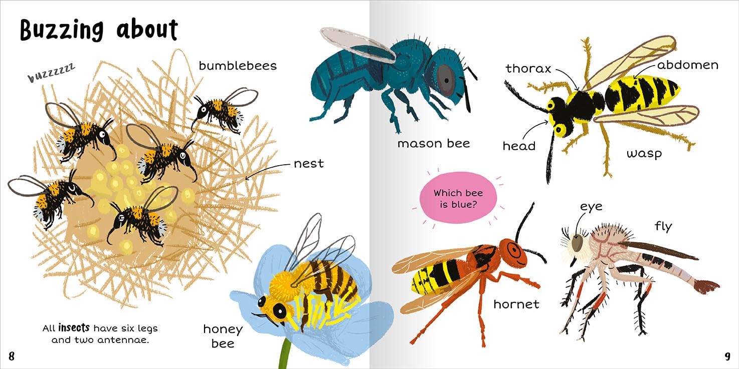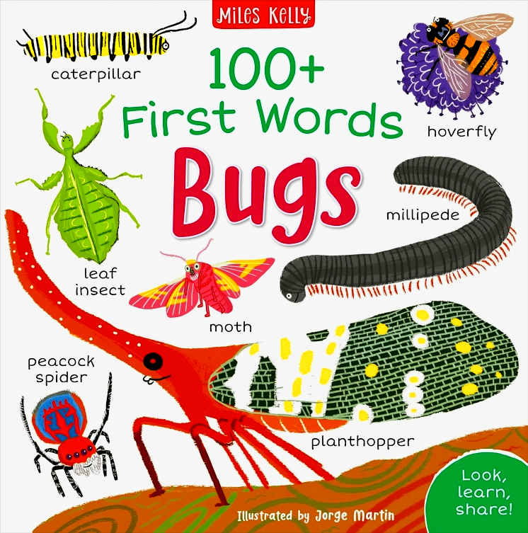 100+ First Words: Bugs Young children will love exploring their world with this helpful book of first bug words. Every double-page spread has a different theme relating to the bug world, packed with words and illustrations to discover and talk about. Simple questions are scattered around the pages to encourage inquisitive toddlers to interact with the book, and a fun quiz engages observational skills.