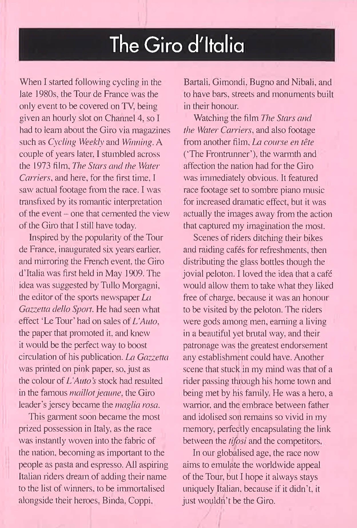 From the Gavia Pass to Mount Etna, from The Stelvio to The Zoncalan, these climbs are legends in Italy and the building blocks of the Giro d'Italia. Technology may advance, training and diet may evolve, but these world-famous mountains are a constant. They have witnessed triumph and despair, courage and heartache, they are where champions are made and where dreams are shattered. And yes, the greatest arenas of Italy's greatest race are open 365 days of the year for any of us to ride. So take up the challenge, emulate your heroes and make your mark on the hundred greatest cycling climbs of Italy.