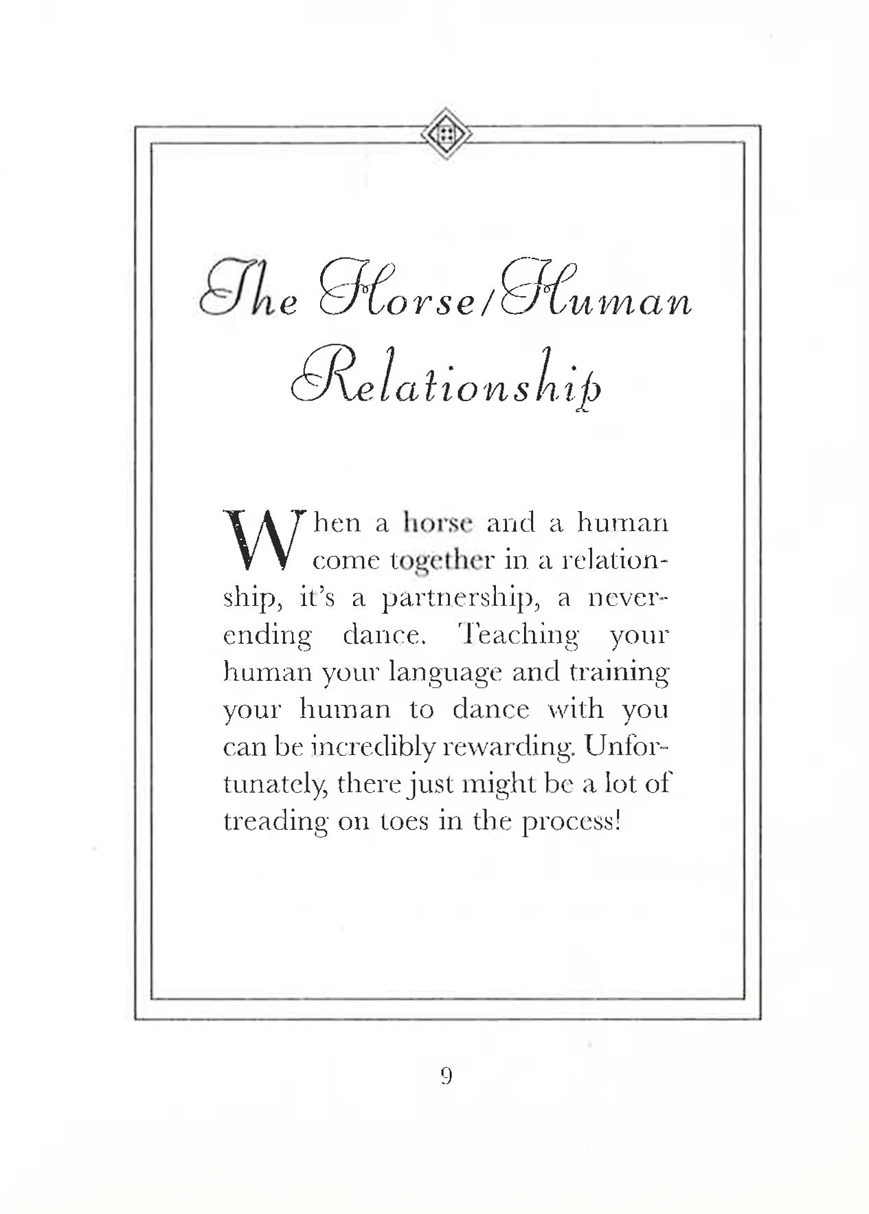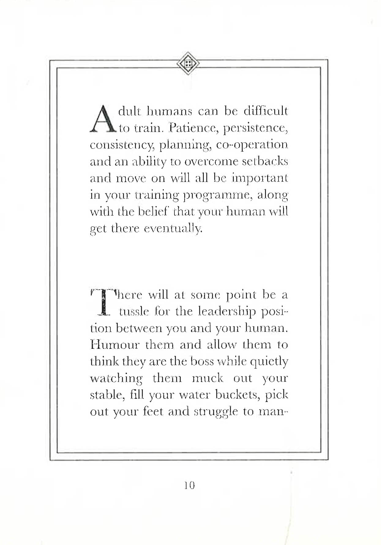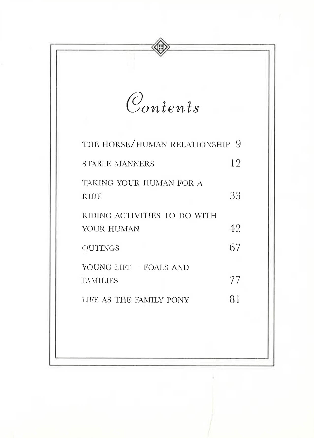 From the Family - pushy mother, long suffering father and sensitive daughter to the Nervous Adult Learner, The Yard Know It All and Dressage Diva it pays to know and understand your owner. Only this way can one truly maintain a well trained and maintained human.This guide includes all a horse will ever need to know about its owner, it can also be invaluable to any human who is unsure which 'breed' they belong to.
