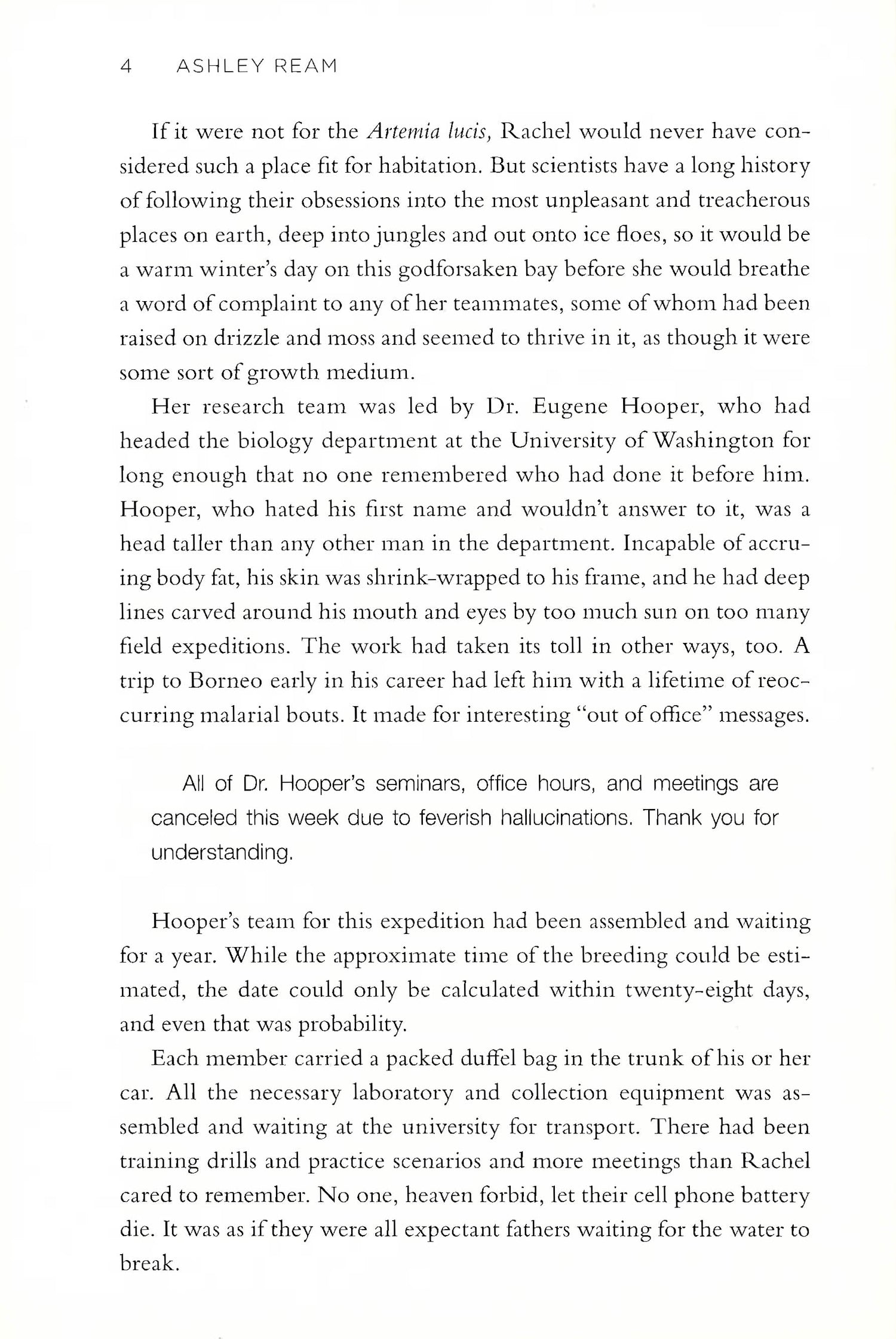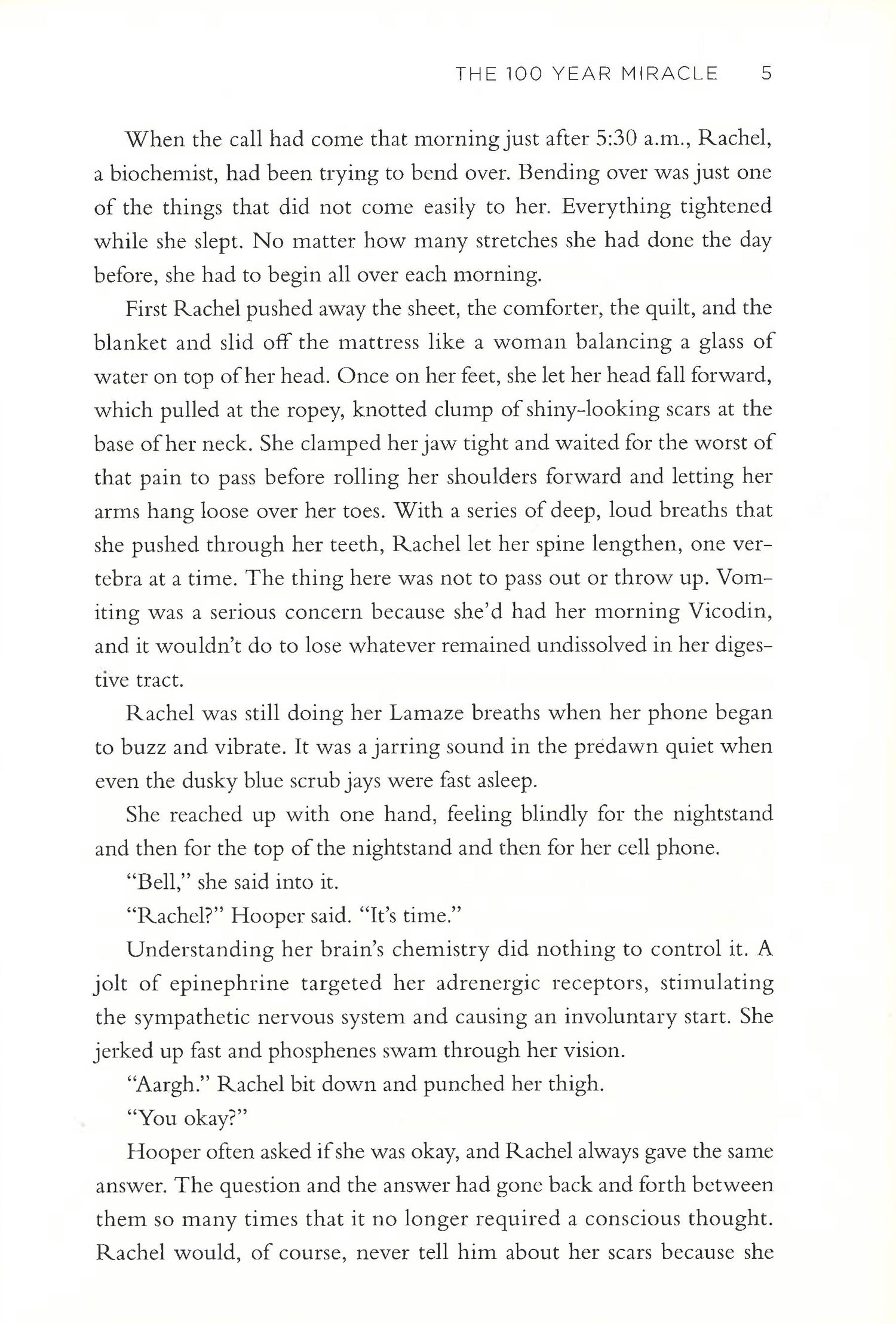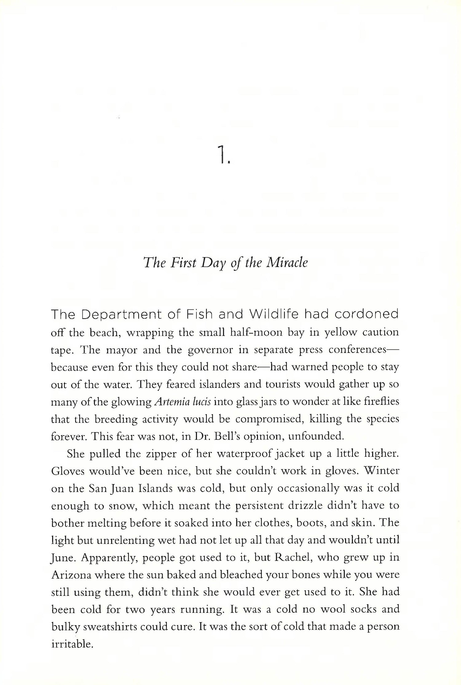 If you were given a once-in-a-lifetime chance to save yourself, wouldn't you take it? Even if it cost you everything...Once a century, for only six days, the bay around a small Washington island glows like a water-bound aurora. Dr. Rachel Bell, a scientist studying The 100 Year Miracle and the tiny sea creatures that create it, knows a secret about the phenomenon: the rare green water that inspired the myths and folklore of the native people who worshipped, consumed, and feared it may contain a power that could save Rachel's own life (and change the world). When Rachel connects with Harry and Tilda, a divorced couple cohabiting once again as Harry enters the last stages of a neurological disease, Harry is pulled into Rachel's obsession and hope. The Miracle does things to people. Strange and mysterious things. And as these things begin to happen, Rachel has only six days to uncover and control the Miracle's secrets before the waters go dark for another hundred years.