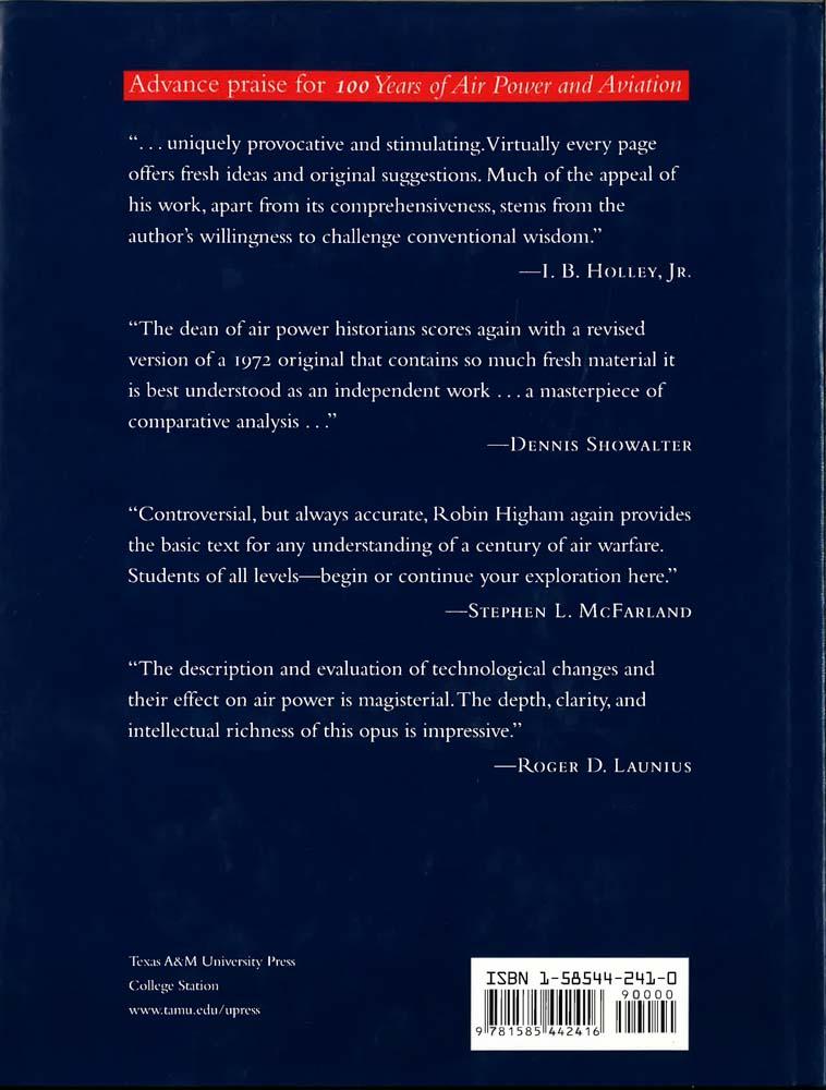 In ""100 Years of Air Power and Aviation"", Robin Higham presents a critical history of British, American, Soviet, German, Italian, French, Japanese and Israeli aviation. He moves from theory to concrete example and back again, in the process discussing the social, economic and political components of air power; the major wars and police actions in which aircraft have been employed; the composition of air forces; and the creation of aviation industries from the Wright brothers and the early pusher aircraft of World War I through Boeing's competition with Airbus and the development of the Eurofighter. The volume looks at everything from the roots of strategic bombing and tactical air power to the lessons learned and unlearned during the invasion of Ethiopia, the war in China and the Spanish Civil War. It also considers the problems posed by jet aircraft in Korea and the use of Patriot missiles in the Persian Gulf. The author covers anti-guerrilla operations, doctrine, industrial activities and equipment, as well as the development of commercial airlines. Turning his attention to civil aviation in the closing section, Higham discusses the commercial ""wars"" that saw Braniff fold as Continental filed for bankruptcy and Brazil's Embraer emerge as a third-world success story. He considers the rise and fall of Soviet civil aviation. He discusses the development of new aircraft and the expansion of airports such as O'Hare, which handles more than 200,000 passengers daily. Higham synthesizes 100 years of air power and aviation into cogent sets of principles and valuable lessons for future generations of airmen and politicians. Like his earlier works, this book hopes to capture the interest of scholars, students, enthusiasts and general readers looking for a serious overview by one of the country's leading aviation historians.