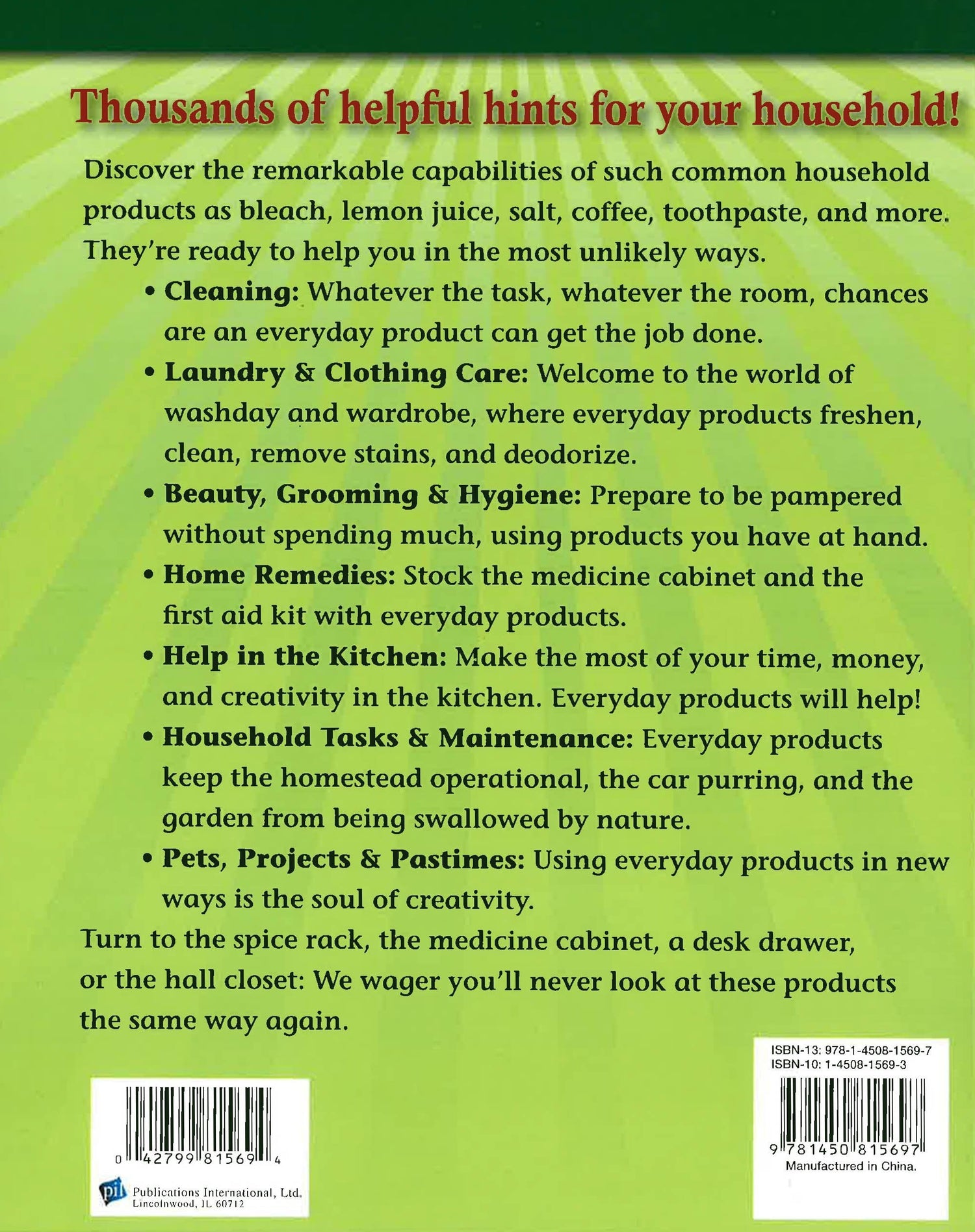 1000s of Amazing Uses for Everyday Products, from the trusted editors of Consumer Guide, provides thousands of helpful hints for every area of the household, using everyday products that have remarkable capabilities. The tips in this book unlock the power of inexpensive items most of us have on hand in our homes: bleach, salt, coffee, lemon juice, toothpaste, and more. In each chapter, you'll discover how these simple items can replace expensive, store-bought cleaning products for your home, your laundry, yourself, and even your pet. You'll not only save money, but also be more eco-friendly as you replace chemical concoctions that may be harmful with safer, more environmentally friendly choices. 1000s of Amazing Uses for Everyday Products includes valuable tips for a wide variety of household tasks from cleaning the dishwasher or making a facial mask to cleaning the car or fixing furniture. It also features creative recipes for a variety of household helpers, like carpet freshener, bubble bath, glue traps, and more. You'll learn how to put molasses, corn meal, hair conditioner, cream of tartar, and other products to use in unique and effective ways. Each tip is presented in a clear, step-by-step format. The book's organization makes it simple to find the perfect solutions for your next household task.