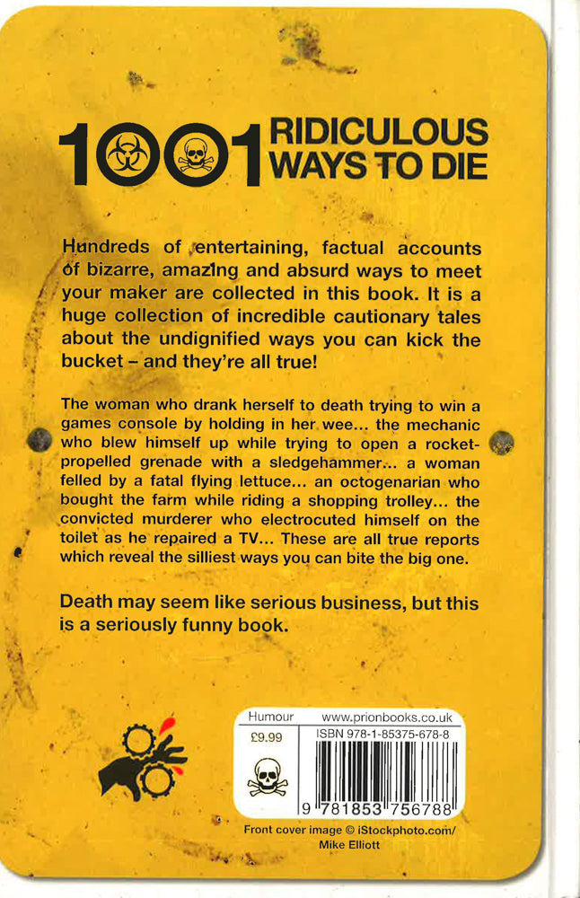 The woman who drunk herself to death with water trying to win a games console by holding in her wee...the mechanic who blew himself up while trying to open a rocket-propelled grenade with a sledgehammer...a lottery winner killed by the gates of his new luxury home...a woman felled forever by a fatal falling lettuce...an octogenarian who met his maker while riding a shopping trolley...a German artist crushed by one of his own sculptures called 'Woman With Four Breasts'...the convicted murderer who electrocuted himself on the toilet as he repaired a TV - all true reports from across the globe which reveal the silliest ways you can meet your maker. Death may seem like a serious business, but this is a seriously funny book.