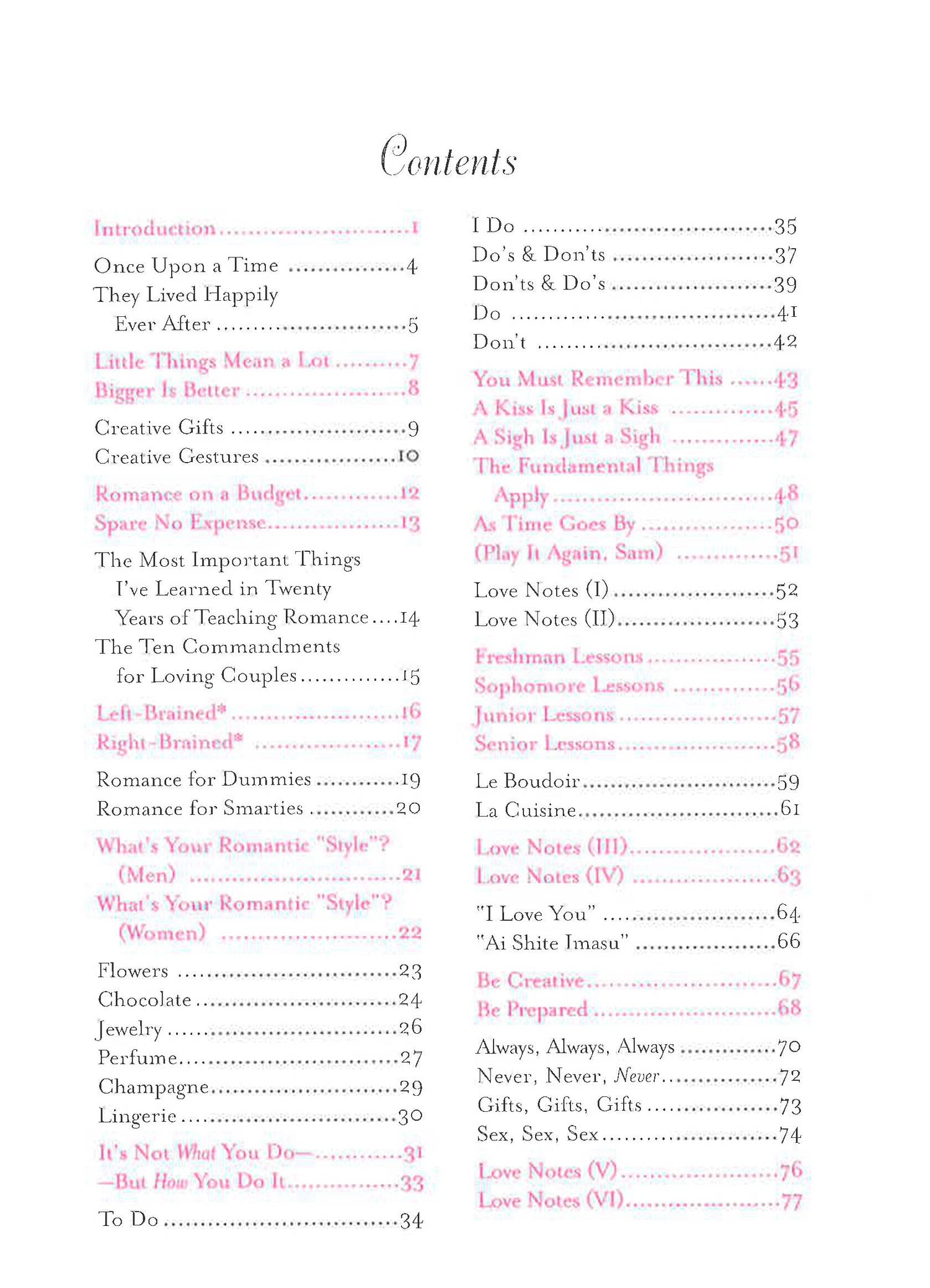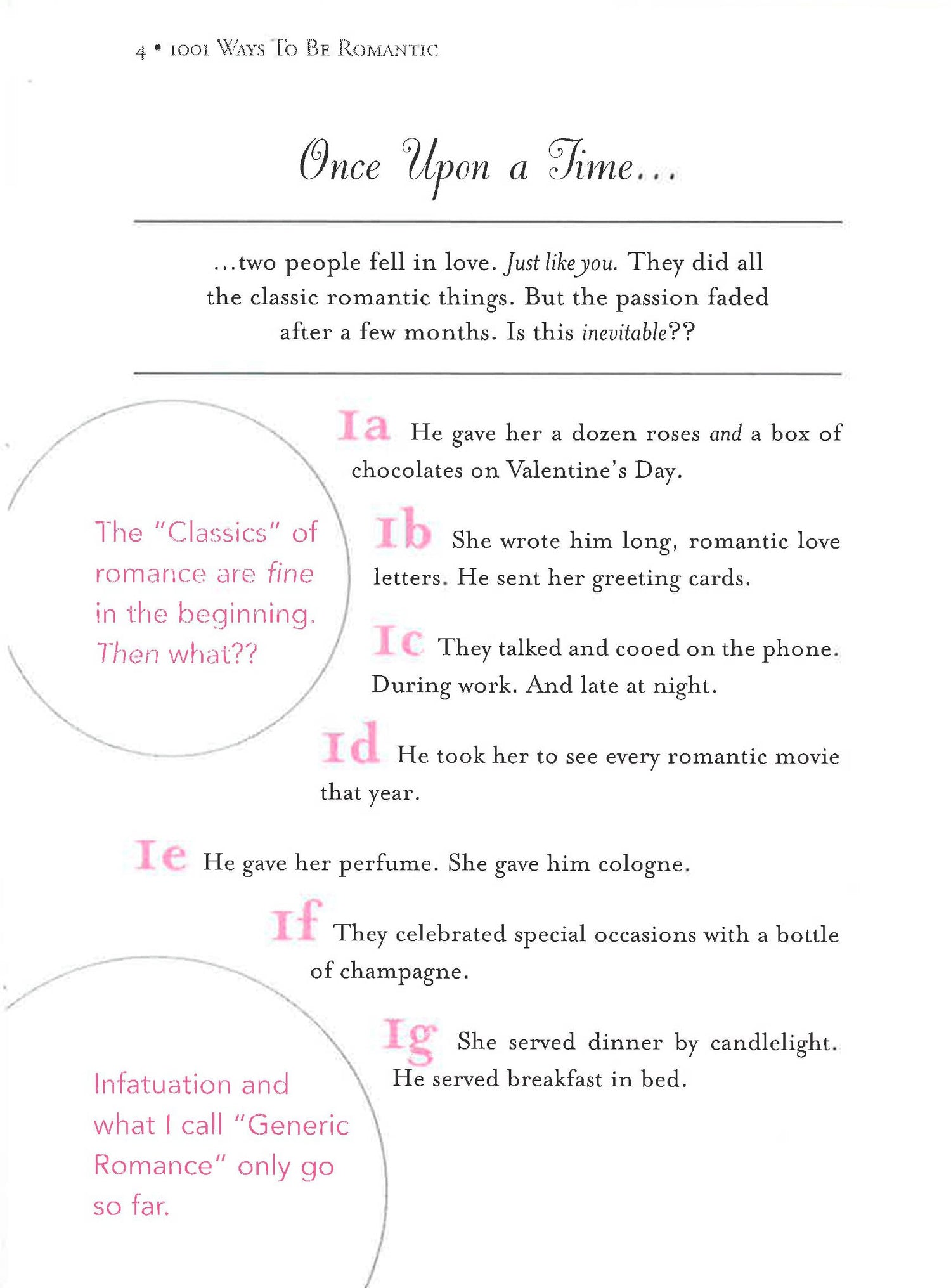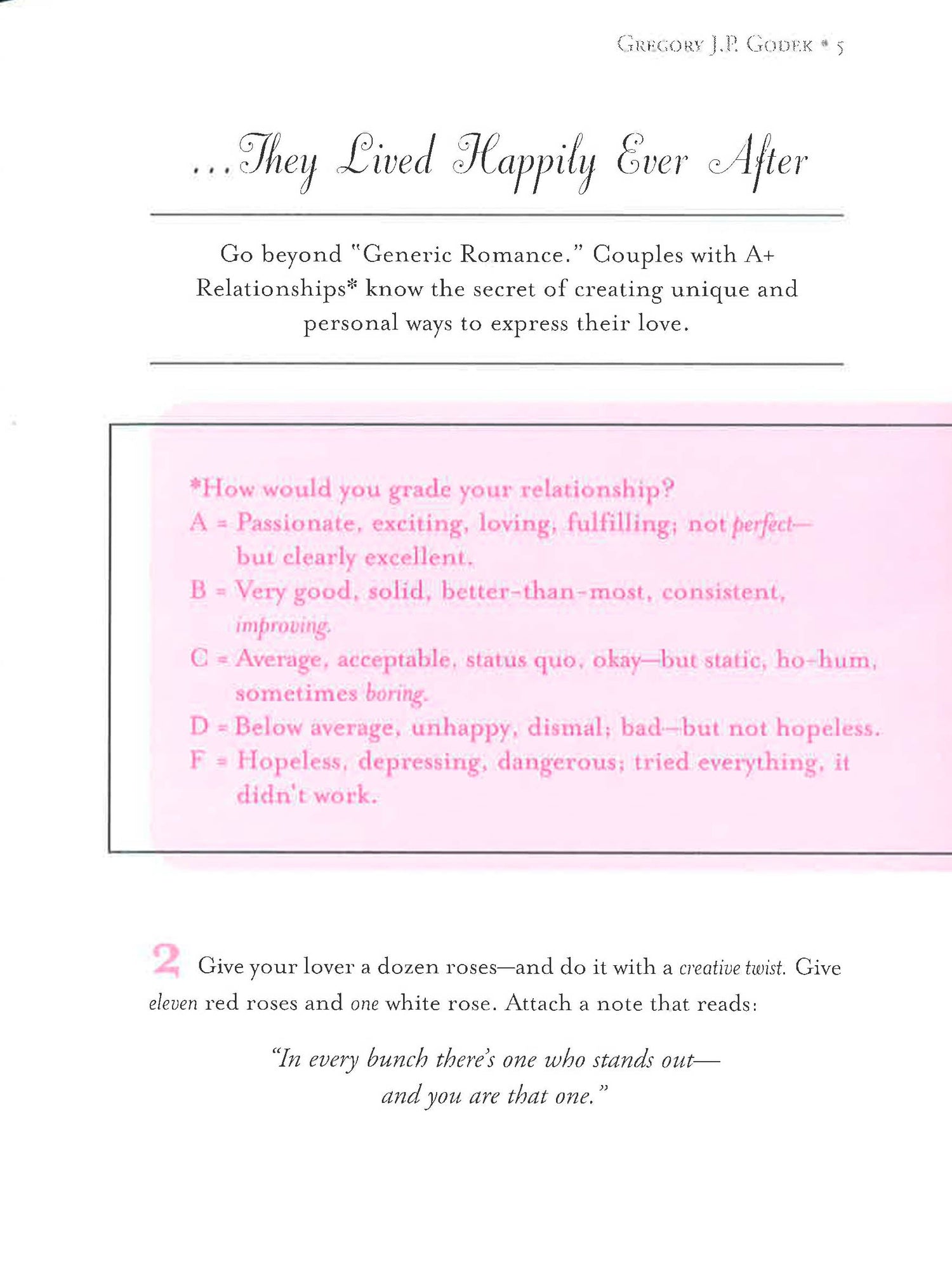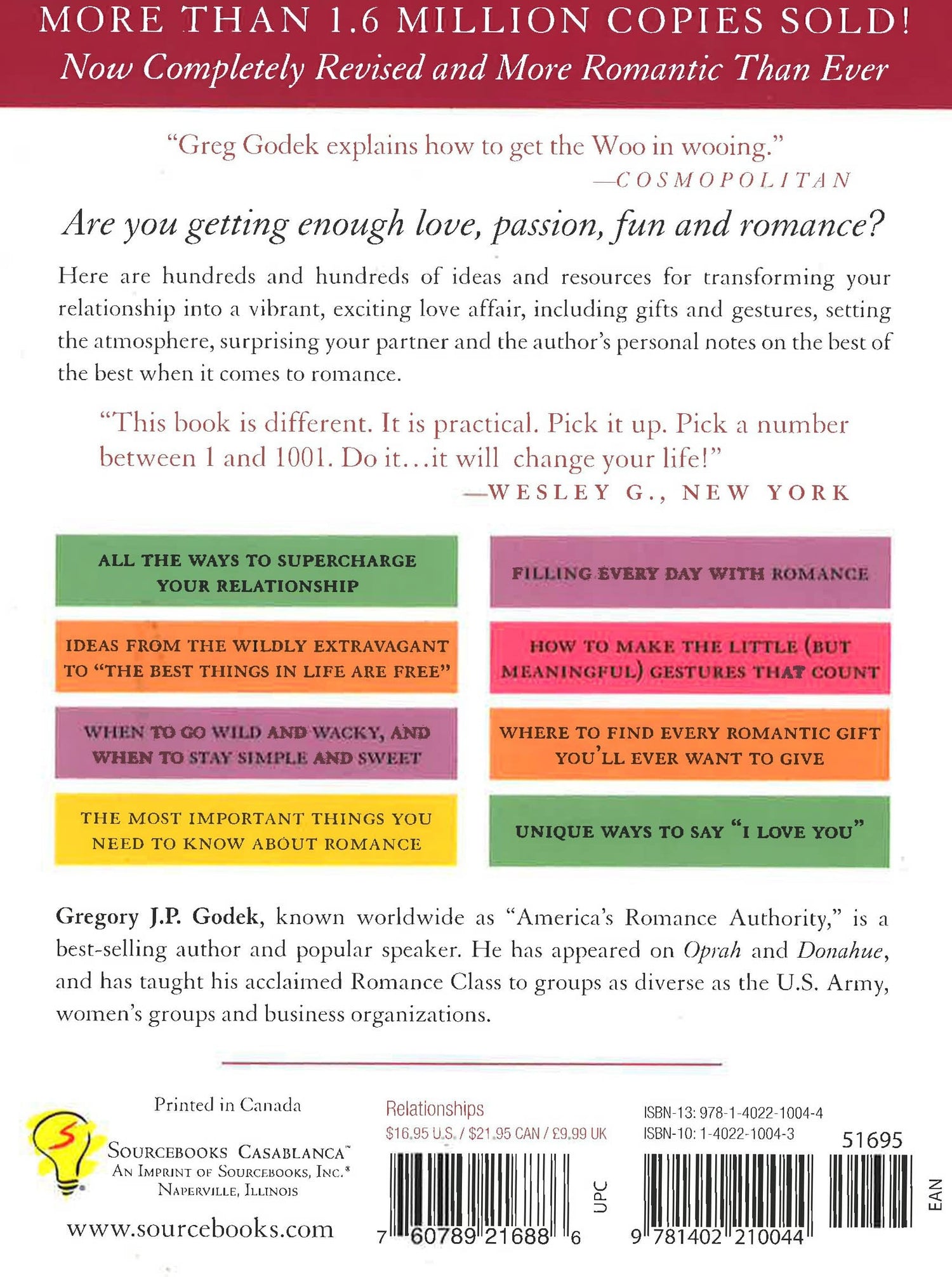 More Than 1.6 Million Copies Sold! Now Completely Revised and more Romantic than Ever "Greg Godek explains how to get the Woo in wooing." -Cosmopolitan Are you getting enough love, passion, fun, ROMANCE? Here are hundreds and hundreds of ideas and resources for transforming your relationship into a vibrant, exciting love affair. --Flirt shamelessly with your partner, IN PUBLIC . . . --Write I LOVE YOU with soap on the bathroom mirror . . . --STEAL a kiss, GIVE it back . . . Plus much, much more, including gifts and gestures, setting the atmosphere, surprising your partner and the author's personal notes on the best of the best when it comes to ROMANCE. "This book is different. It is practical. Pick it up. Pick a number between 1 and 1001. Do it . . . It will change your life!" -Wesley G., New York