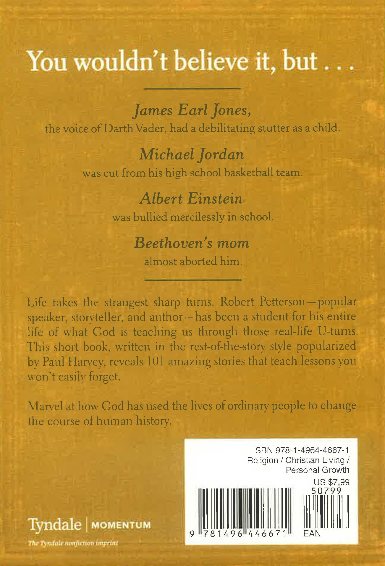 Life takes the strangest sharp turns―and sometimes, U-turns. Robert Petterson―popular speaker, storyteller, and author―has been a student for his entire life of what God is teaching us through those real-life U-turns. In this short book, he compiles amazing stories that teach lessons you won’t easily forget. Each entry is written in the rest-of-the-story style popularized by Paul Harvey.