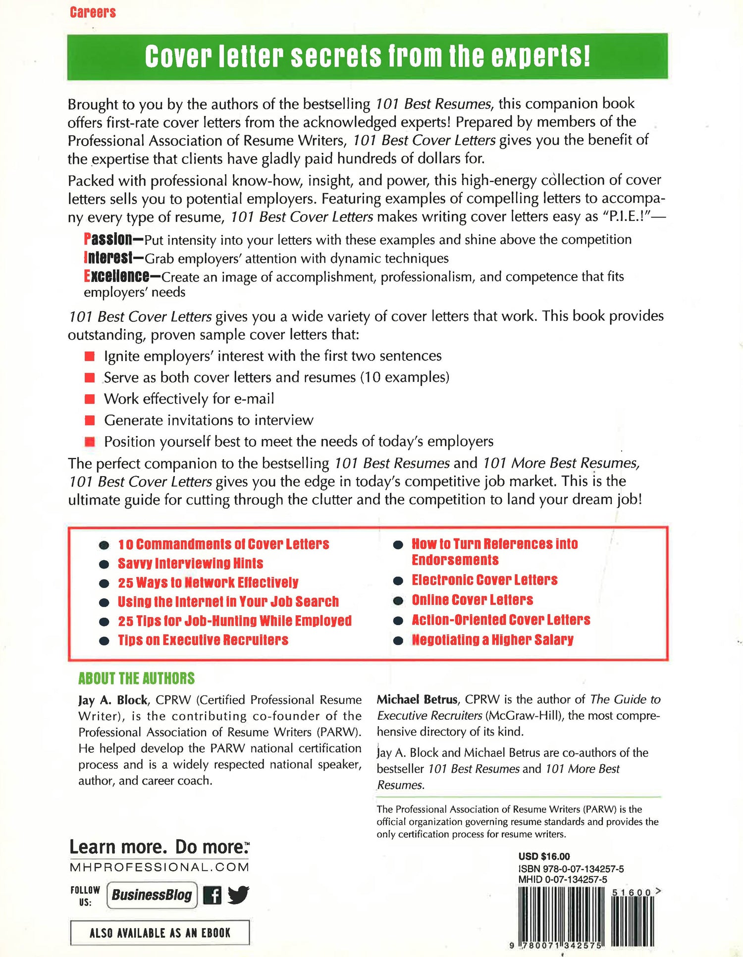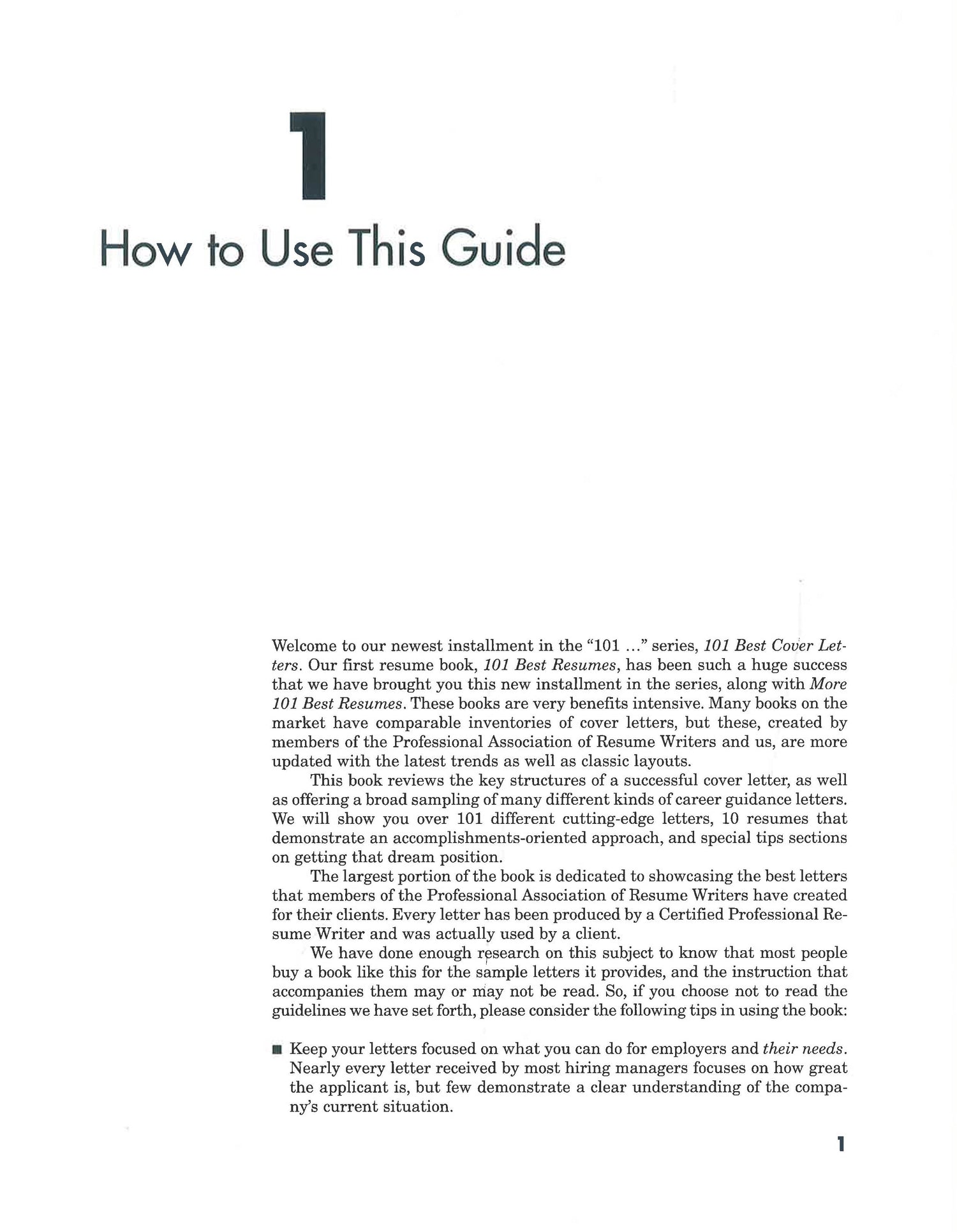 This is the best cover letter secrets from the experts! Brought to you by the authors of the best-selling "101 Best Resumes", this companion book offers first-rate cover letters from the experts! Prepared by experienced writers in the Professional Association of Resume Writers, the organization that certifies career document specialists, "101 Best Cover Letters" gives you the benefit of the expertise that clients have gladly paid hundreds of dollars for. Packed with professional know-how, insight, and power, this high-energy collection of letters sells you to potential employers. Featuring examples of compelling cover letters to accompany every type of resume, "101 Best Cover Letters" makes cover letters easy as P.I.E. It helps you: put intensity into your letters; emulate these examples and shine above the competition; grab employers' attention with dynamic techniques; and, create an image of accomplishment, professionalism, and competence that fits employers' needs."101 Best Cover Letters" gives you a wide variety of cover letters that work. This book provides outstanding, proven sample cover letters that: get your resume read attentively; ignite employers' interest with the first two sentences; communicate confidence, integrity, and competence; serve as both cover letters and resumes (10 examples); work effectively for e-mail; generate invitations to interviews; and, position yourself best to meet the needs of today's employers. The perfect companion to the bestselling "101 Best Resumes" and "101 More Best Resumes", "101 Best Cover Letters" gives you the edge in today's competitive job market. This is the ultimate guide for cutting through the clutter and the competition to land your dream job!