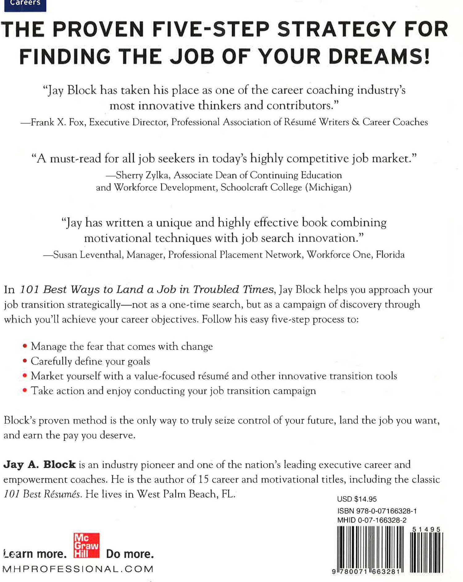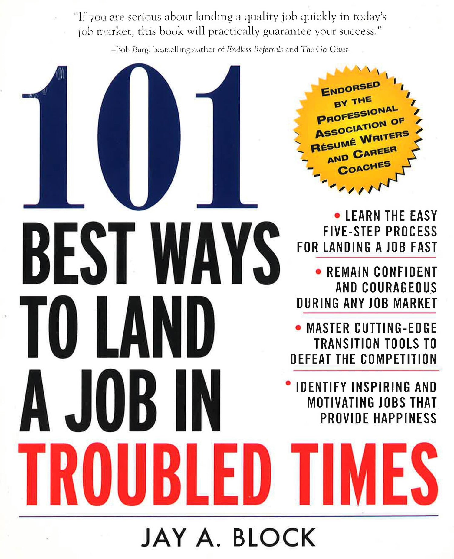 The bestselling career guru offers sure-fire tactics for any job market THE PROVEN FIVE-STEP STRATEGY FORFINDING THE JOB OF YOUR DREAMS!"If you are serious about landing a quality job quickly in today'sjob market, this book will practically guarantee your success."-Bob Burg, bestselling author of Endless Referrals and The Go-Giver"Jay Block has taken his place as one of the career coaching industry'smost innovative thinkers and contributors."-Frank X. Fox, Executive Director, Professional Association of Resume Writers & Career Coaches"A must-read for all job seekers in today's highly competitive job market."-Sherry Zylka, Associate Dean of Continuing Educationand Workforce Development, Schoolcraft College (Michigan)"Jay has written a unique and highly effective book combiningmotivational techniques with job search innovation."-Susan Leventhal, Manager, Professional Placement Network, Workforce One, FloridaAbout the Book:In 101 Best Ways to Land a Job in Troubled Times, Jay Block helps you approach yourjob transition strategically-not as a one-time search, but as a campaign of discovery throughwhich you'll achieve your career objectives. Follow his easy five-step process to:Manage fear and negative emotions that impede success Carefully define clear job and career goals Create effective and high-impact self- marketing tools that make job seekers STAND OUT professionallyDevelop strategic, structured action plans that will become the job seeker's GPS to their next jobTake action and "enjoy the process" of landing a job in troubled times quickly and effectivelyBlock's proven method is the only way to truly seize control of your future, land the job you want,and earn the pay you deserve.