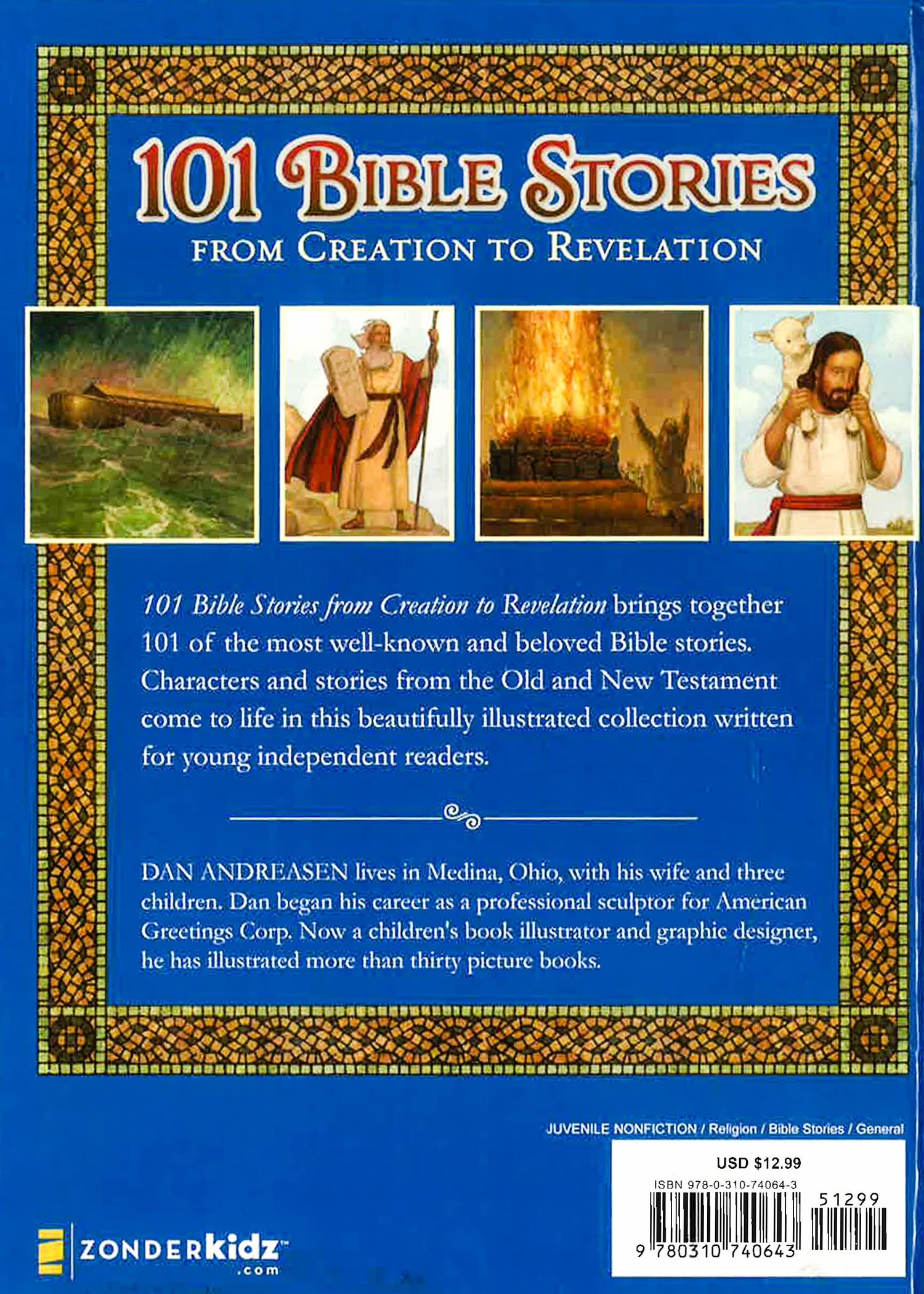 101 Bible Stories from Creation to Revelation brings together 101 of the most well-known and beloved Bible stories. Written for young independent readers and with colorful artwork, this storybook Bible is sure to become a favorite. Each story is one page in length and features a picture depicting the main character or event of the story.