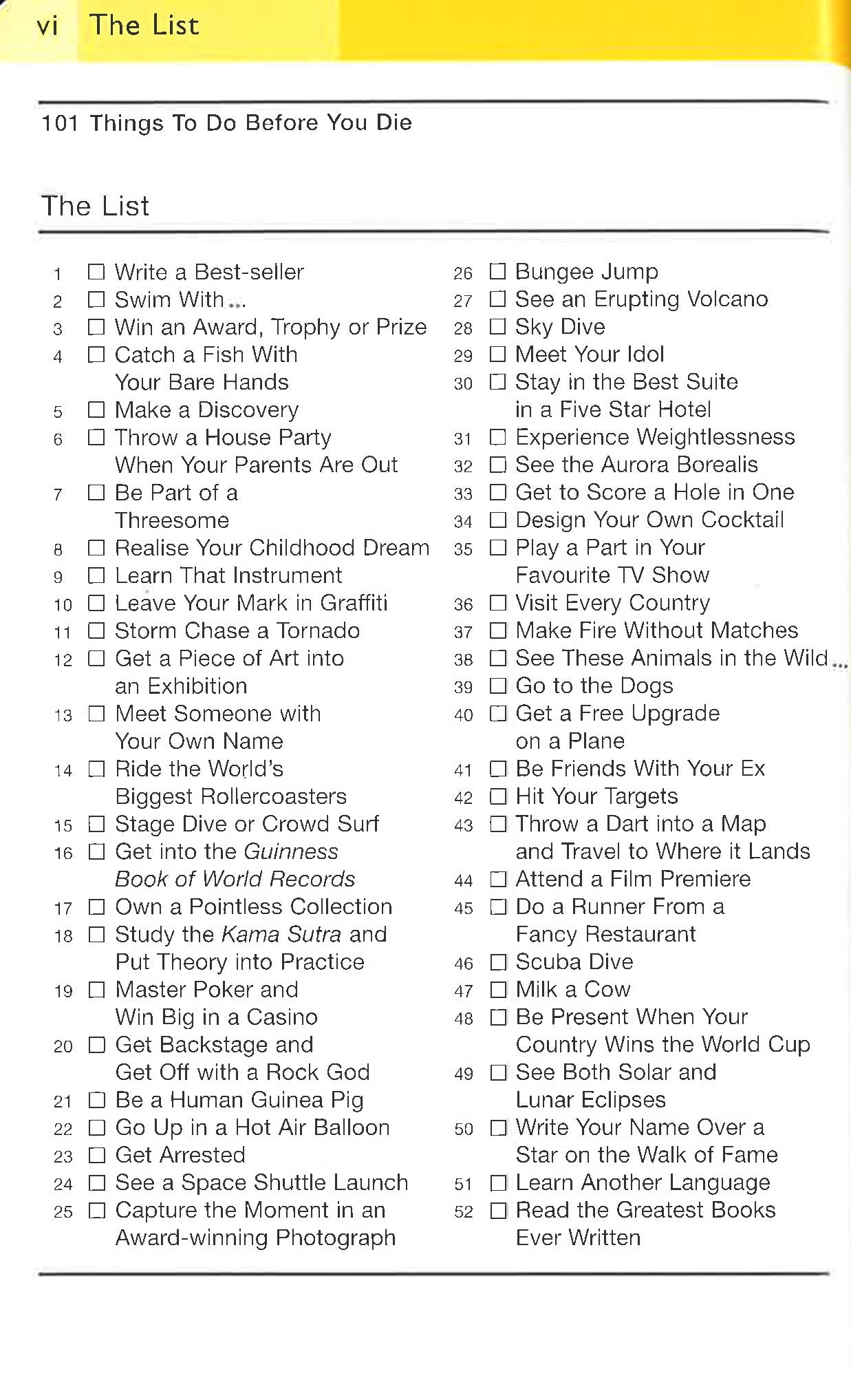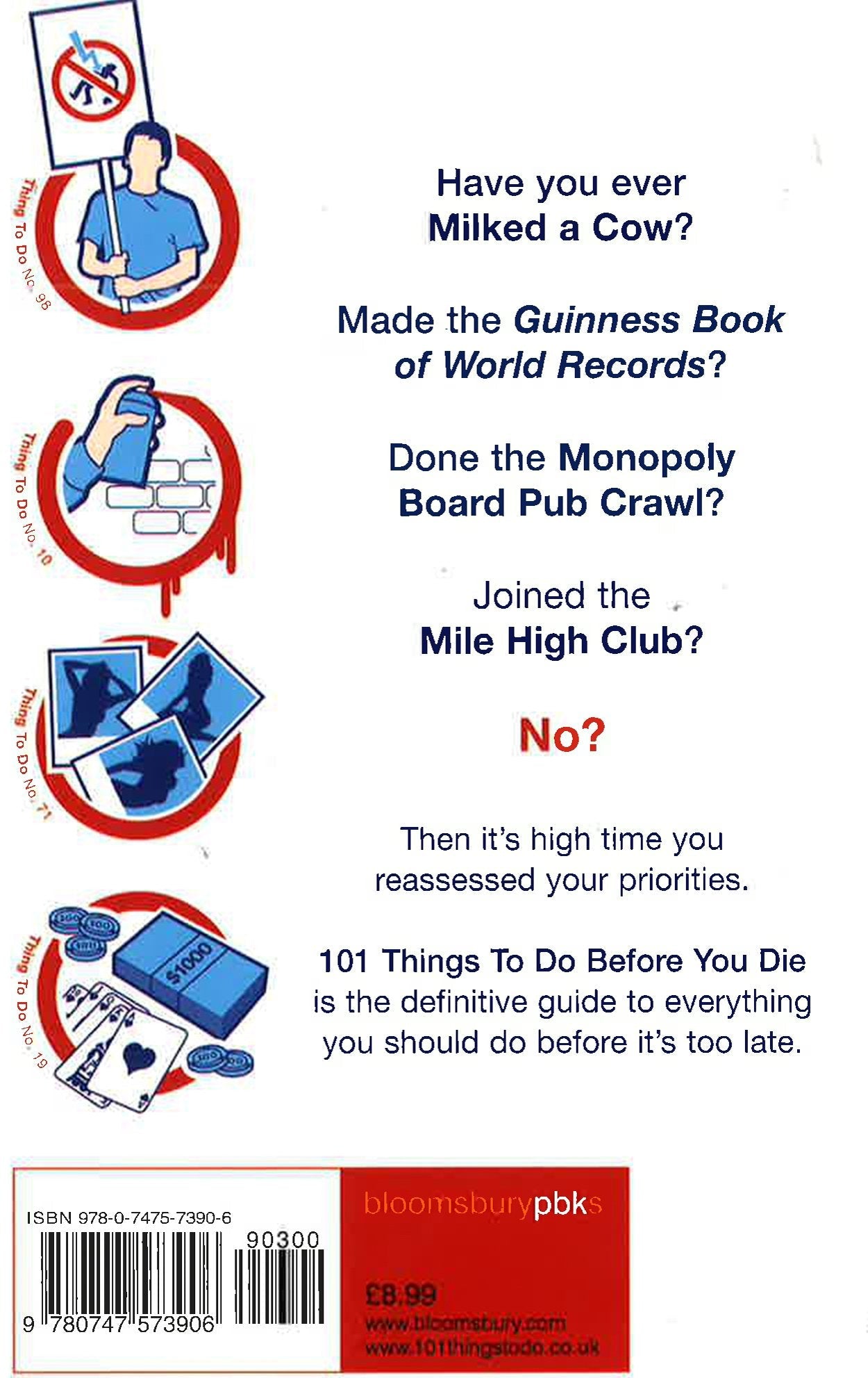 Have you ever Milked a Cow? Made the "Guinness Book of World Records"? Done the Monopoly Board pub crawl? Joined the Mile High Club? No? Then it's high time you reassessed your priorities. "101 Things To Do Before You Die" is the definitive guide to everything you should do before it's too late...and you bite the dust without even Getting a Tattoo or Getting Off With A Rock Star.