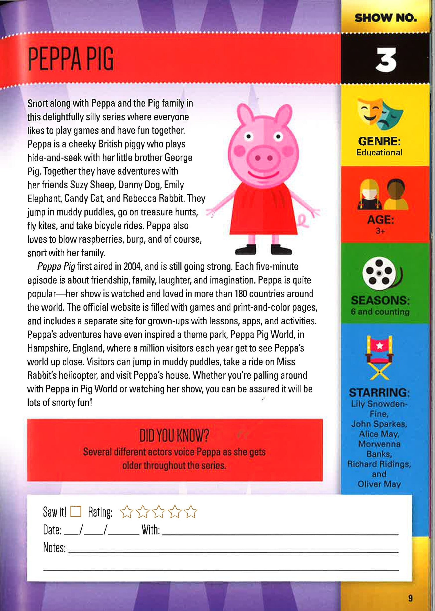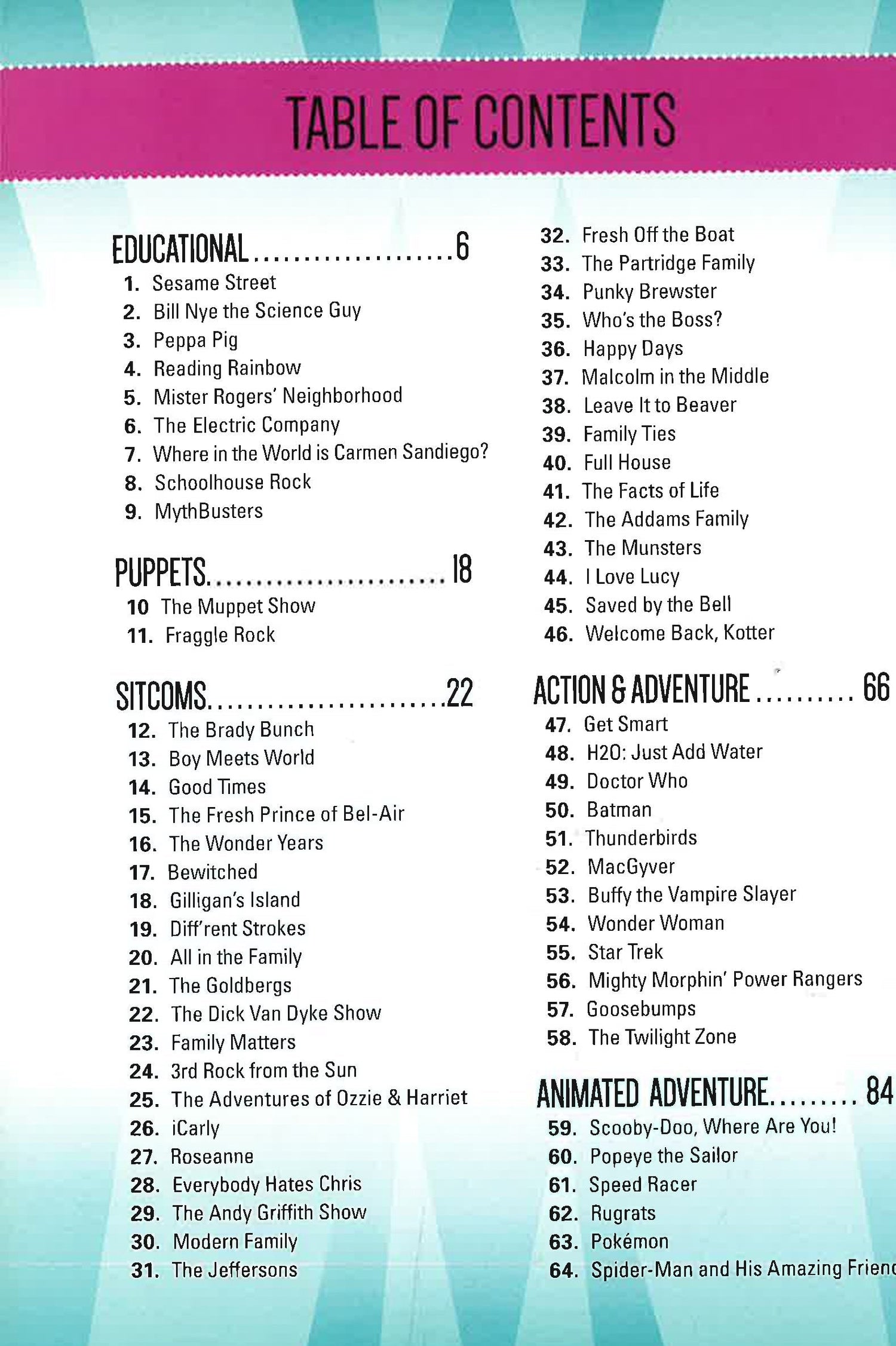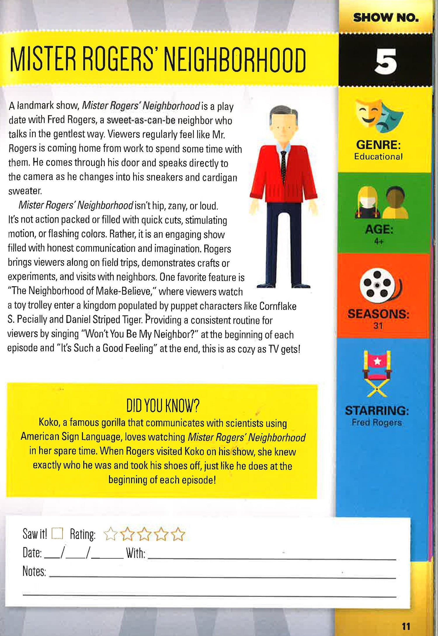 Television shows are made to entertain! They can make you laugh, teach you lessons, or allow you to escape into another world for an episode or two. 101 TV Shows to See Before You Grow Up is an interactive and comprehensive list of 101 TV shows for families to enjoy together. From popular picks of today to classic shows of decades past, kids will discover a wide selection of "must see" TV shows, appropriate for all ages. Each page focuses on a single TV series with basic information about each show, including the actors, years of production, and rating. There is also a section at the bottom of each page that allows young television buffs to write in their own opinions and observations about the show. From toddler to tween and every age in between, 101 TV Shows to See Before You Grow Up is a fun handbook for TV lovers of all ages.