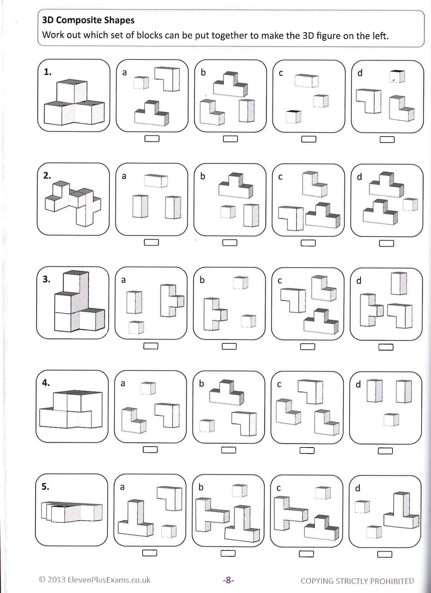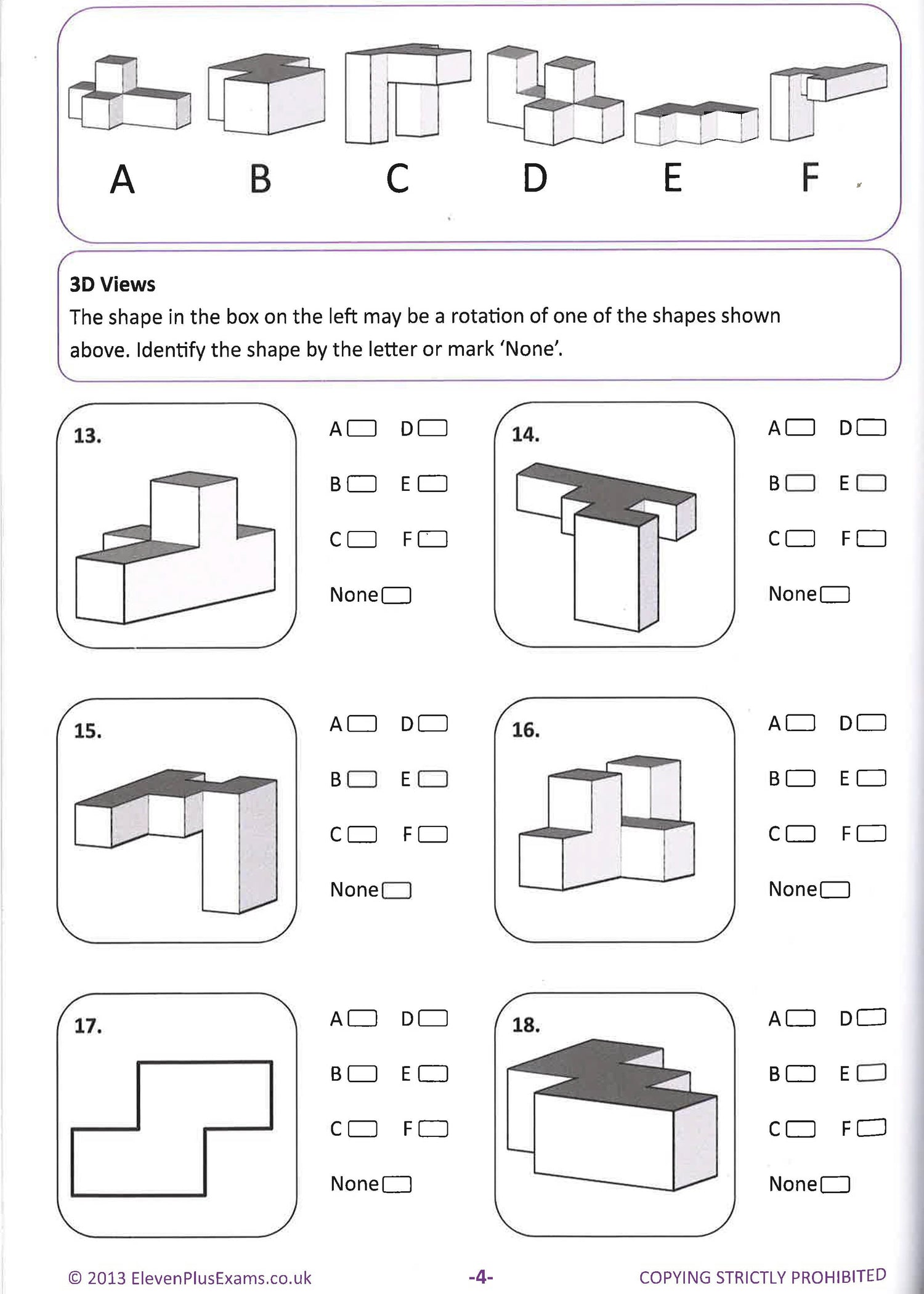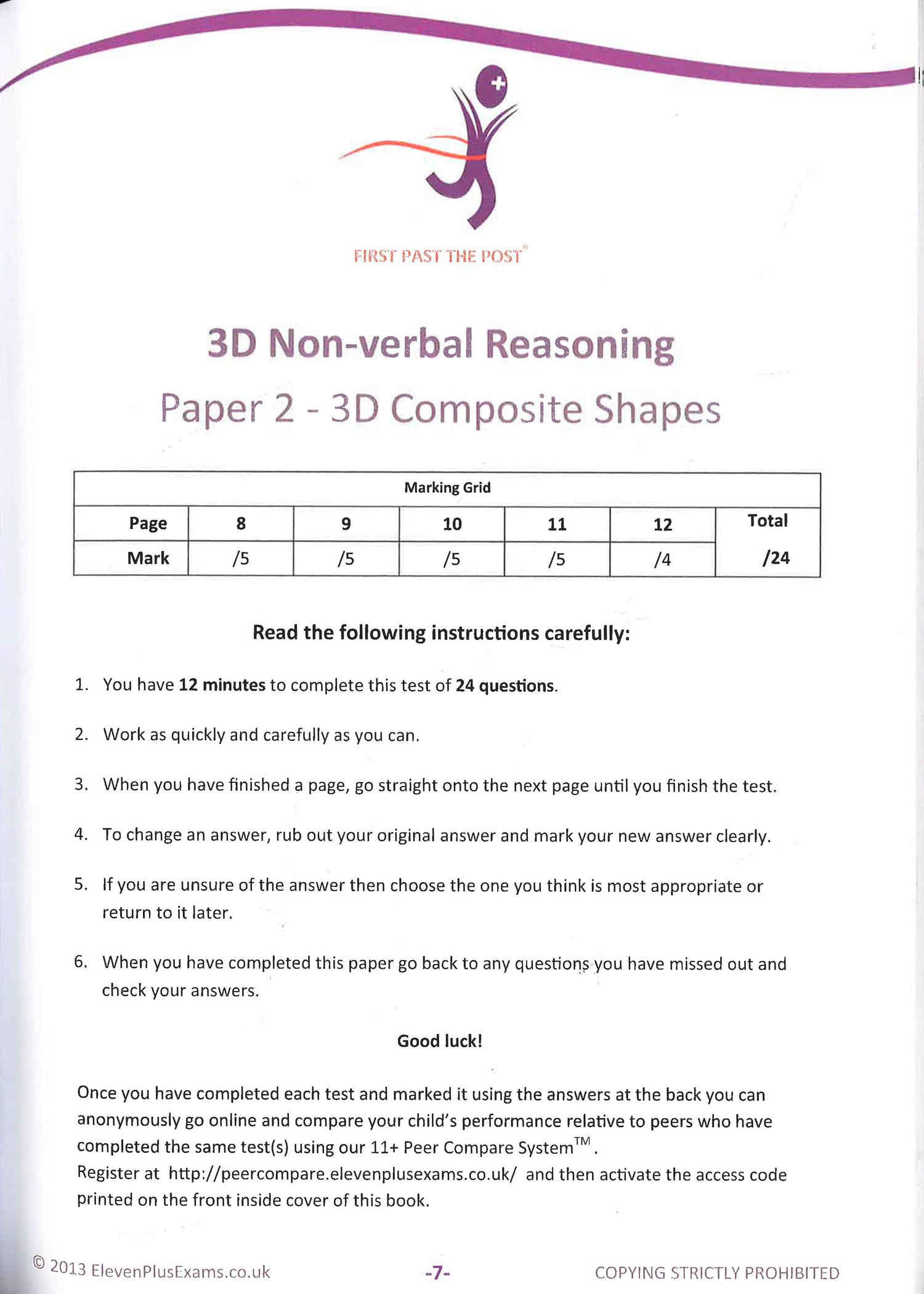 Three dimensional non-verbal reasoning is a recent introduction to CEM 11+ examinations and common entrance exams testing and has become particularly prevalent in multi-discipline exam papers, making this another valuable addition to the ElevenPlusExams 11+ Essentials series. This book covers the most commonly occurring question styles found in 11+ testing: 3D Views; 3D Composite Shapes; 3D Cube Nets; 3D Plan Views. The question styles are presented in a series of individual tests and mixed papers to be done under timed conditions. They are suitable for independent schools and new style 11 plus exams. Upon completing each exercise, the parent is able to log on into the ElevenPlusExams Peer-Compare(R) system and compare their child's performance relative to that of a cohort of other children who have completed the same exercises. Extensively road-tested by ElevenPlusExams, these tests are best used as real exam practice to benchmark your child's performance. They are perfect for use both in the classroom and at home.
