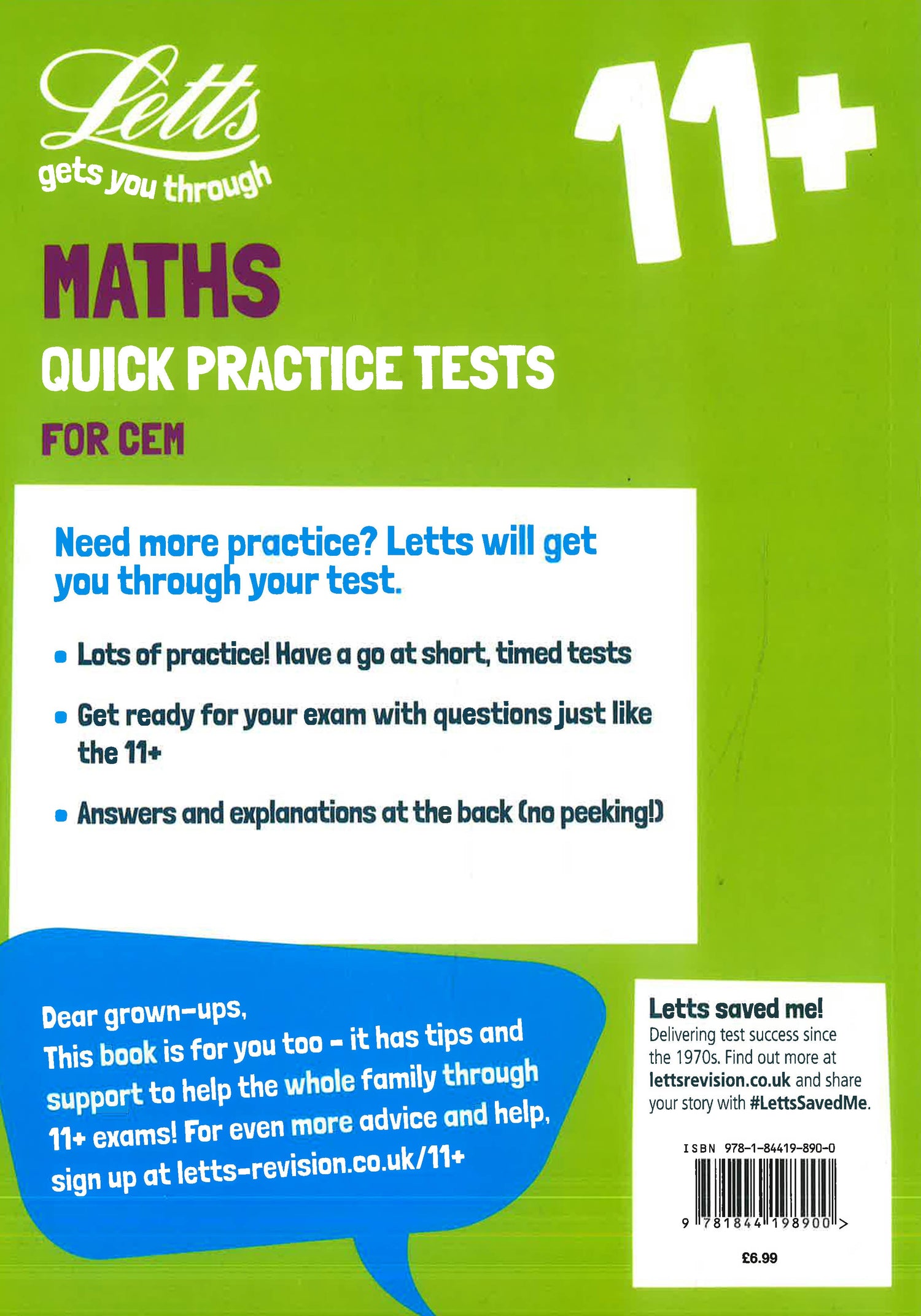 For children age 10-11, the Letts 11+ Maths Practice Tests (9781844198931) is also available.