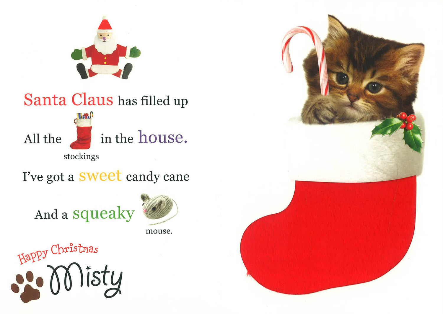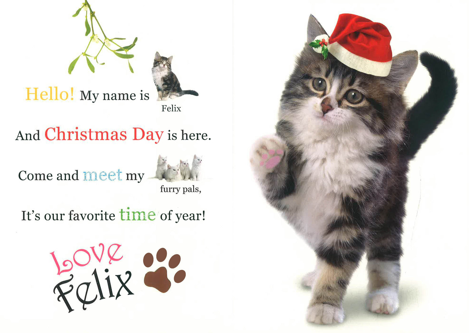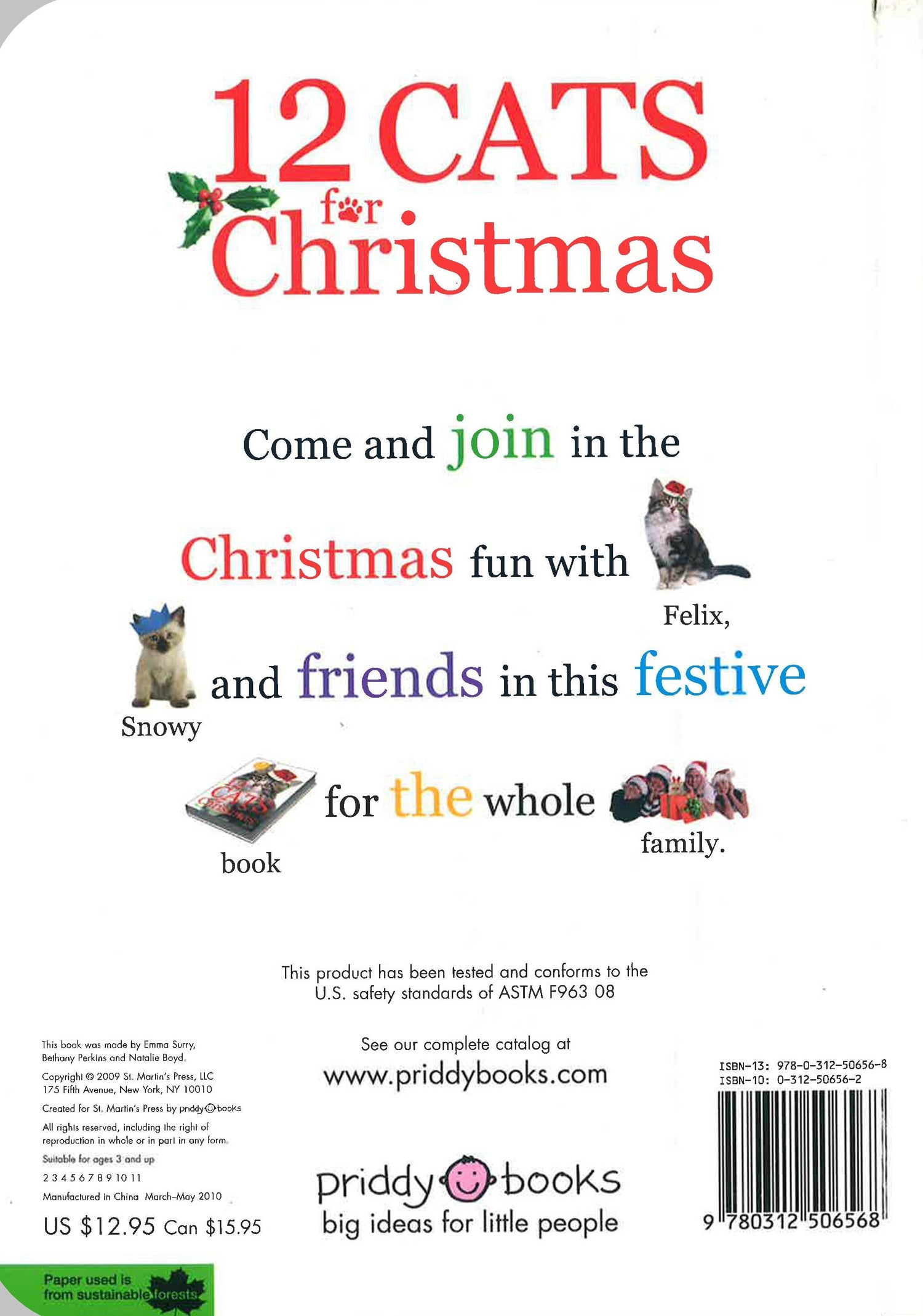 Twelve cats describe their Christmases, in a book where pictures replace specific words.