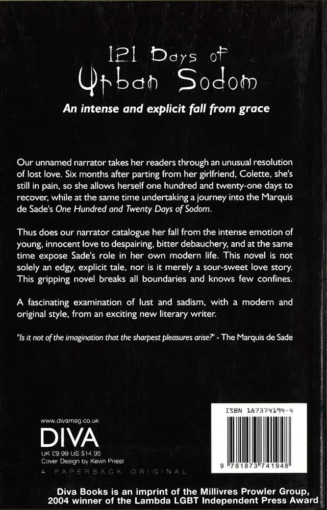 Our unnamed narrator takes her readers through an unusual resolution of lost love-six months after parting from her girlfriend Colette, she's still in pain. So she allows herself one hundred and twenty-one days to recover, while at the same time undertaking a journey into the Marquis de Sade's "One Hundred and Twenty Days of Sodom," Thus does our narrator catalogue her fall from the intense emotion of young innocent love to despairing bitter debauchery, and at the same time exposes Sade's role in her own modern life. This novel is not solely an edgy, explicit tale, nor is it merely a sour-sweet love story. This gripping novel breaks all boundaries and knows few confines.