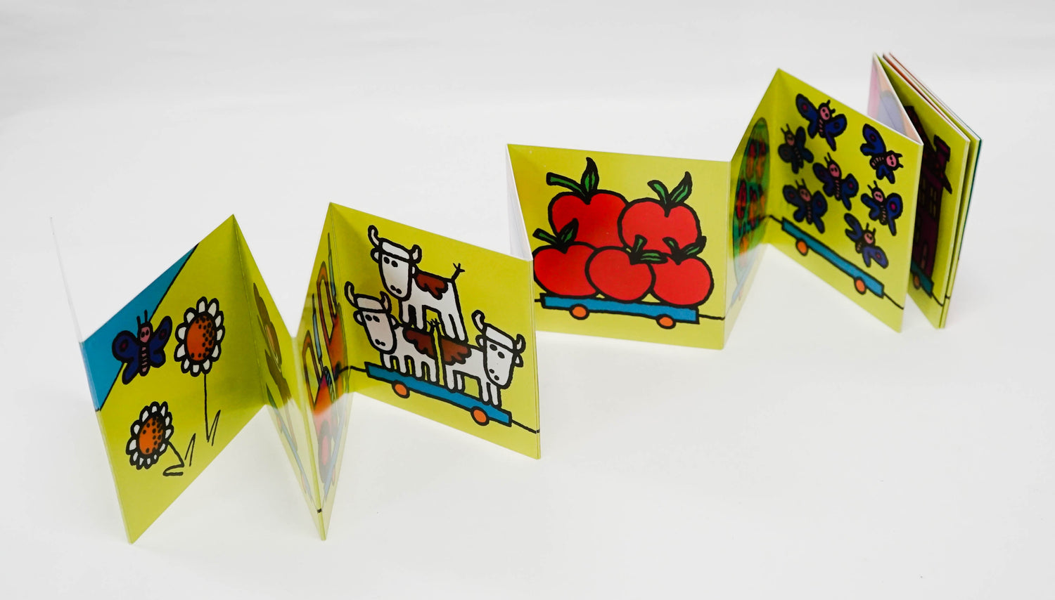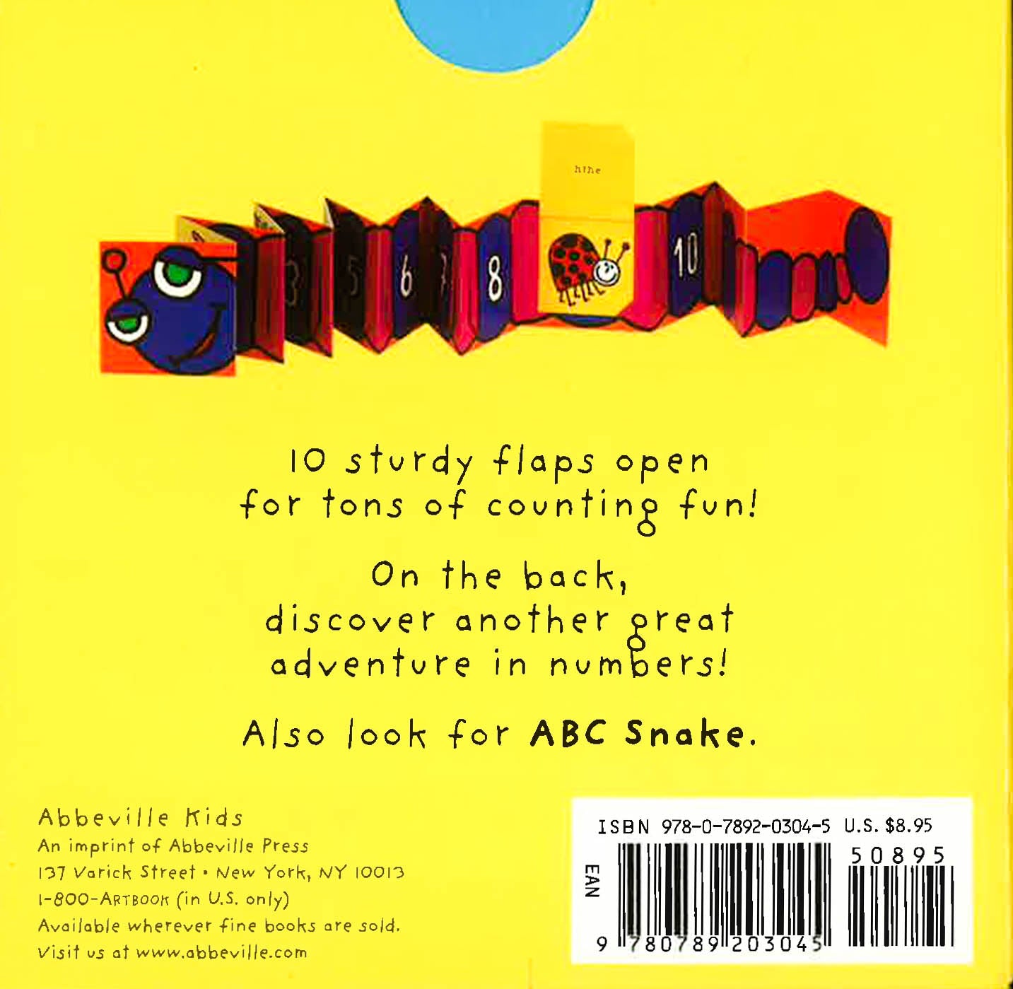 10 sturdy flaps open for tons of counting fun! The compact caterpillar unfolds to become two fun number exercises for youngsters: on one side, the numbered panels of the caterpillar's body open to reveal countable groups (from 1 bicycle all the way up to 8 spider legs, 9 ladybug spots, and 10 fingers) and the spelled-out name of the number. On the reverse, each car of a train carries a countable cargo 1 teddy bear, 2 trucks, 3 cows. A sturdy slipcase protects the book from wear and tear. Also look for ABC Snake.