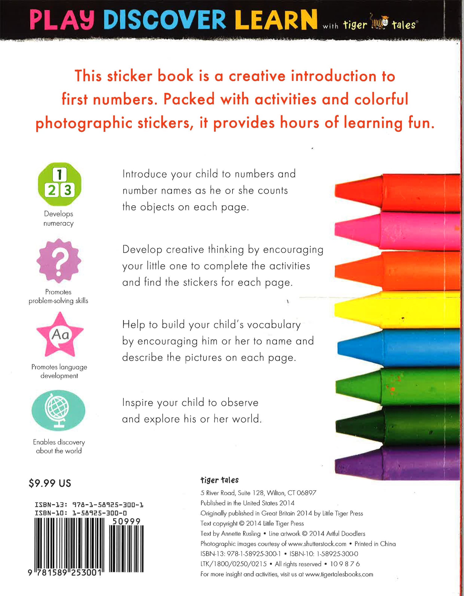 Introduce children to the numbers 1 through 10 with this innovative book, filled with engaging activities, such as matching, tracing, coloring, following mazes, and much more. Young readers develop creative thinking and vocabulary skills by completing the activities and finding the missing stickers for each page.