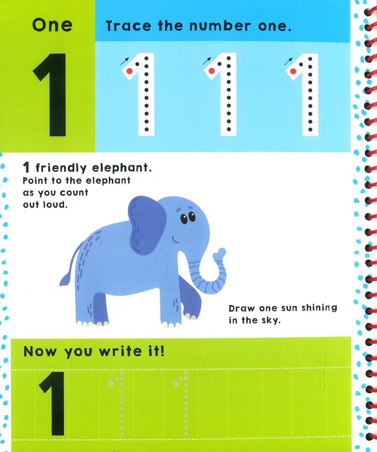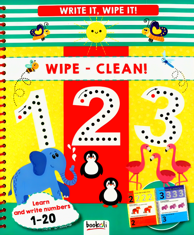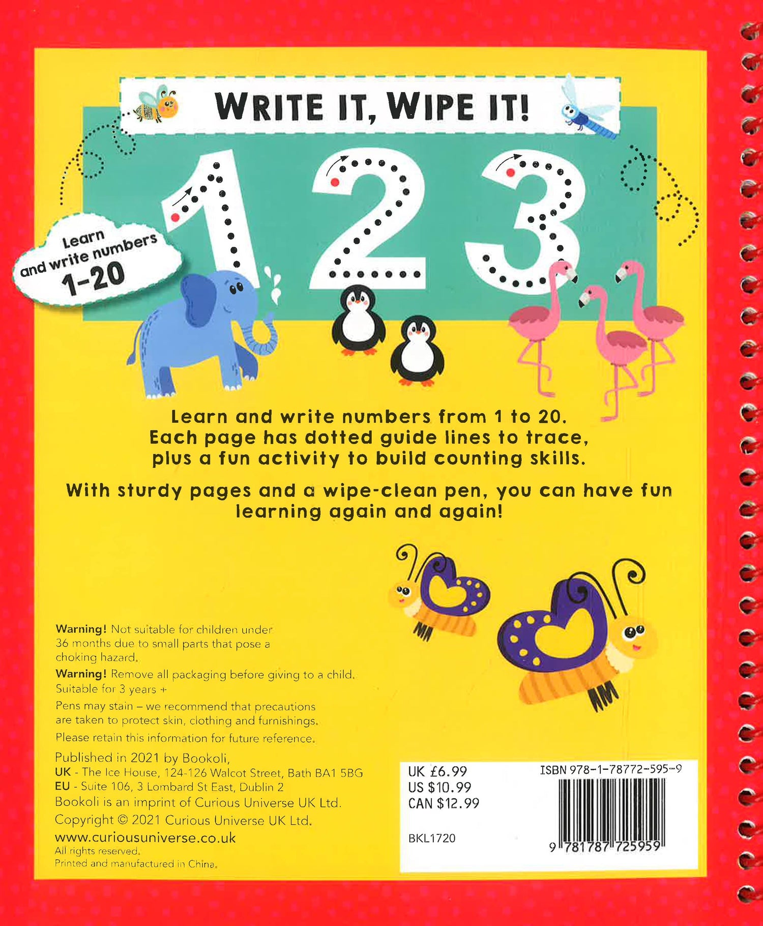 Learn and write numbers from 1 to 20. Each page has dotted guide lines to trace, plus a fun activity to build counting skills. With sturdy pages and a wipe-clean pen, you can have fun learning again and again!