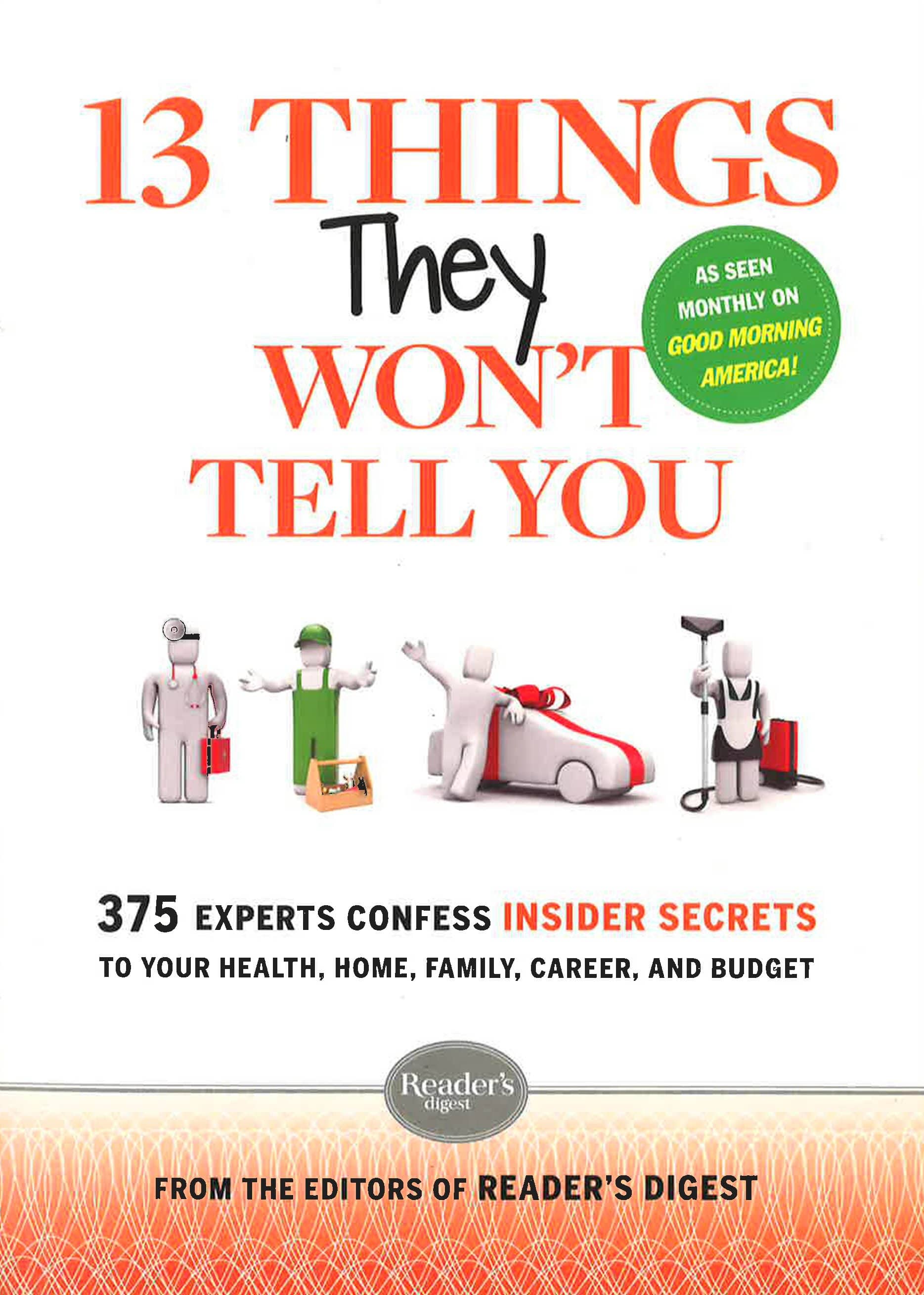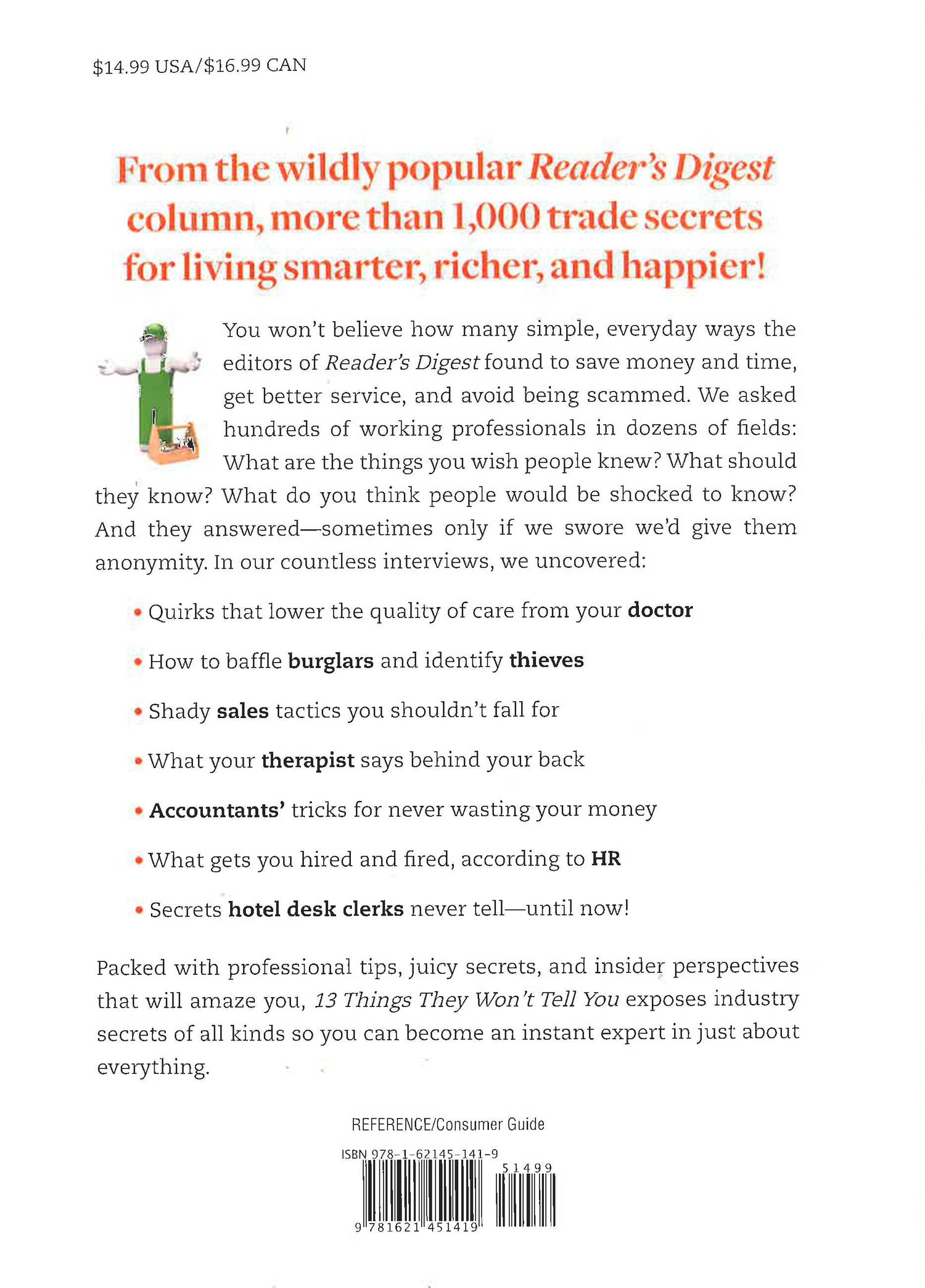 From the widely popular Reader's Digest column more than 1,000 trade secrets, professional tips, juicy secrets, and insider perspectives to save money and time, get better service, and avoid being scammed. Every month, Reader's Digest asks selected experts from a different profession to spill their secrets. Readers walk a mile in their shoes and see things that are enlightening, horrifying, and give them a whole new perspective on the people they trust with their food, health, family, money, and home. They walk away with the keys to awesome backdoor deals, insider knowledge that saves them tons of money, and invaluable advice for getting better service anywhere they go. Now, for the first time ever, this wisdom has been collected into one comprehensive volume, complete with updates, all new interviews, and tons of additional secrets that have never appeared before. The result is more than 1,300 eye-opening tips on everything from sweet-talking a car salesman to getting free drinks from the bartender to making sure you get the right medication from your pharmacist. You will learn the best ways to care for YOUR HOME, from real estate agents, contractors, plumbers, and even burglars. From the butcher, to the grocer to the pizza delivery guy, find out how to make sure YOUR FOOD is fresh (never gross) and high quality at low prices. Make sure YOUR HEALTH gets the attention it deserves with advice from all corners of the medical world--from the dentist, to the ER, to the gym, and far beyond. Teachers, nannies, marriage counselors, wedding planners and even mall Santas tell you how to help YOUR FAMILY get the best things in life and never fall into the clutches of swindlers. Make sure YOUR MONEY is safe and working hard with advice from bankers, sales clerks, identity thieves, and accountants' strategies to increase what you have, while avoiding wallet-sucking scams. In 13 Things They Won't Tell You, America's Most Trusted Magazine gives the advice Americans need most. It is the ultimate roadmap for making the most of the countless day-to-day interactions that that affect every piece of your life, from your budget to your happiness.