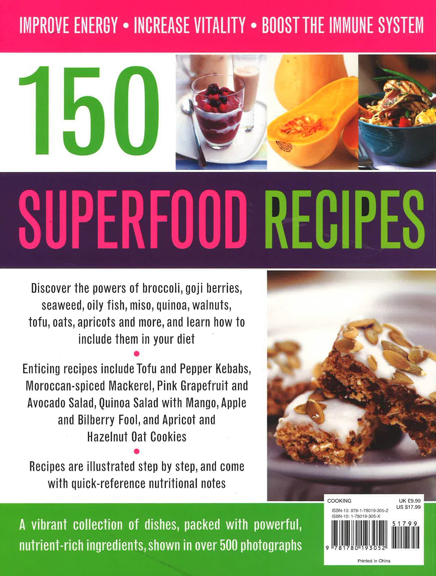 This is a vibrant collection of dishes, packed with powerful, nutrient-rich ingredients, shown in over 500 photographs. You can discover the powers of broccoli, goji berries, seaweed, oily fish, miso and many more, and the importance of including these and other foods in your diet. Enticing, easy-to-follow recipes include Tofu and Pepper Kebabs, Moroccan-spiced Mackerel, Pink Grapefruit and Avocado Salad, Quinoa Salad with Mango, Apple and Bilberry Fool, and Apricot and Hazelnut Oat Cookies. Recipes are illustrated step-by-step, and each is accompanied by quick-reference nutritional notes. Our dietary choices can impact on our energy levels, moods, libido, mental performance and overall well-being. Certain foods - ranging from the humble carrot to the more exotic wheatgrass, referred to as superfoods, are believed to offer specially health-promoting nutrients and properties, including iron, mineral, calcium, vitamin and flavonoid content. This book offers a spectrum of mouthwatering recipes, featuring at least one superfood in each. You can try home-made Granola, delicious Green Soya Bean Salad, Barley Risotto, Hemp and Nut Roast, Baked Apricot Compote, and Berry Smoothies for noticeably increased energy levels and enhanced health benefits.