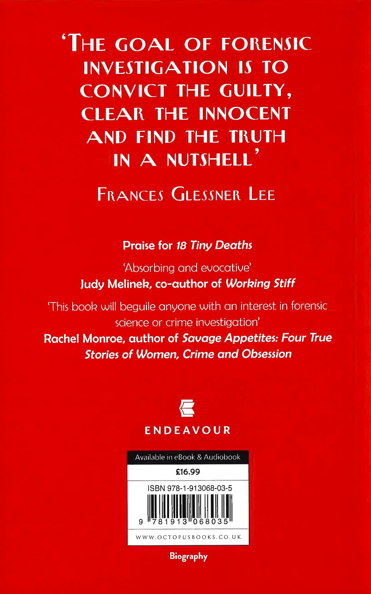 For most of human history, sudden and unexpected deaths of a suspicious nature, when they were investigated at all, were examined by lay persons without any formal training. People often got away with murder. Modern forensic investigation originates with Frances Glessner Lee - a pivotal figure in police science.'Disturbing dioramas created by an American millionairess revolutionised the art of modern forensics.' DAILY TELEGRAPH Frances Glessner Lee (1878-1962), born a socialite to a wealthy and influential Chicago family, was never meant to have a career, let alone one steeped in death and depravity. Yet she became the mother of modern forensics and was instrumental in elevating homicide investigation to a scientific discipline. Frances Glessner Lee learned forensic science under the tutelage of pioneering medical examiner Magrath - he told her about his cases, gave her access to the autopsy room to observe post-mortems and taught her about poisons and patterns of injury. A voracious reader too, Lee acquired and read books on criminology and forensic science - eventually establishing the largest library of legal medicine. Lee went on to create The Nutshell Studies of Unexplained Death - a series of dollhouse-sized crime scene dioramas depicting the facts of actual cases in exquisitely detailed miniature - and perhaps the thing she is most famous for. Celebrated by artists, miniaturists and scientists, the Nutshell Studies are a singularly unusual collection. They were first used as a teaching tool in homicide seminars at Harvard Medical School in the 1930s, and then in 1945 the homicide seminar for police detectives that is the longest-running and still the highest-regarded training of its kind in America. Both of which were established by the pioneering Lee.In 18 Tiny Deaths, Bruce Goldfarb weaves Lee's remarkable story with the advances in forensics made in her lifetime to tell the tale of the birth of modern forensics.