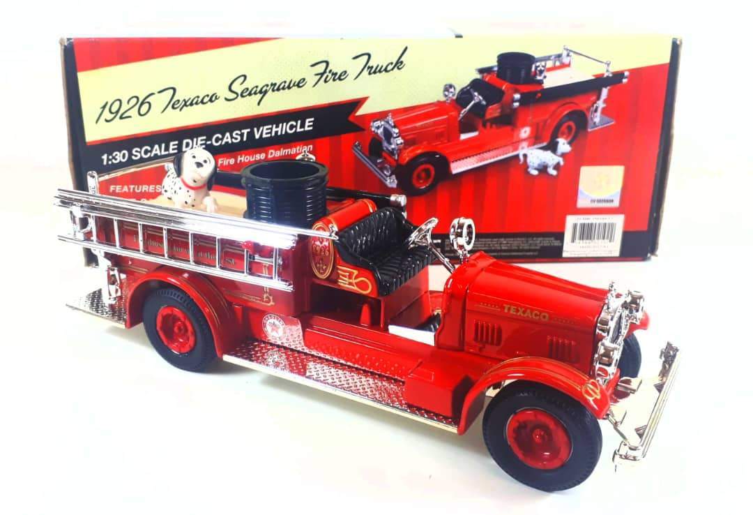 Founded in Beaumont, Texas, in 1901 as the Texas Fuel Company, Texaco became, in 1928, the first U.S. oil company to sell its gasoline nationwide under a single brand name. The second release in a new series of six Texaco vehicles, this limited edition, die cast metal model of a 1926 Seagrave Fire Truck features textured surfaces, a detailed driver's compartment, simulated chrome parts, realistically treaded tires, authentic badging and Texaco markings, a coin slot and a key, a fire house Dalmatian figure, and more. Includes a certificate of authenticity. 8" long; arrives ready to display. Note: As item is limited edition collection, the box may have minor scratches and faded colours.