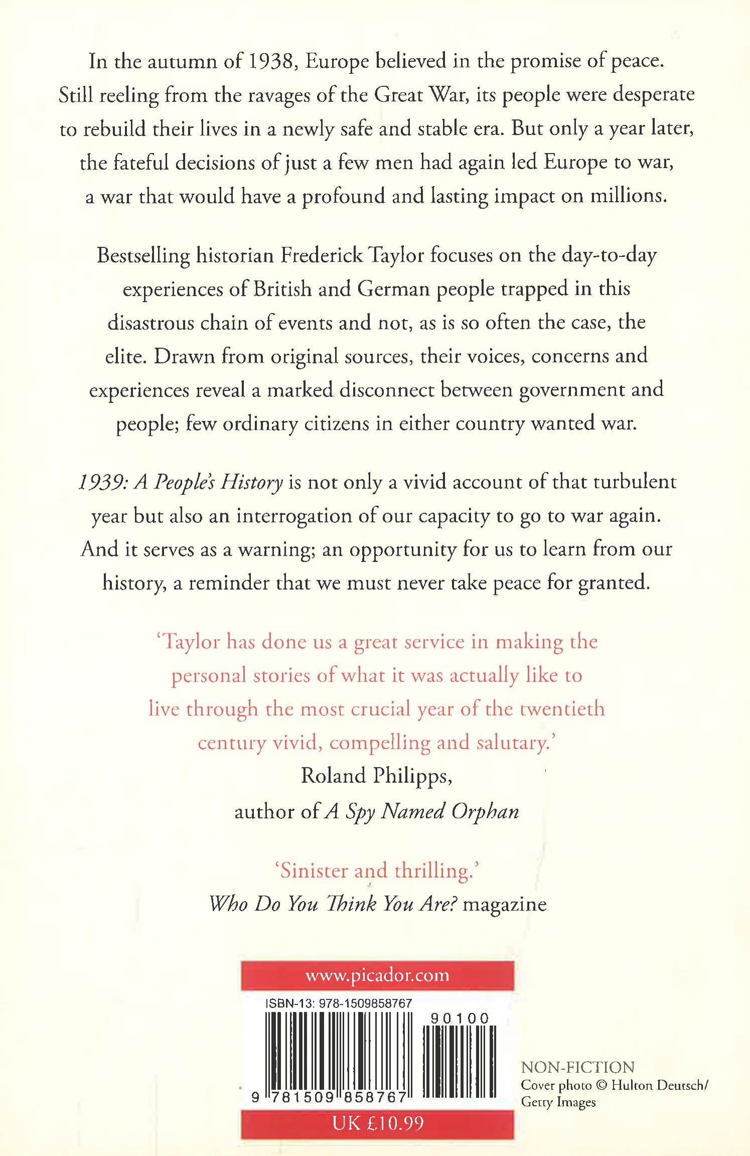 Bestselling historian Frederick Taylor focuses on the day-to-day experiences of British and German people trapped in this disastrous chain of events and not, as is so often the case, the elite. Drawn from original sources, their voices, concerns and experiences reveal a marked disconnect between government and people; few ordinary citizens in either country wanted war.